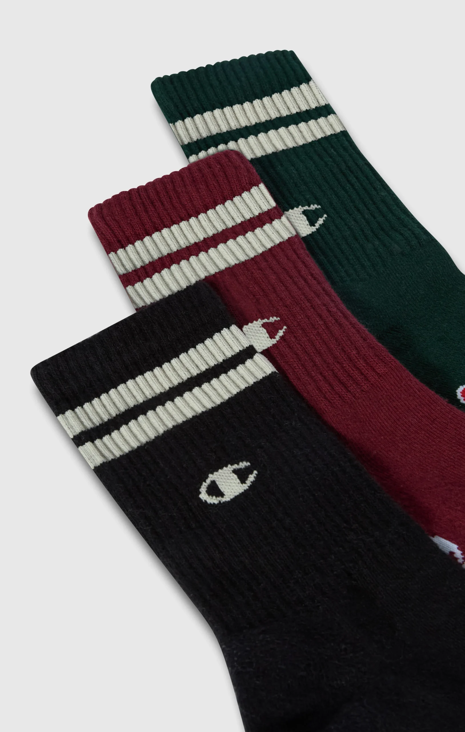3-pack of mid-cut socks, each featuring a different Champion logo style. A versatile set that blends comfort and visual identity—perfect to complete any outfit with an iconic touch.@@@Fabric: Stretch knit |Composition: 70% Cotton, 27% Polyester, 3% Elastane |Pack of 3 pairs |Crew height |Champion logo in different styles |Ribbed shaft