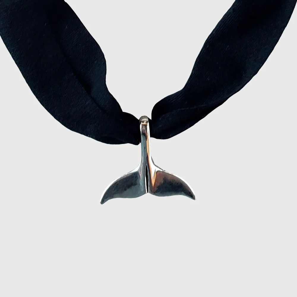 Colgante de tela negra de 38 cm de largo con cadena de alargue ajustable con amuleto colgante de fantasía. Colore negro, terminaciones metálicas plateadas, dije cola de ballena