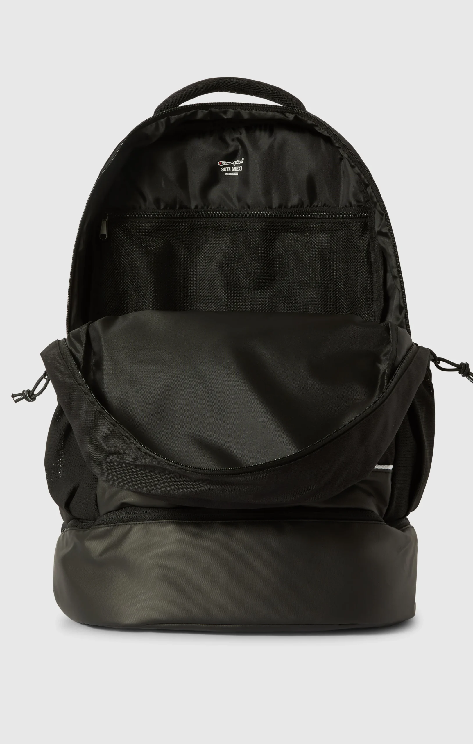 This backpack is designed to offer practical space management for everyday use and commuting. Made from recycled polyester fabric with a water-repellent treatment, it features a spacious and durable structure. The design with a separate bottom compartment allows better organization of contents, while maintaining a clean and functional style in line with Champion’s sportswear DNA.@@@Recycled polyester fabric |Composition: 100% Polyester |Weight: 230 g/m² |Water-repellent treatment |Dimensions: W 34 cm x H 53 cm x D 23.5 cm |Spacious structure |Separate bottom compartment |Functional design |Champion logo printed on the front