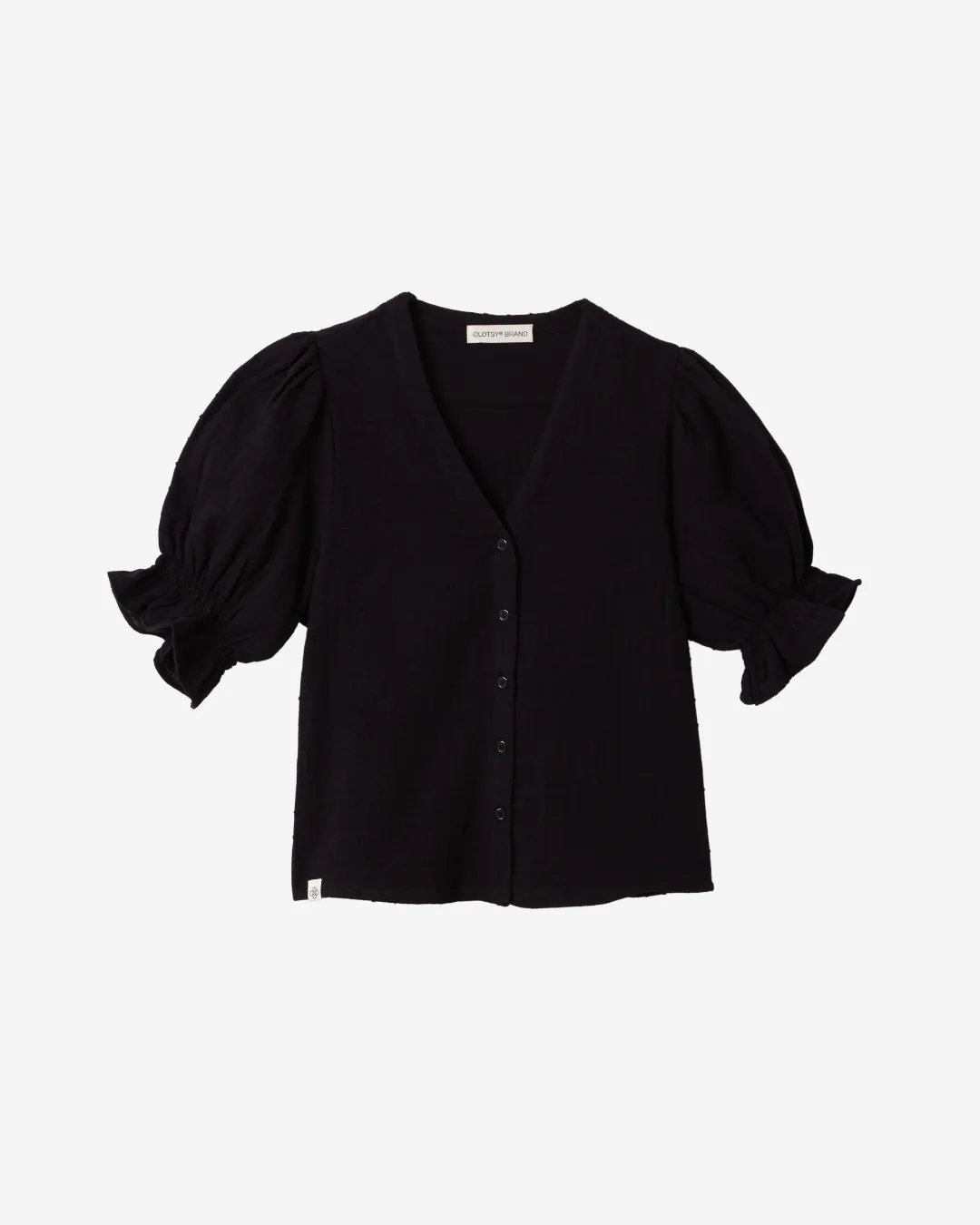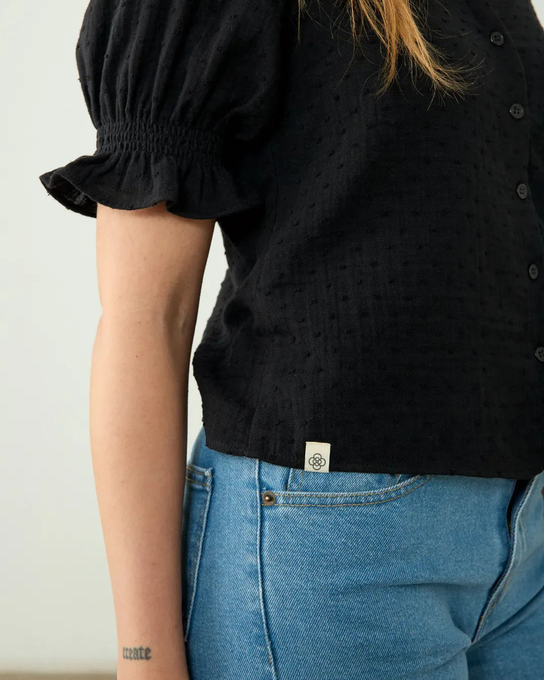 Blusa de manga corta abullonada en color negro, confeccionada en muselina plumeti de algodón 100% orgánico, en un taller familiar de Madrid.