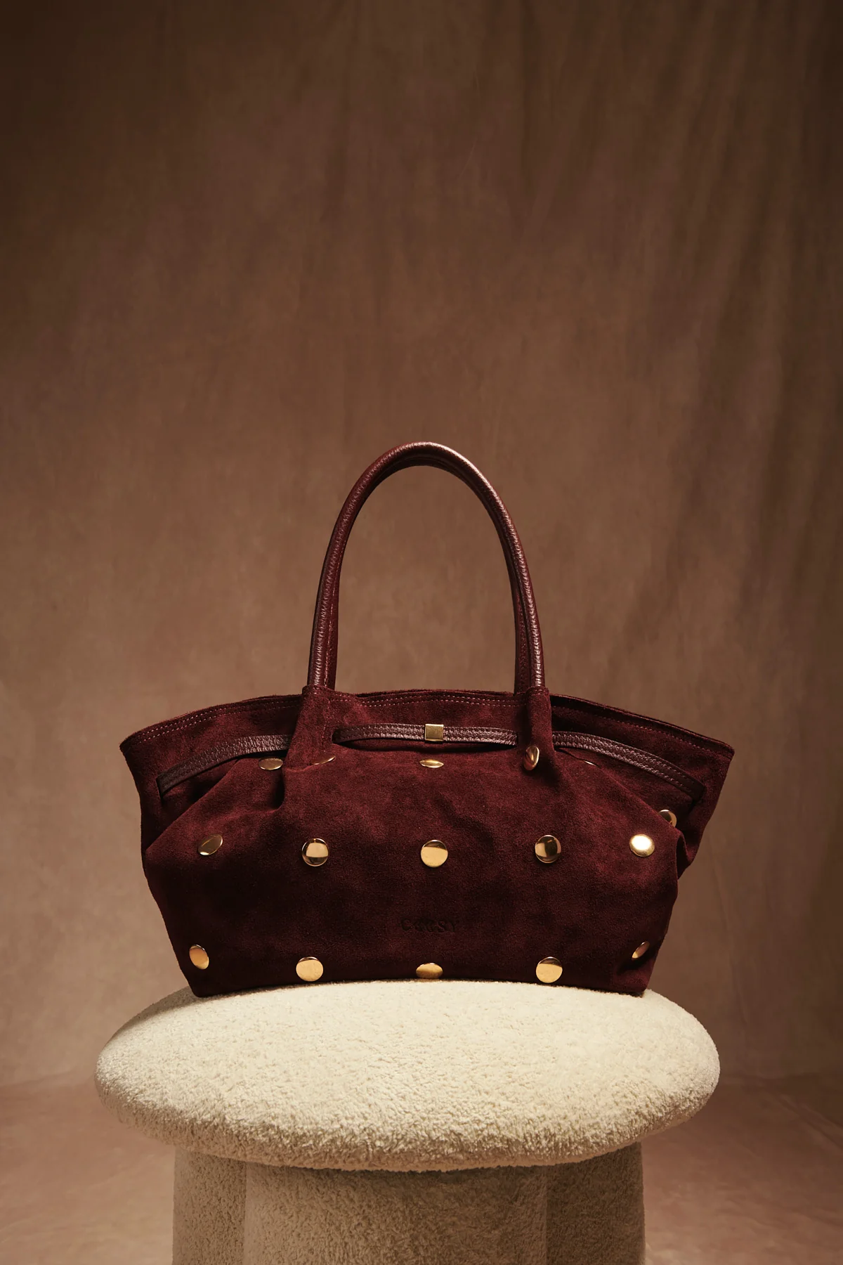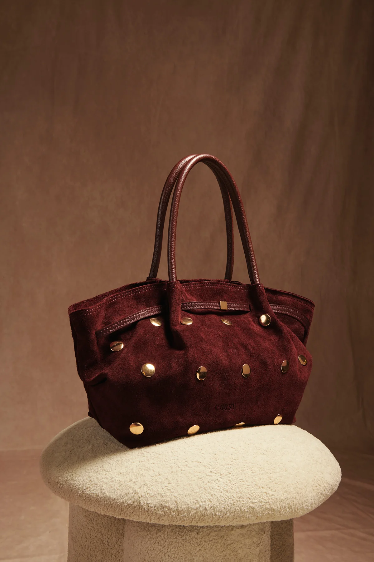 Este bolso burdeos para mujer combina diseño y funcionalidad en una pieza sofisticada y atemporal. Confeccionado en piel de alta calidad, destaca por su acabado elegante y por el detalle de tachuelas metálicas doradas, que aportan carácter y un punto moderno sin perder refinamiento.