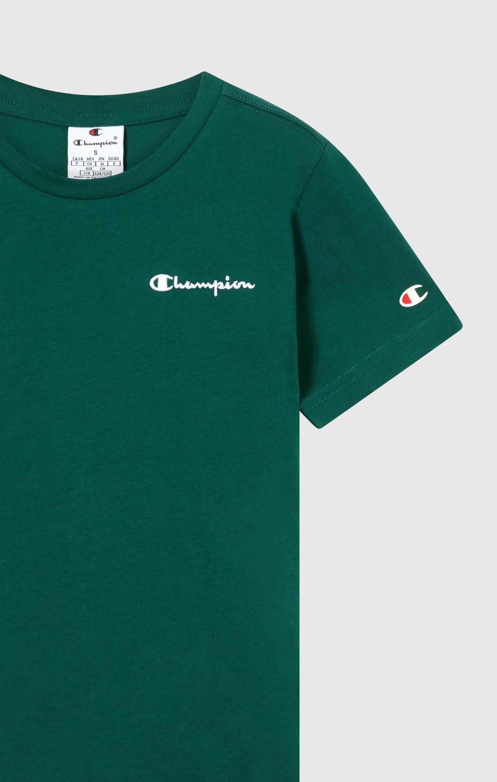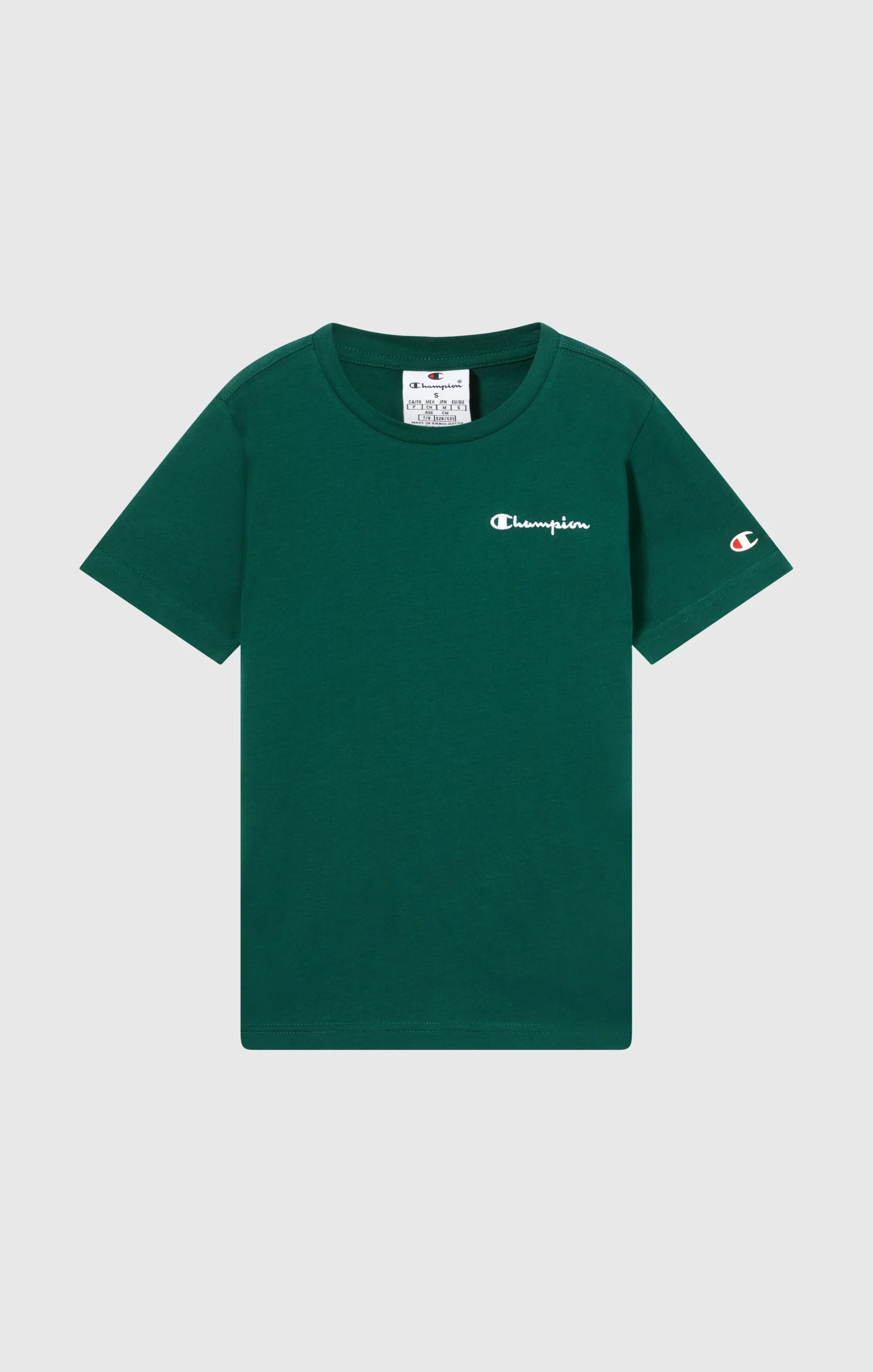 Essential everyday t-shirt made from lightweight cotton jersey, soft on the skin and perfect worn alone or under a sweatshirt. Features an embroidered Champion logo for an authentic heritage-inspired look.@@@Fabric: Lightweight cotton jersey 150 g/m² |Composition: 100% Cotton |Champion logo embroidered on chest |Ribbed crew neck |Fit: Standard Fit – versatile and comfortable with standard widths and lengths. Close to the body with simple lines that don’t cling. Regular shoulder cut.