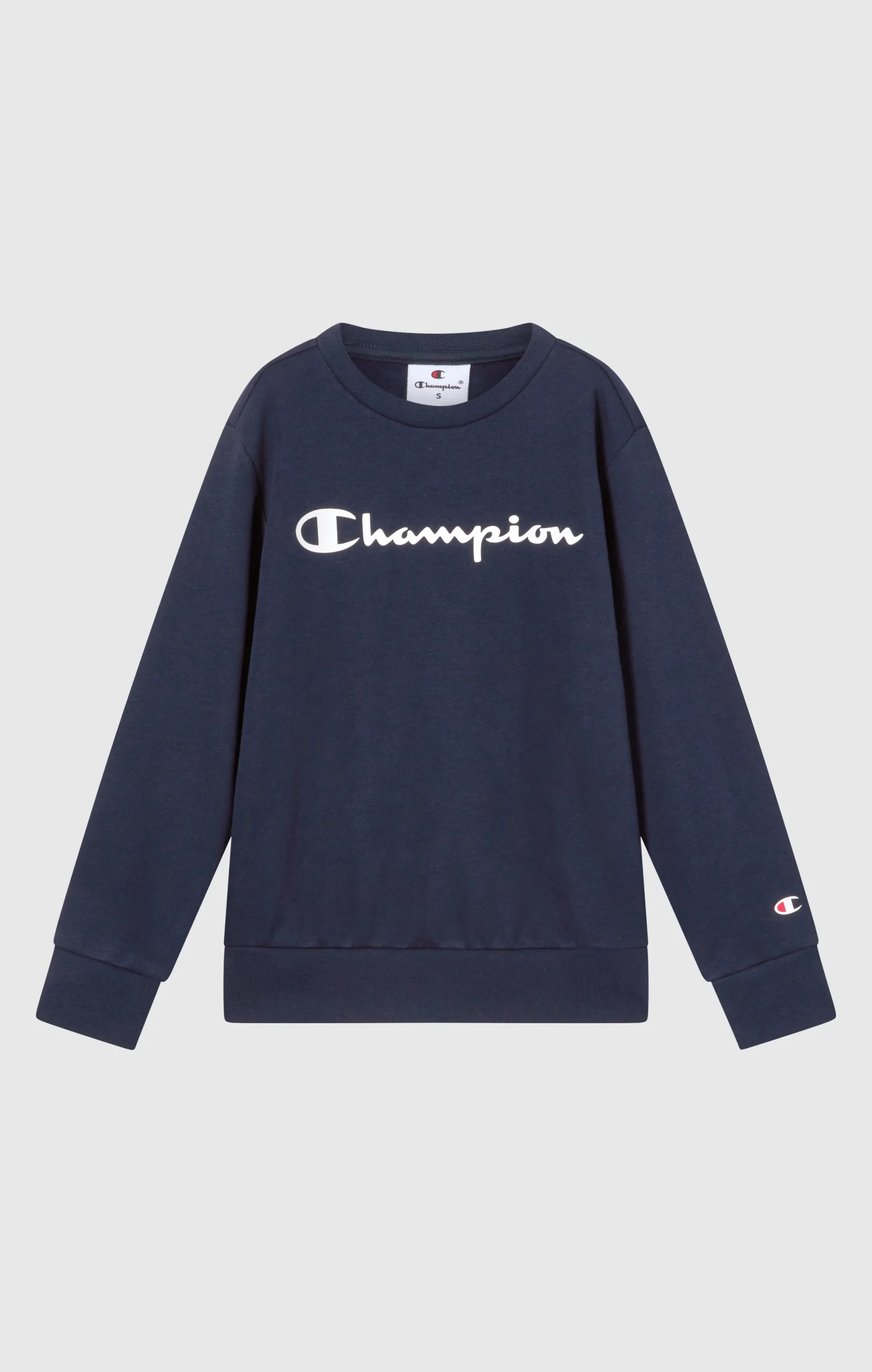 This Boys’ crewneck sweatshirt with a script Champion logo combines simplicity and everyday comfort. Made from compact Fleece with a brushed lining, it offers lightweight warmth and a comfortable fit. Perfect for school, play or paired with matching joggers.@@@Fabric: Soft and compact cotton-blend fleece, 240 g/m² |Composition: 55% Cotton 45% Polyester |Brushed interior |Fit: Standard Fit: versatile and comfortable fit with standard widths and lengths. Close to the body, with simple lines that do not cling to the figure. Regular shoulder cut.