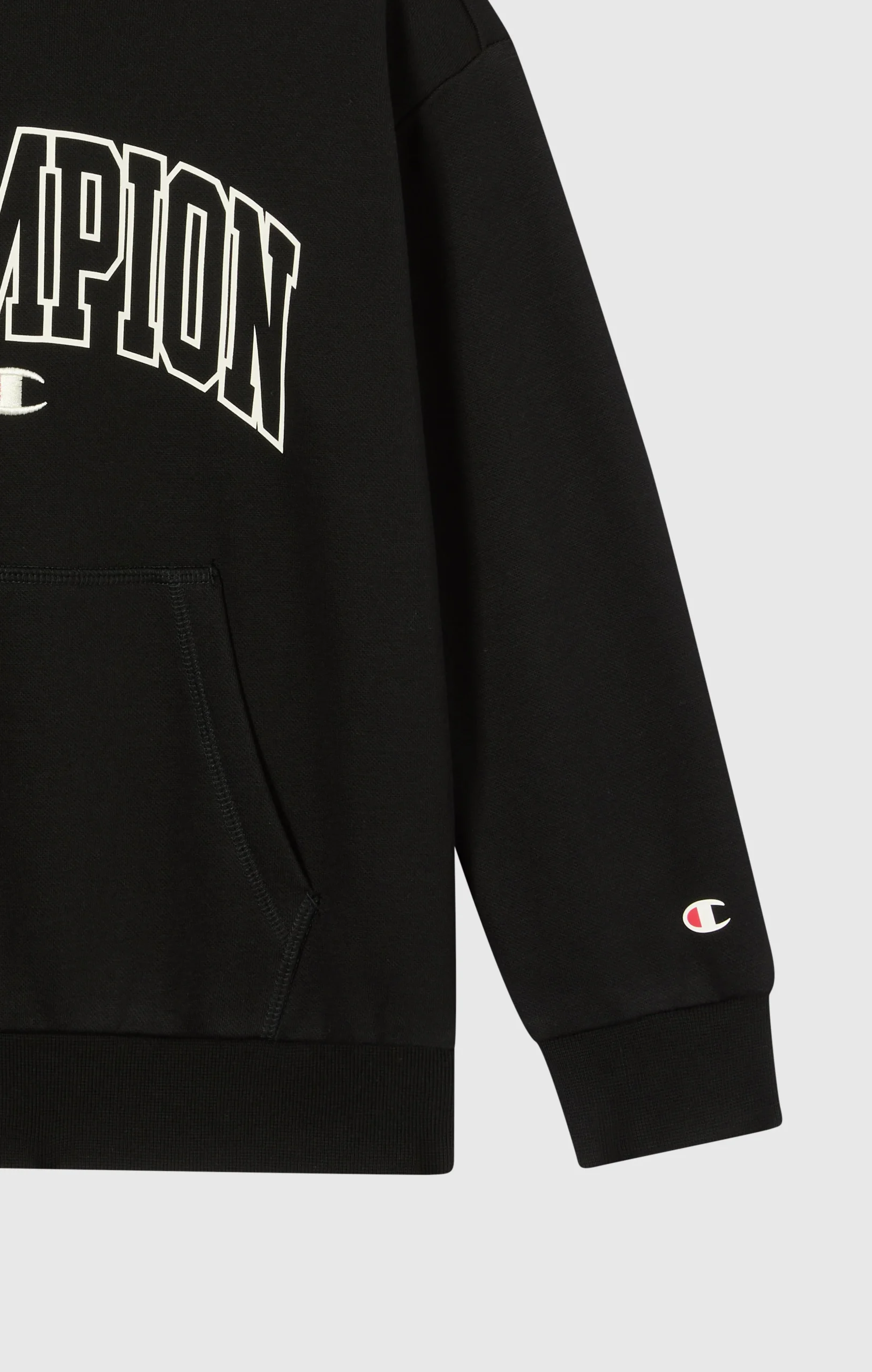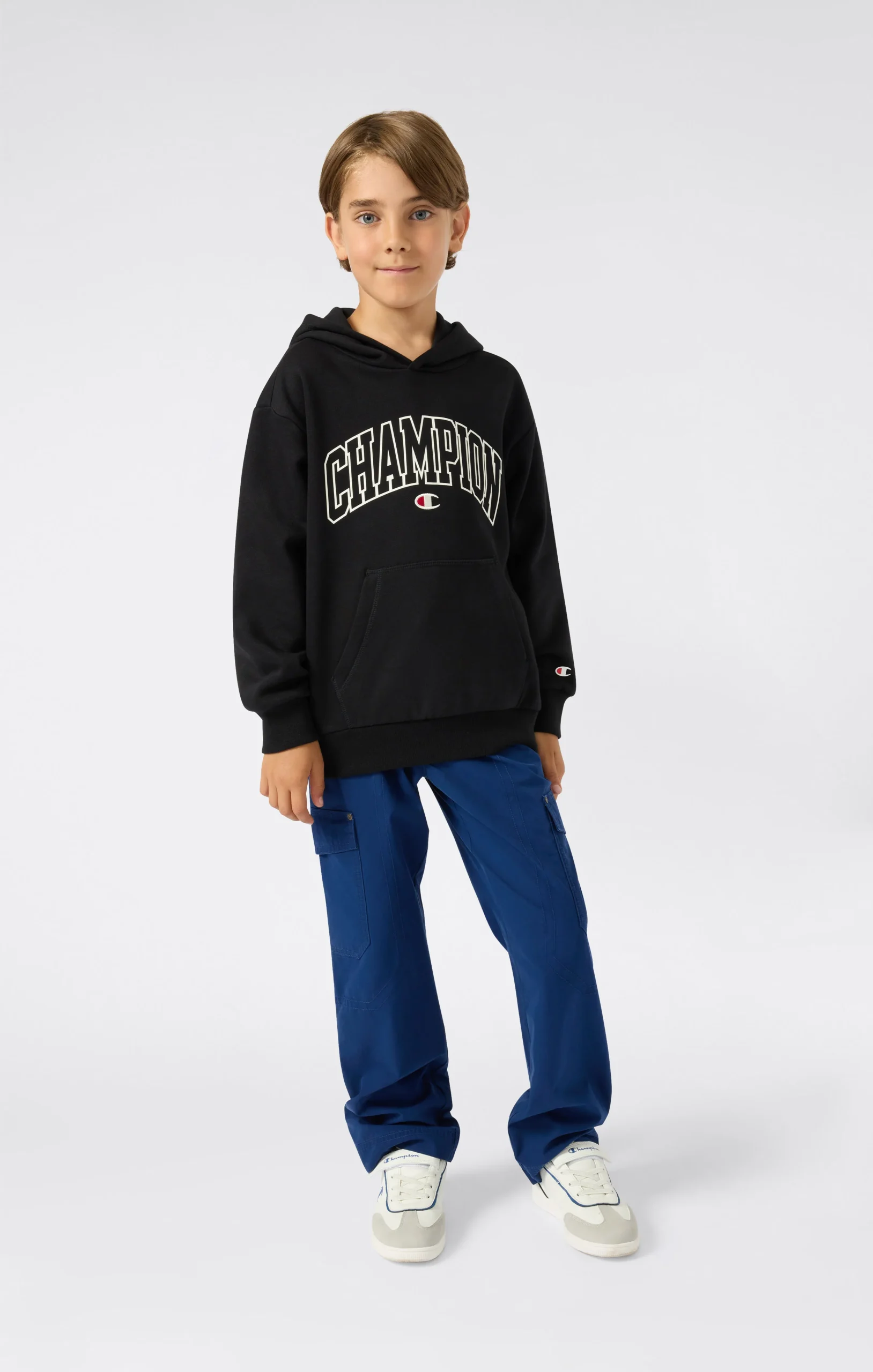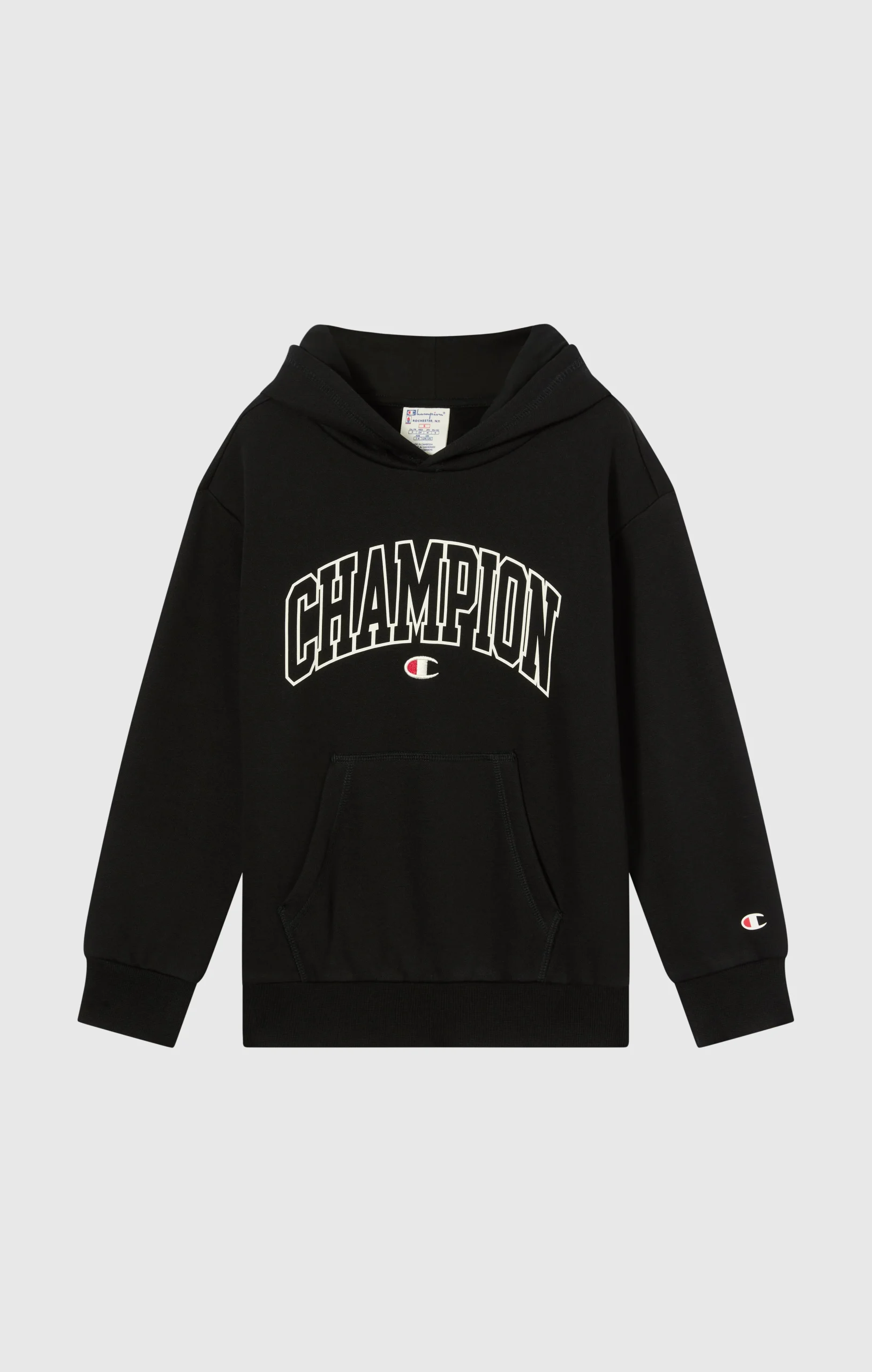 This Boys’ hoodie blends sporty style with comfort. Made of 280 g/m² fleece with brushed interior, it’s warm yet lightweight. The bold Champion graphic on the chest draws inspiration from college style, for a cool, up-to-date look.@@@Fabric: Compact cotton-blend fleece, 280 g/m² |Composition: 70% Cotton 30% Polyester |Brushed interior |Front pockets |Fit: Standard Fit: versatile and comfortable fit with standard widths and lengths. Close to the body, with clean lines that do not cling. Regular shoulder cut.