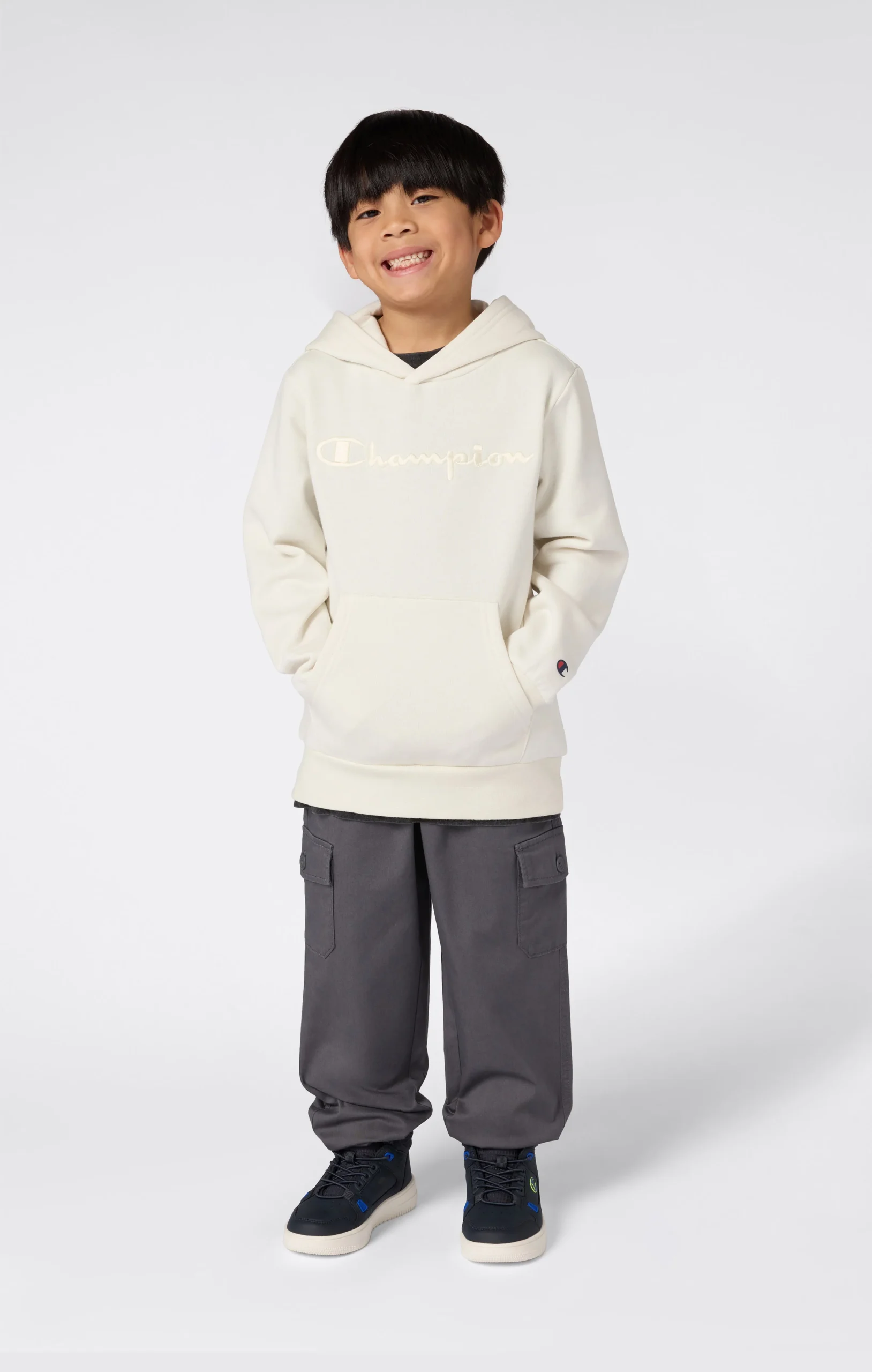 Lightweight fleece hoodie with brushed interior, perfect for transitional seasons. Features a tone-on-tone embroidered Champion logo on the chest and a comfortable fit, ideal for school and casual wear.@@@Fabric: Compact and soft fleece in cotton blend 240 g/m² |Composition: 73% Cotton, 27% Polyester |Brushed interior for superior thermal comfort |Fixed hood |Front kangaroo pocket |Tone-on-tone embroidered Champion logo |Fit: Standard Fit – versatile and comfortable with standard widths and lengths. Close to the body with simple lines that don’t cling. Regular shoulder cut.