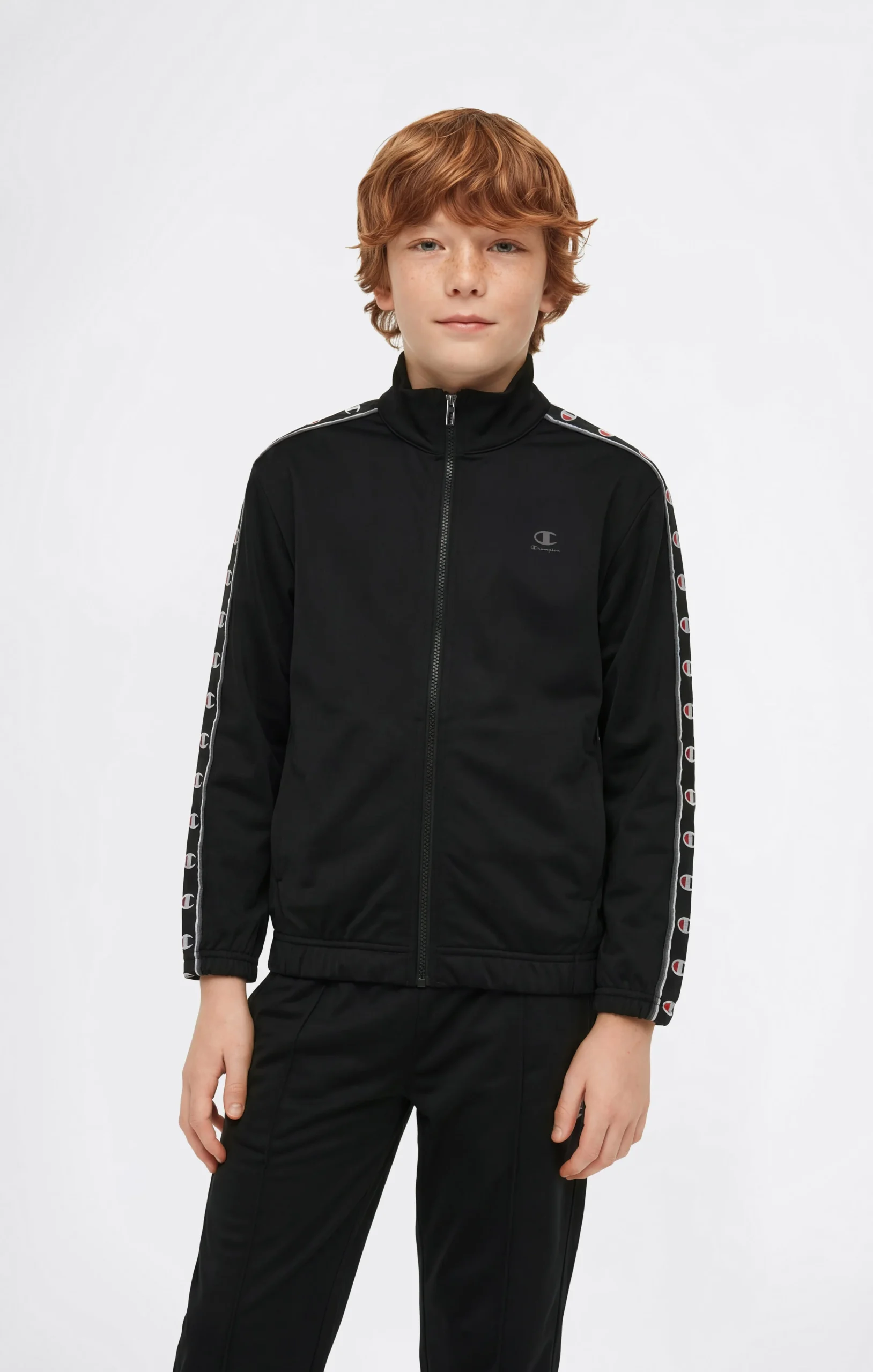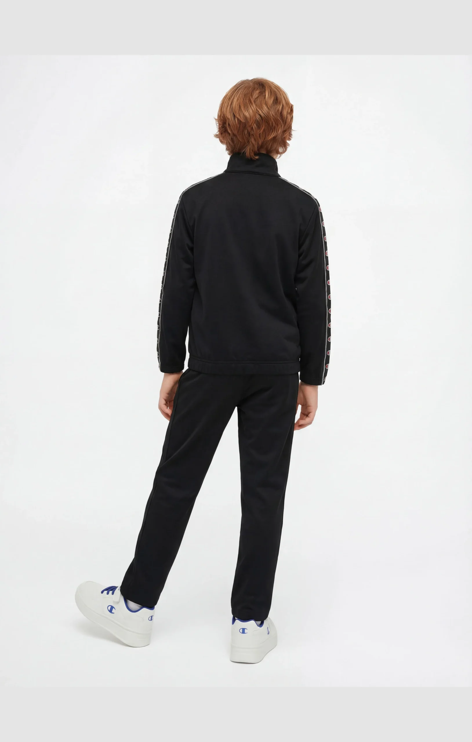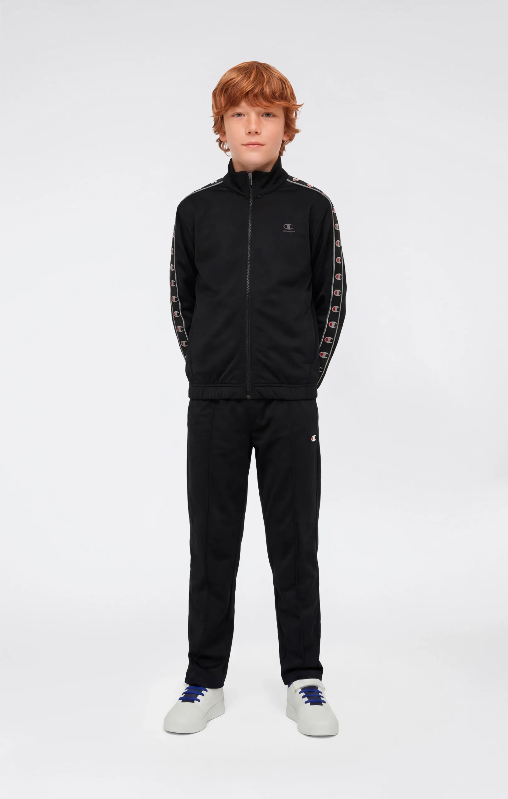 Boys’ tracksuit with an essential sportswear design, composed of a full zip sweatshirt and matching pants. Made from lightweight Poly Knit fabric with a non-brushed interior, it is designed to provide comfort and practicality for everyday wear. The design features Champion logo tape along the sleeves, recalling the brand’s iconic DNA, while the Relaxed Fit ensures freedom of movement and all-day comfort.@@@Relaxed Fit, soft and comfortable |Poly Knit fabric |Composition: 100% Polyester |Fabric weight: 200 g/m² |Non-brushed interior |Full zip sweatshirt |High collar |Champion logo tape along the sleeves |Elasticated waistband on pants |Side pockets on pants |Champion logo applied