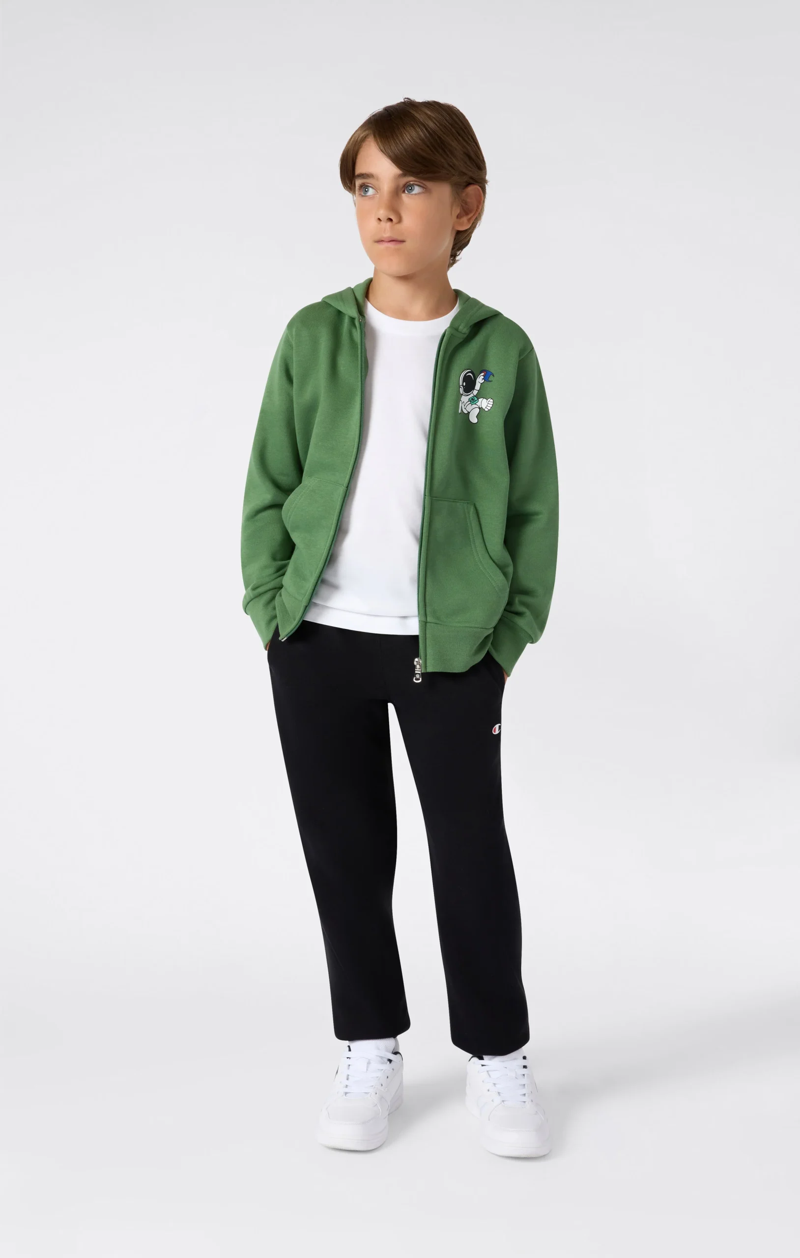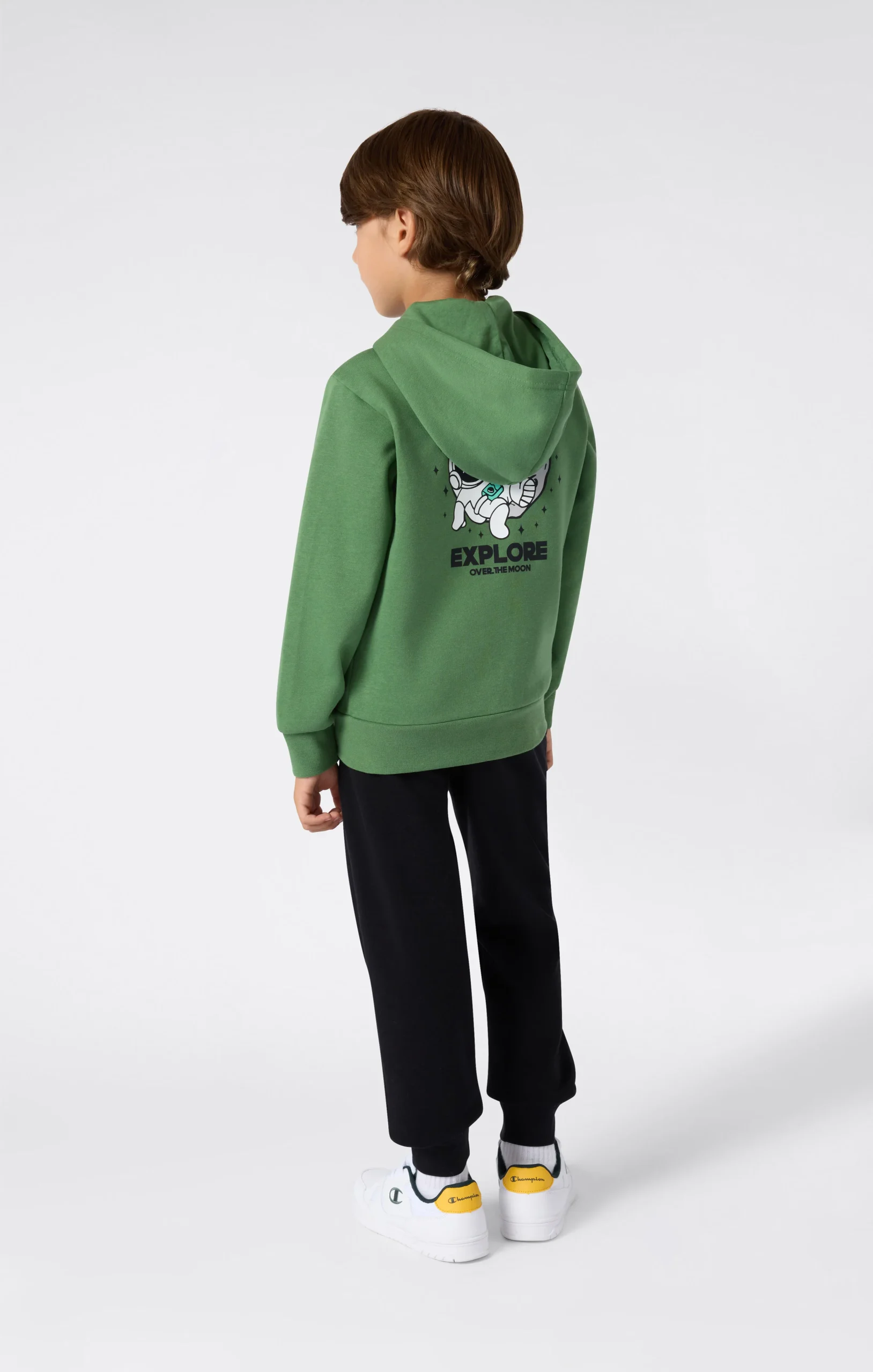 This hooded set is designed to accompany every moment of the day, from playtime to relaxation. Made from soft, lightweight brushed fabric, it ensures comfort and freedom of movement. The graphic on the back of the sweatshirt adds style and personality, while the elastic cuff pants provide a secure fit. A versatile set, perfect for little explorers.@@@Fabric: Compact and soft fleece in cotton blend, 240 g/m² |Composition: 54% Cotton, 46% Polyester |Brushed interior for superior thermal comfort |Printed graphic on the back |Pants with elastic waistband and drawstring |Ribbed cuffs and hem |Fit: Standard Fit – versatile and comfortable with standard widths and lengths. Close to the body with simple lines that don’t cling. Regular shoulder cut.