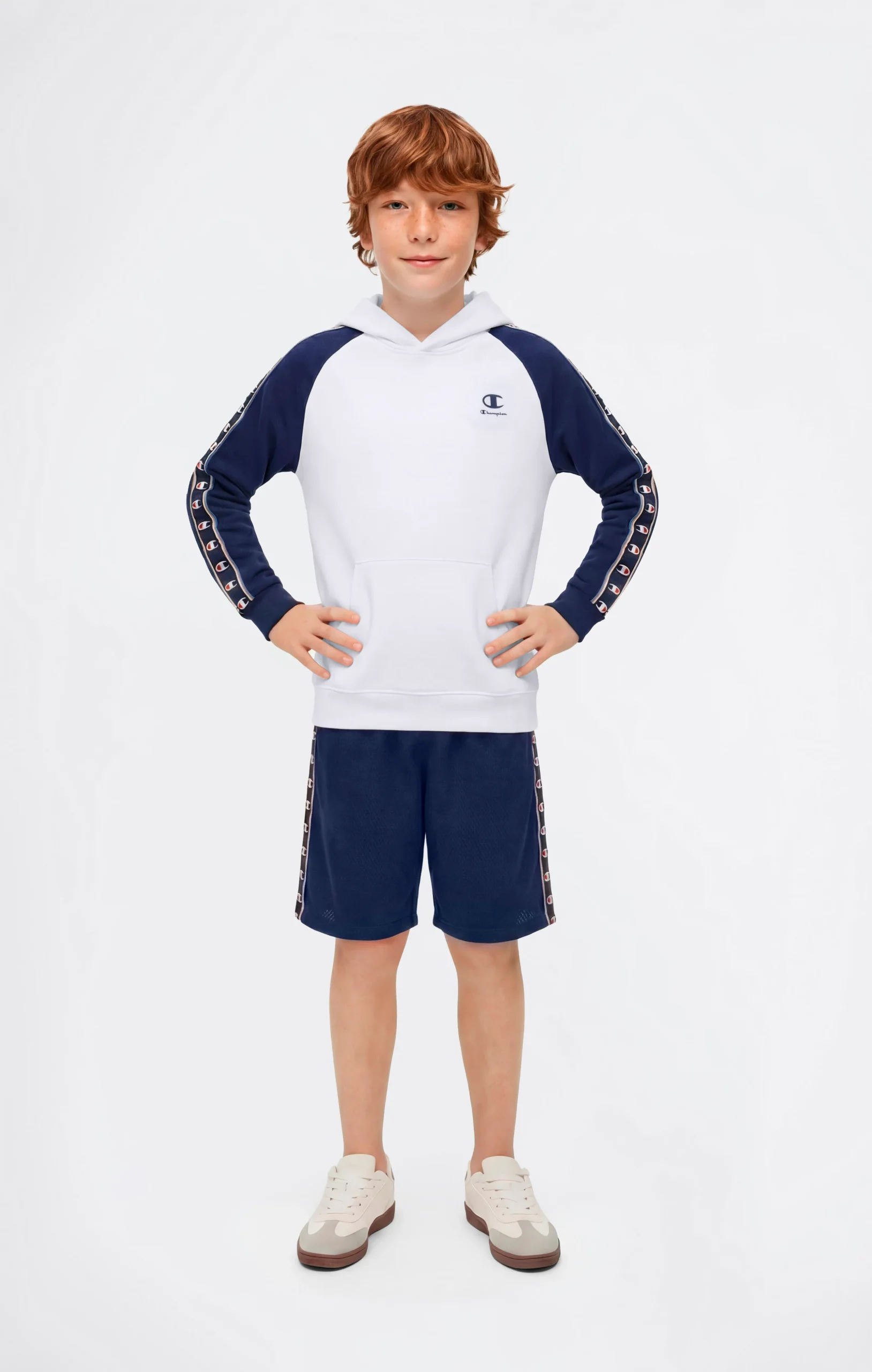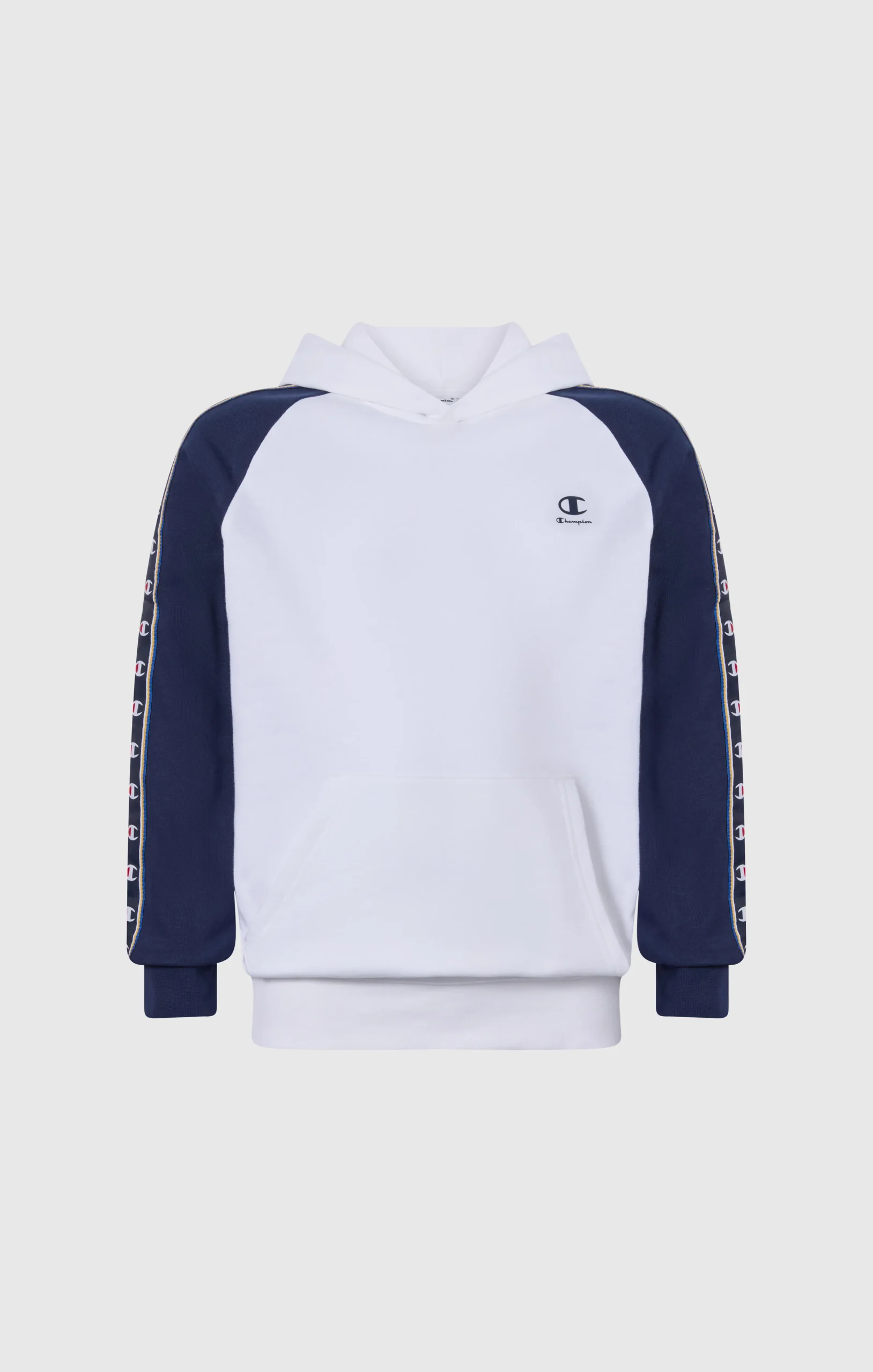 This boys’ C-Sport hooded sweatshirt draws inspiration from 1990s sportswear aesthetics, reinterpreted through the Champion heritage DNA. Made from lightweight cotton-blend terry fabric, it offers comfort and practicality for everyday wear. The Relax Fit provides ease of movement, while the raglan sleeve design and C-Logo tape along the sleeves reference the iconic C-Logo tape, a distinctive symbol of the line. A versatile piece designed for urban settings and leisure time.@@@Relax Fit, soft and slightly loose |Lightweight terry fabric |Composition: 73% Cotton, 27% Polyester |Fabric weight: 240 g/m² |Fixed hood |Long sleeves with raglan construction |C-Logo tape along the sleeves |Front kangaroo pocket