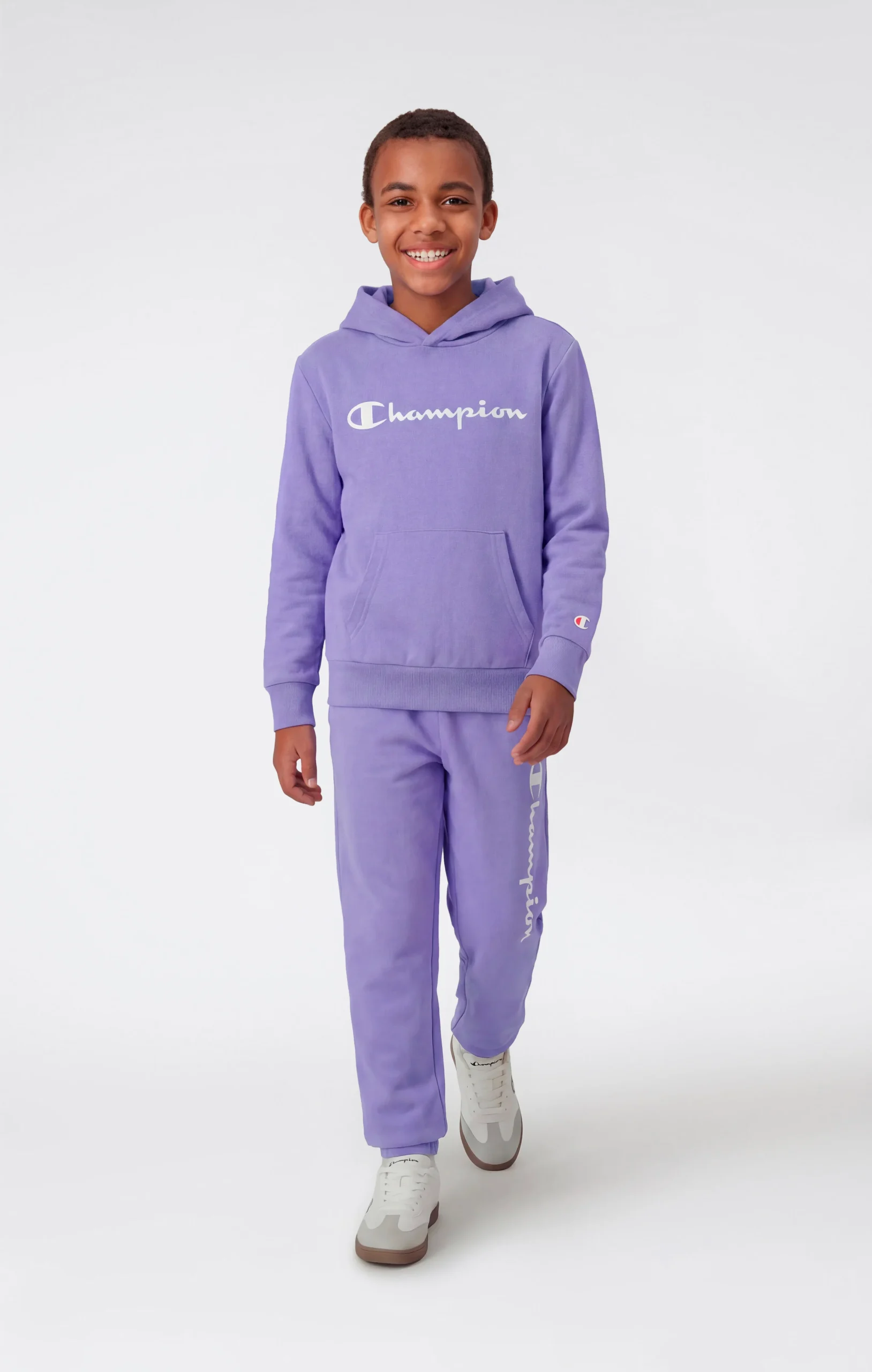 This boys’ hooded sweatshirt is part of Champion’s classics and is made from lightweight cotton-blend fleece designed for everyday comfort. The regular fit ensures an easy and comfortable feel, ideal for school, leisure time and daily activities. The clean design is defined by a large printed Champion logo on the chest, an iconic and instantly recognizable detail.@@@Fit: Standard Fit – comfortable, regular line |Fabric: Ultra Light Basic Terry, lightweight and compact fleece fabric |Composition: 55% Cotton, 45% Polyester |Weight: 240 g/m² |Details: hood and front kangaroo pocket |Logo: maxi printed Champion logo on the chest |Unbrushed interior
