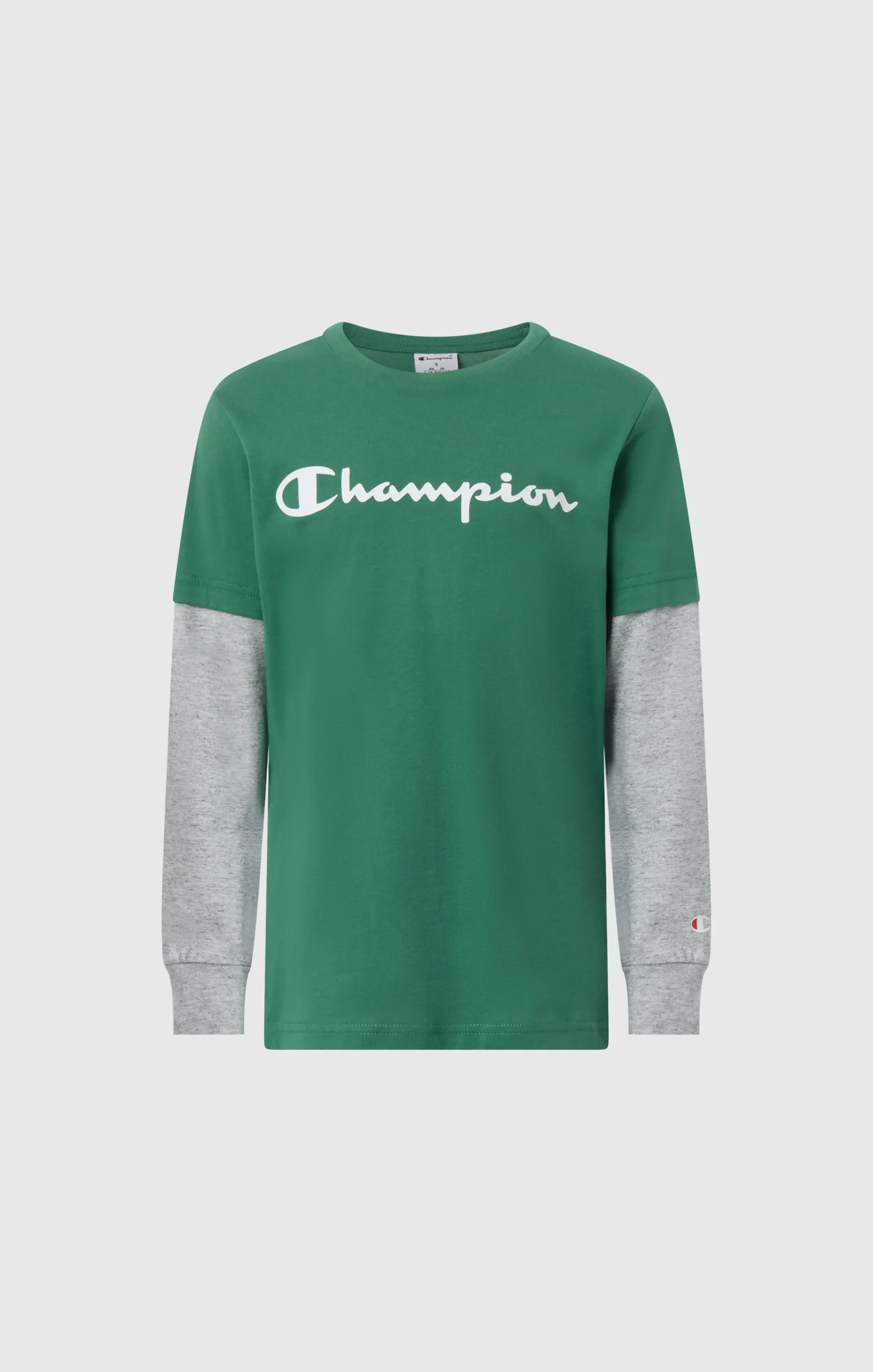 Perfect for mid-season wear, this Boys’ long-sleeve t-shirt in lightweight cotton jersey blends iconic style and everyday comfort. The script Champion logo on the chest and contrast sleeves add a sporty, modern touch. Standard fit designed for easy movement.@@@Fabric: Lightweight cotton jersey, 150 g/m² |Composition: 100% Cotton |Fit: Standard Fit: versatile and comfortable fit with standard widths and lengths. Close to the body, with simple lines that do not cling to the figure. Regular shoulder cut.