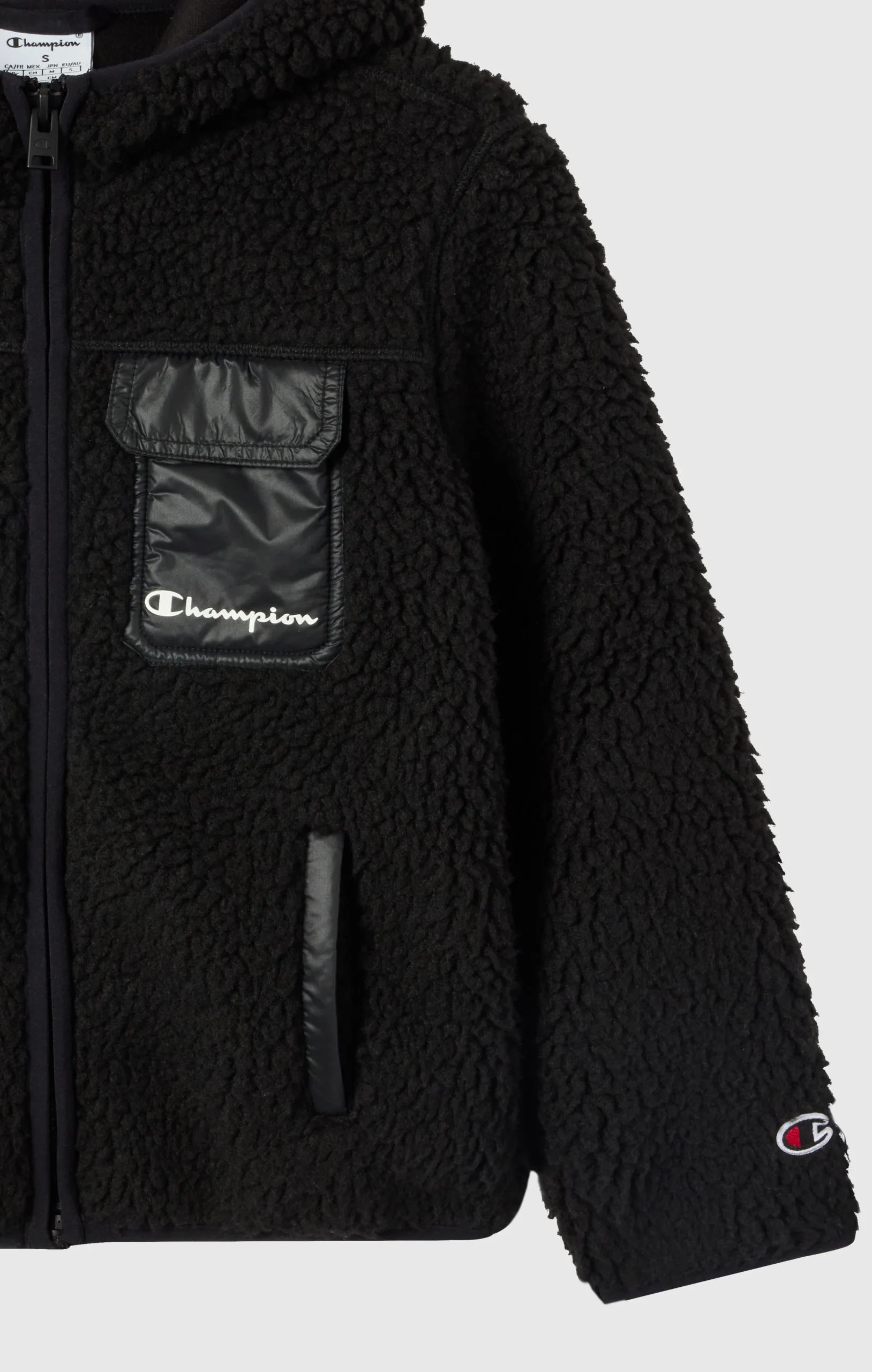 This fleece jacket with front pockets and full zip is perfect for tackling colder days with both style and comfort. The contrast between the polar fleece body and matte and shiny nylon details adds a distinctive touch to the design. The applied chest pocket with Champion logo completes the look with a functional accent.@@@Main fabric: Fabric: Teddy polar fleece, weight: 540 g/m² |Composition: 100% Polyester |Second fabric: Matte and shiny smooth nylon, weight: 35 g/m² |Composition: 100% Polyester |Fit: Regular Fit – comfortable cut with straight line, suitable for every body type