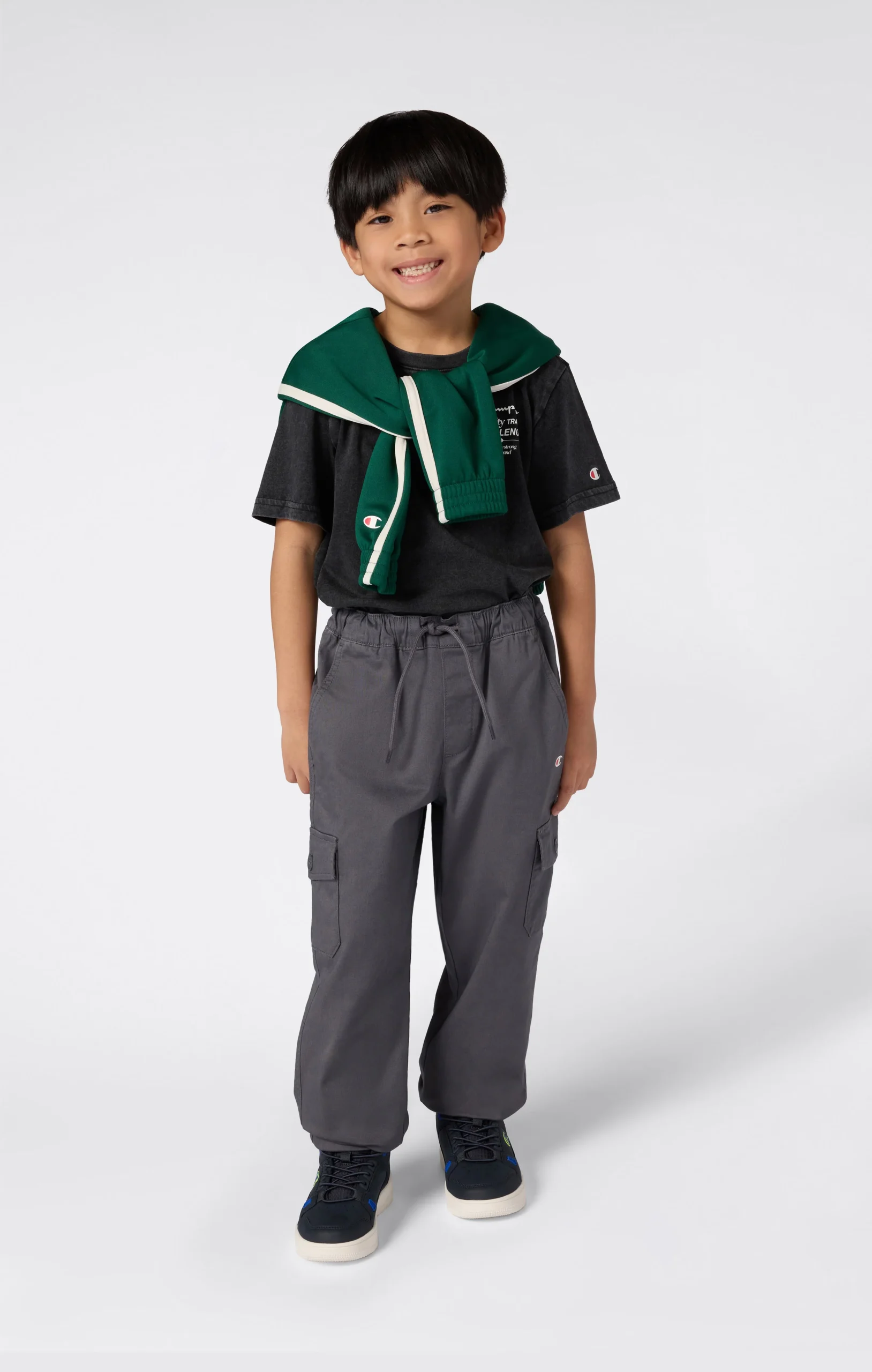 Stretch twill cargo pants designed for everyday wear by kids. Made from stretchy cotton fabric for comfort and freedom of movement, with ribbed cuffs and practical patch pockets. Ideal for school, playtime, and adventures.@@@Fabric: Stretch twill 230 g/m² |Composition: 98% Cotton, 2% Elastane |Side cargo pockets with flap and button |Elasticated waistband with drawstring |Elasticated leg cuffs |Fit: Standard Fit – soft and comfortable.