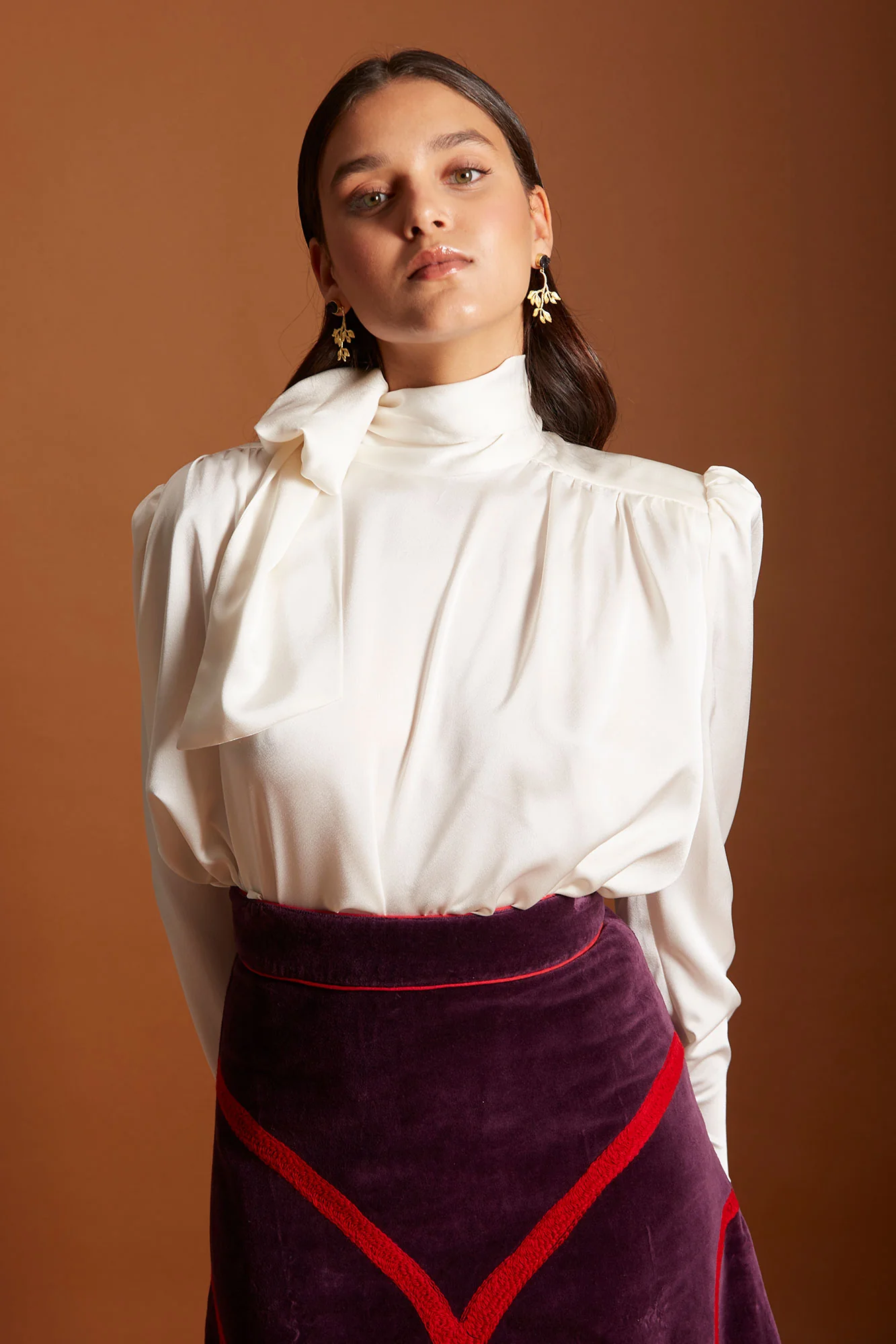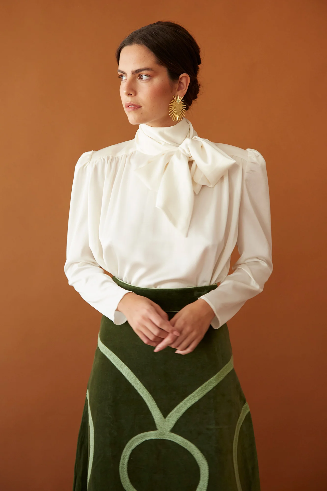 Esta camisa blanca de estilo romántico es una apuesta infalible para looks elegantes y sofisticados. Confeccionada en tejido fluido de alta calidad, destaca por su lazada al cuello tipo lazo y sus mangas abullonadas, que aportan volumen y un aire refinado. El diseño combina inspiración vintage con un corte actual, ideal para llevar con faldas midi o pantalones de tiro alto.