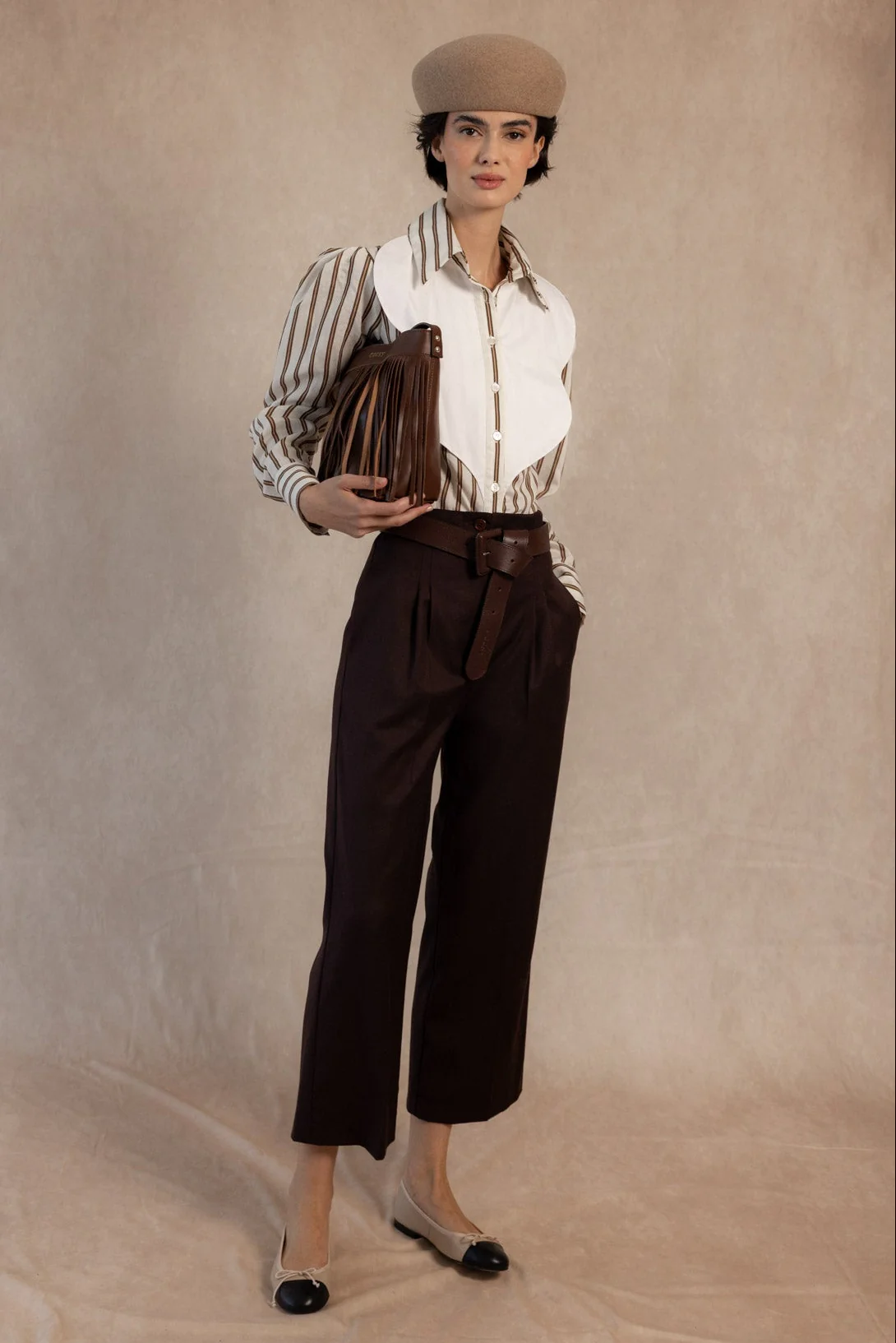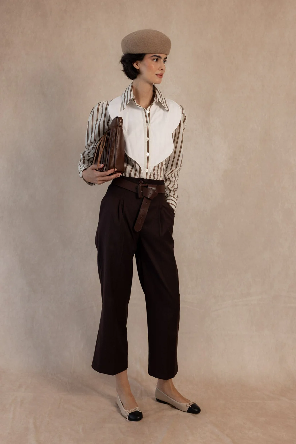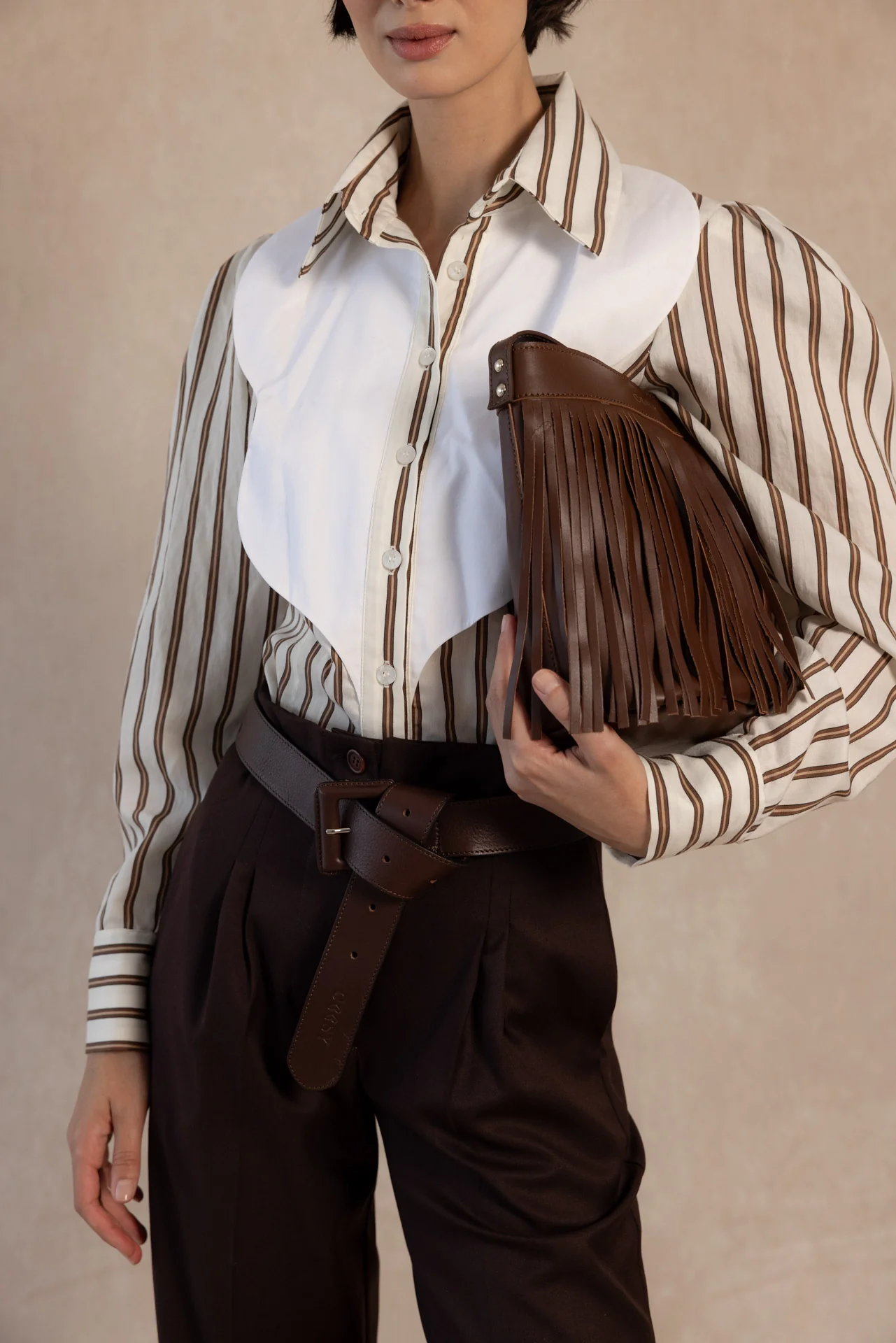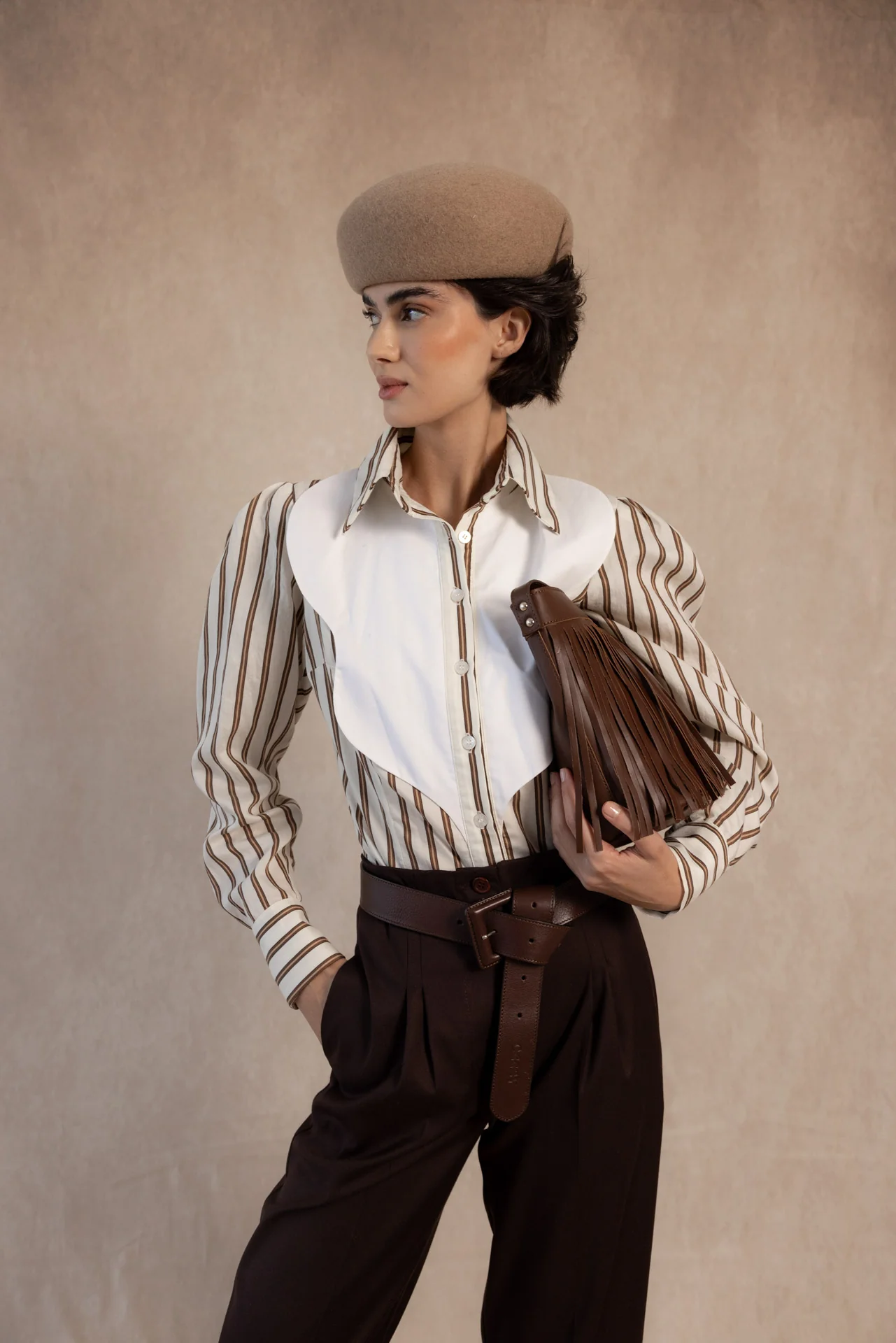 La camisa Brooke redefine la elegancia clásica con un toque moderno y sofisticado. Su diseño combina un tejido de rayas verticales en tonos tierra y crema con una pechera blanca estructurada, creando un contraste visual muy favorecedor que aporta luz y personalidad al look.