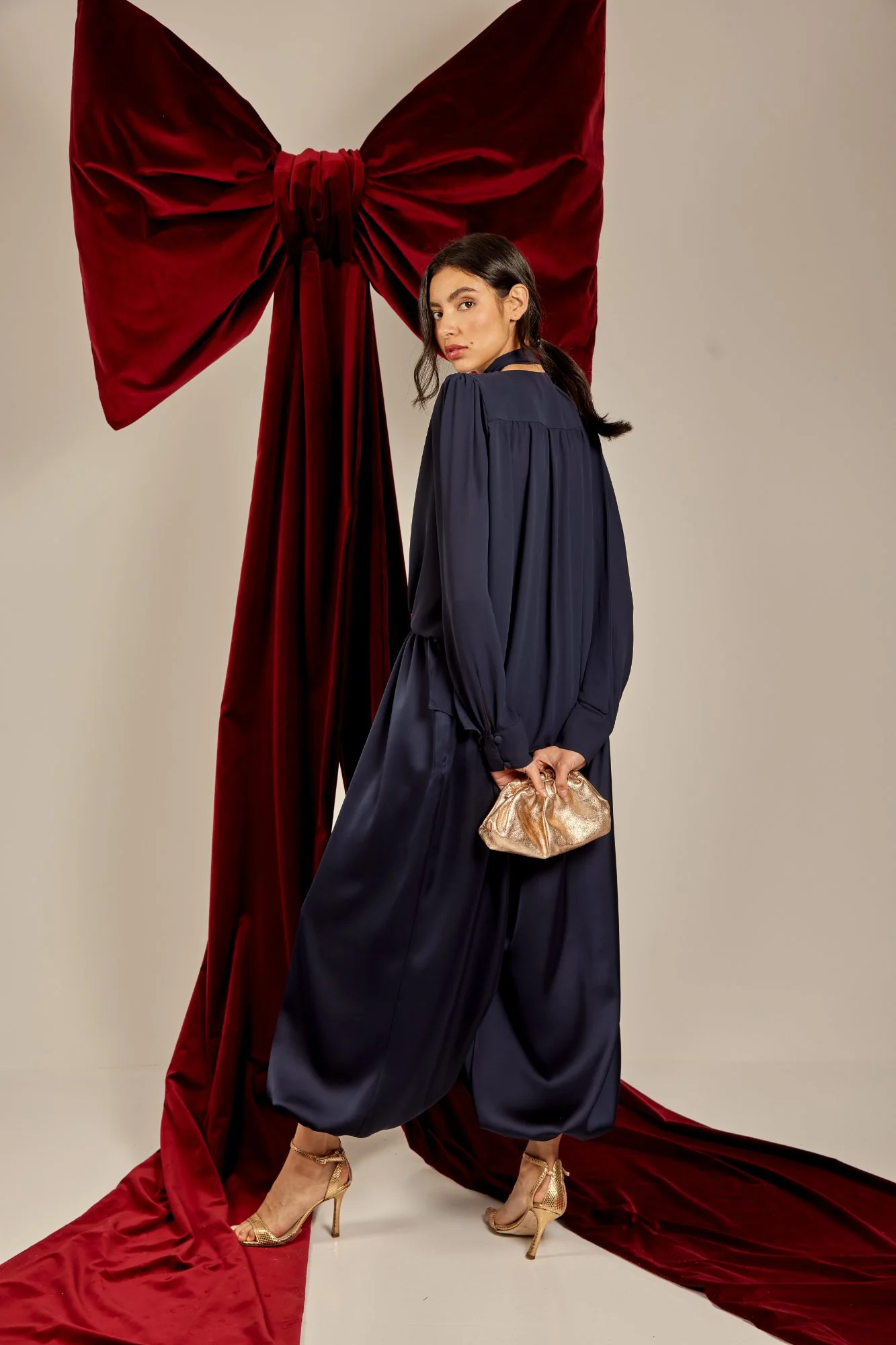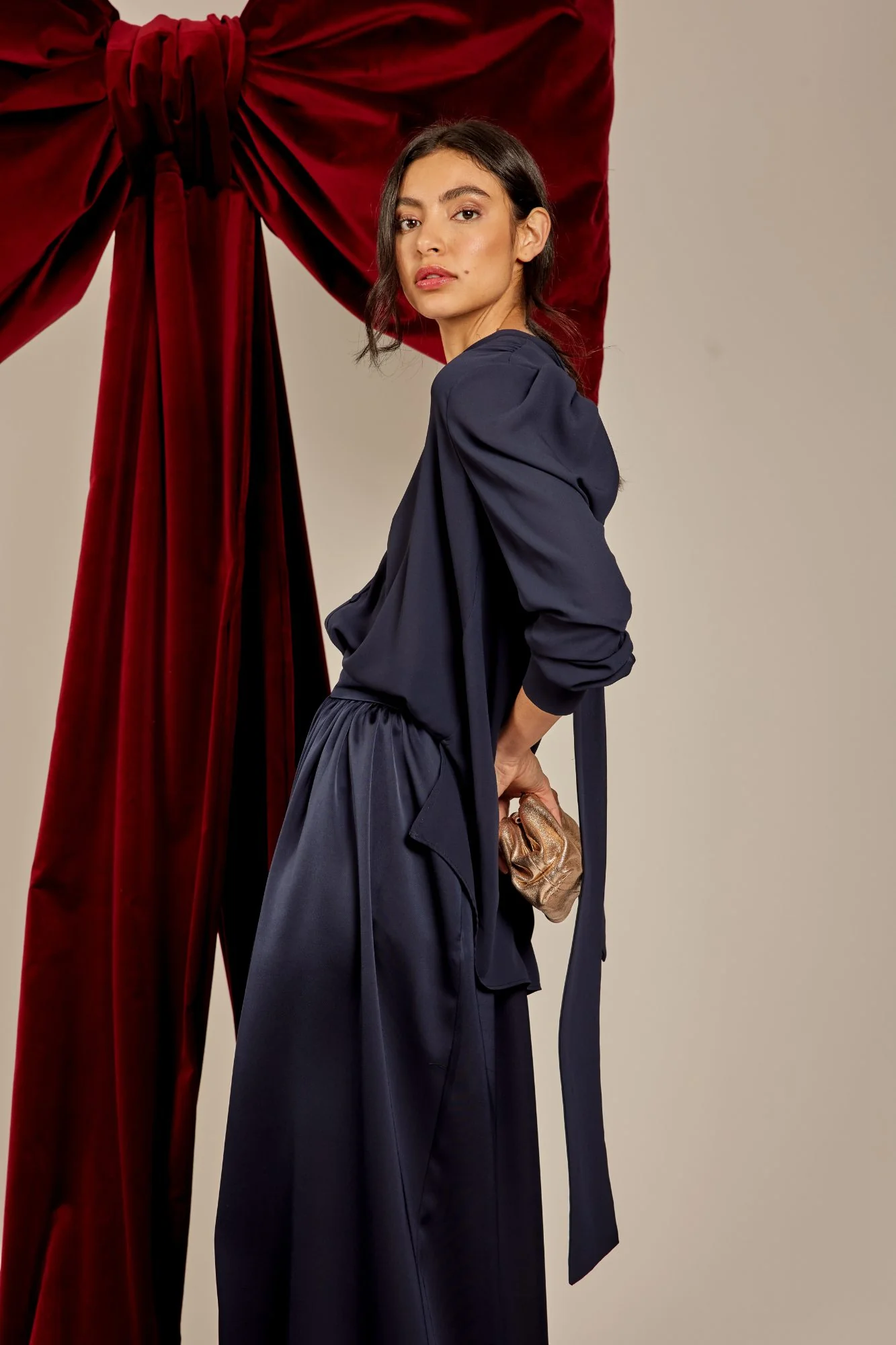 La Camisa Carlota es una blusa elegante y contemporánea, diseñada en un tono oscuro sofisticado y confeccionada con un tejido fluido que aporta caída y movimiento. Su detalle distintivo es el escote con tira decorativa en el cuello, acompañado de un cierre frontal minimalista con botones forrados que realzan su estilo moderno. De manga larga y silueta relajada, es una prenda versátil ideal para looks de noche, eventos especiales o estilismos formales con un toque vanguardista.