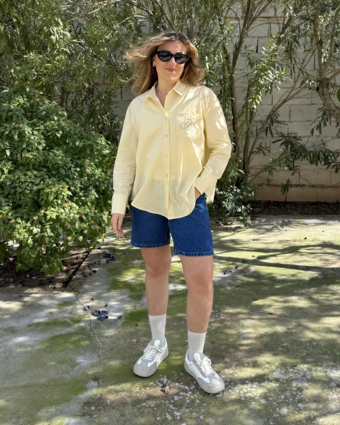 Camisa amarilla de popelín 100% algodón orgánico, con corte oversize. Su ligero vuelo trasero aporta un toque de frescura y movimiento. Logo de Clotsy bordado en el bolsillo delantero.