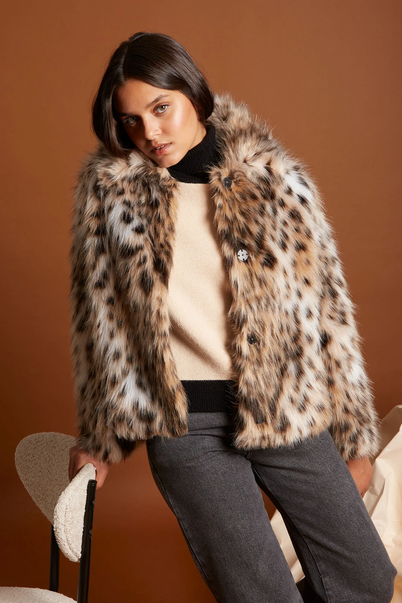 La chaqueta Leana de Coosy es la prenda perfecta para quienes buscan sofisticación, tendencia y confort en un solo diseño. Con un acabado de efecto peluche y estampado animal en tonos naturales, este abrigo combina textura, volumen y elegancia para elevar cualquier look de invierno.