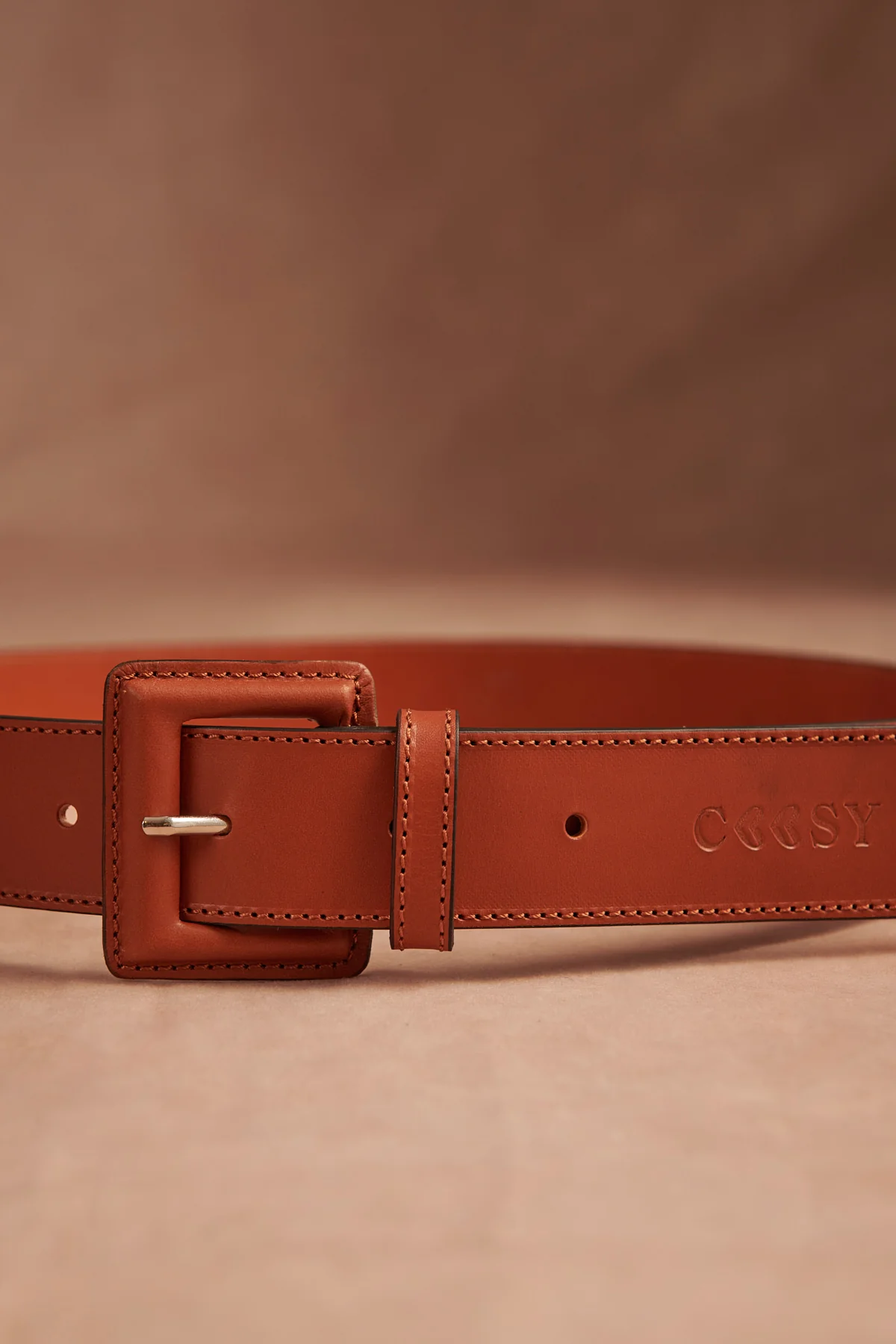 Cinturón confeccionado en piel color marrón. Cierre delantero con hebilla forrada en piel.