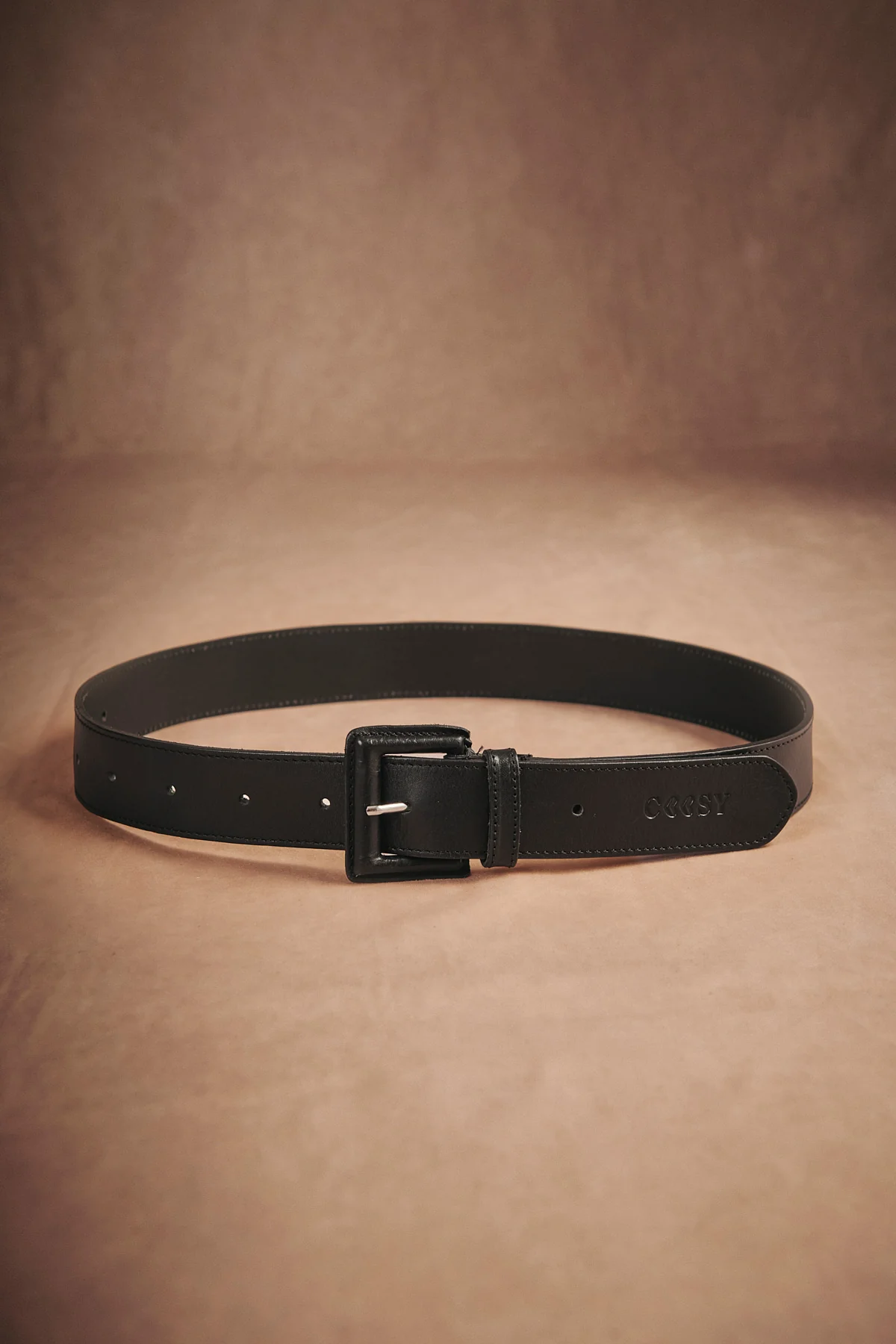 Cinturón confeccionado en piel color negro. Cierre delantero con hebilla forrada en piel.