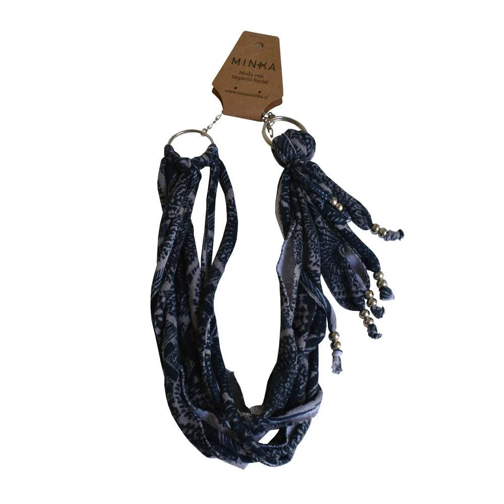 Este collar hecho a mano con tela reutilizada y accesorios metálicos color plateado es la combinación perfecta de estilo y conciencia social. Elaborado por artesanas de la Región Metropolitana (Recoleta, Maipú, Peñalolén y Estación Central), cada pieza refleja dedicación y creatividad, haciendo de este collar un complemento ideal para cualquier look.