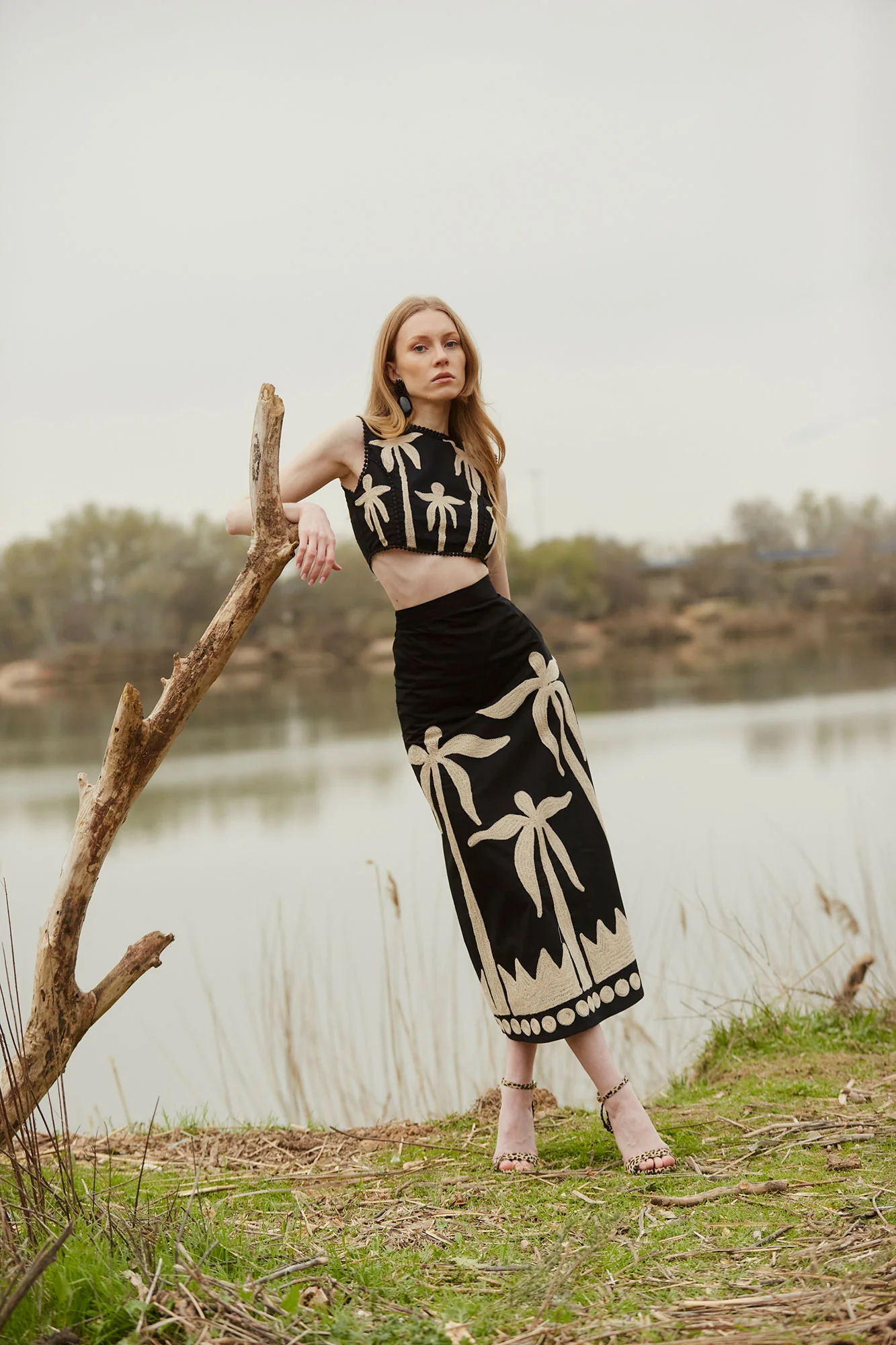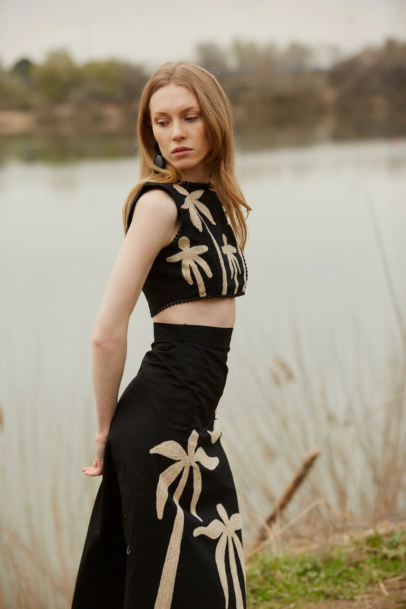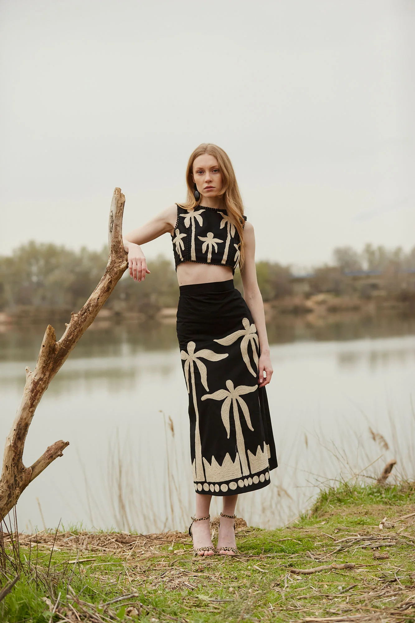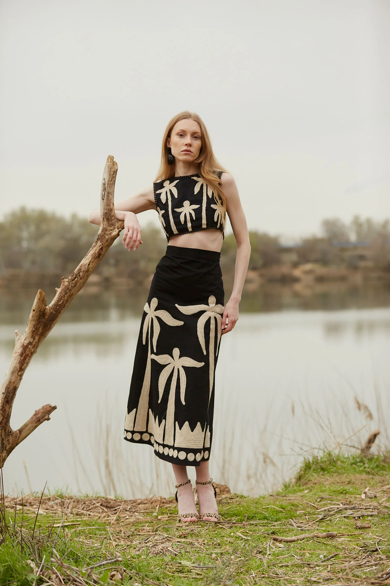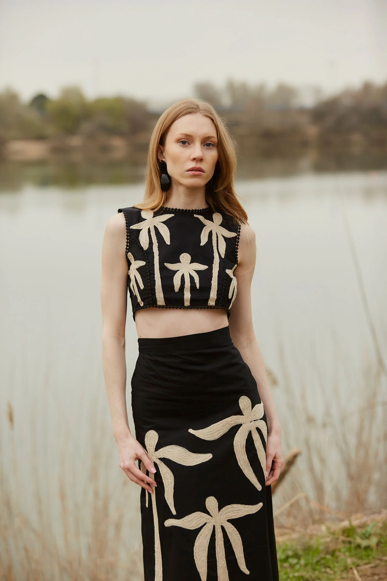 El conjunto Dalias es una propuesta sofisticada y contemporánea que combina diseño artesanal y siluetas modernas. Formado por top cropped y falda midi a juego, este conjunto destaca por su bordado de inspiración tropical en contraste beige sobre fondo negro, con motivos de palmeras que aportan un aire artístico y elegante.