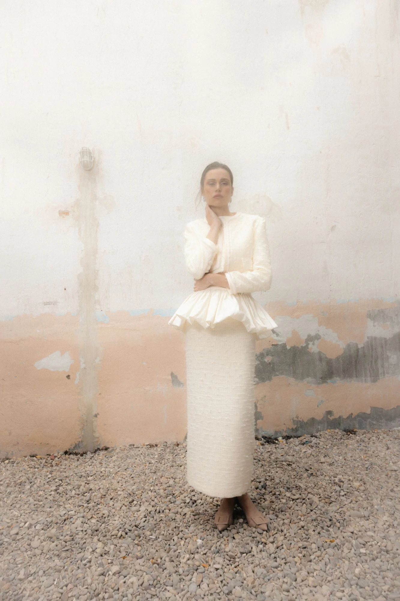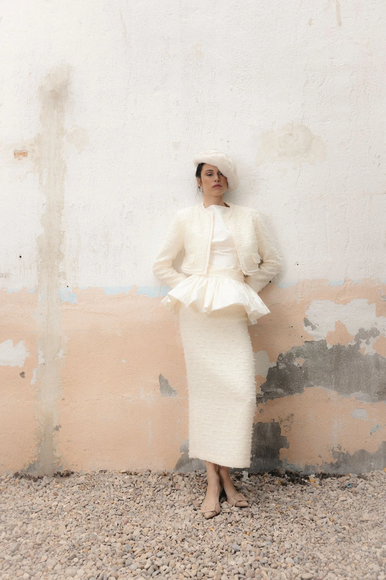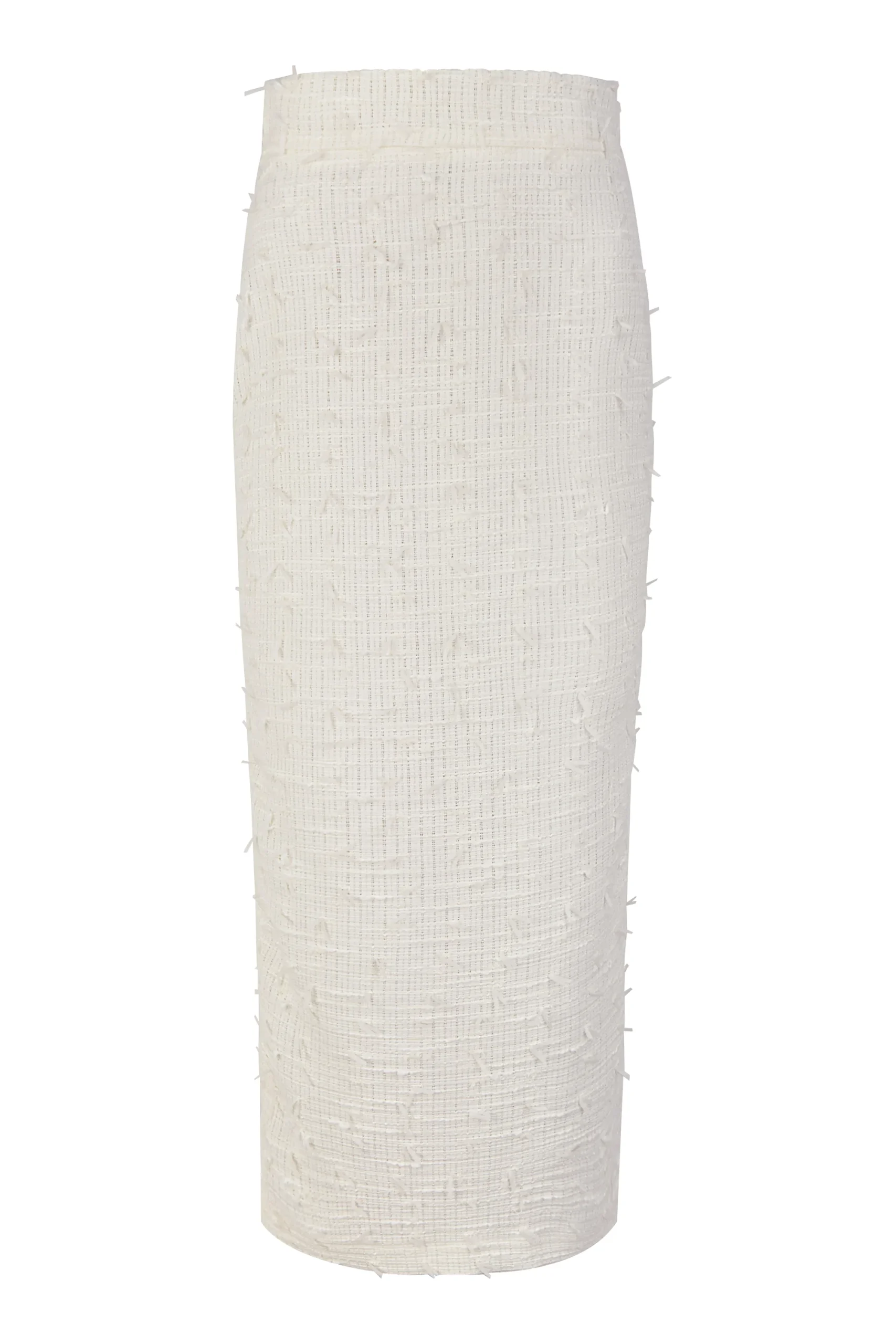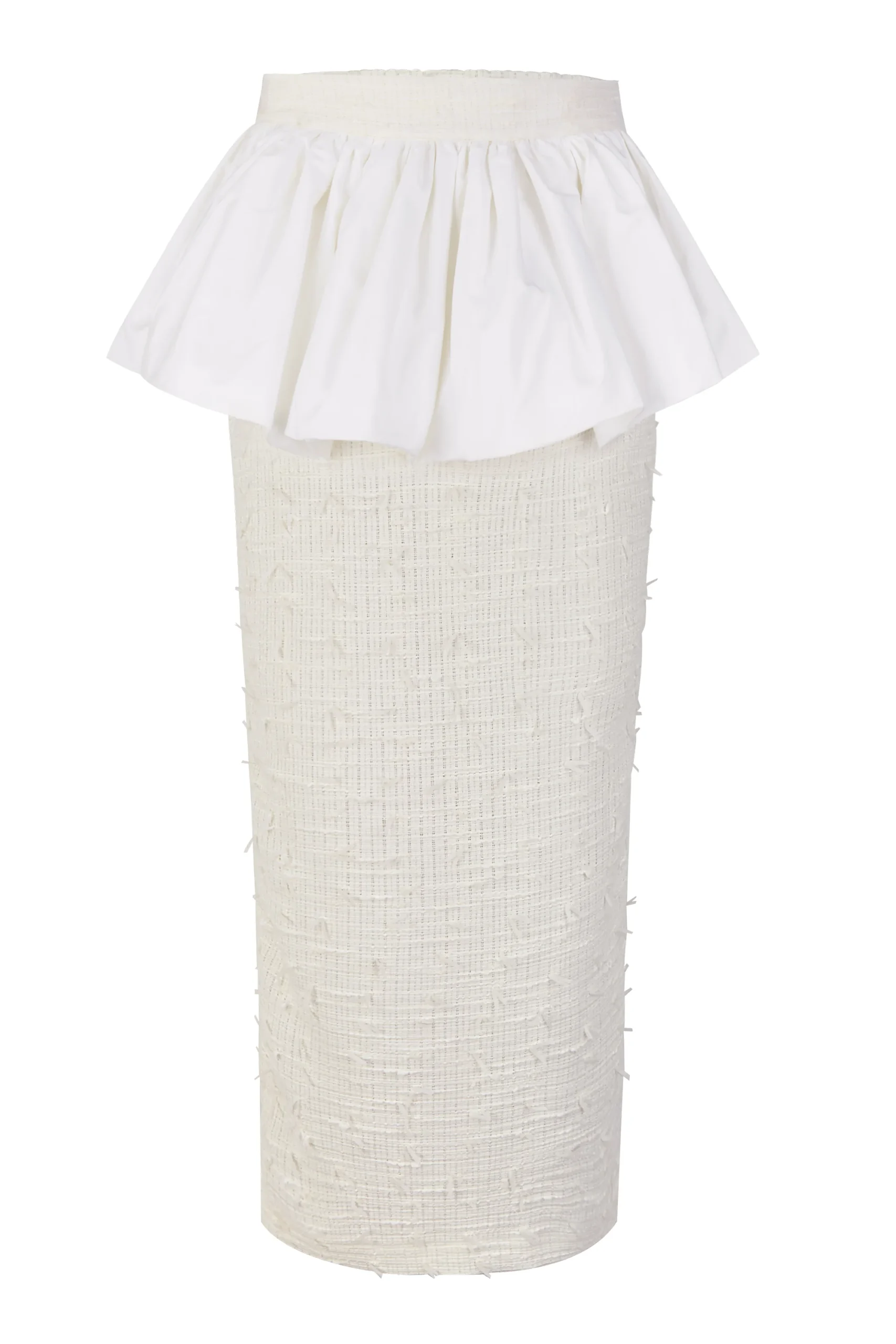 Confeccionada en un tejido texturizado de acabado refinado, la falda presenta una silueta estilizada que se equilibra con un volante estructurado en la cintura, integrado en la propia prenda. Este detalle aporta volumen y movimiento de forma sutil, sugiriendo una estética couture sin perder ligereza ni armonía.