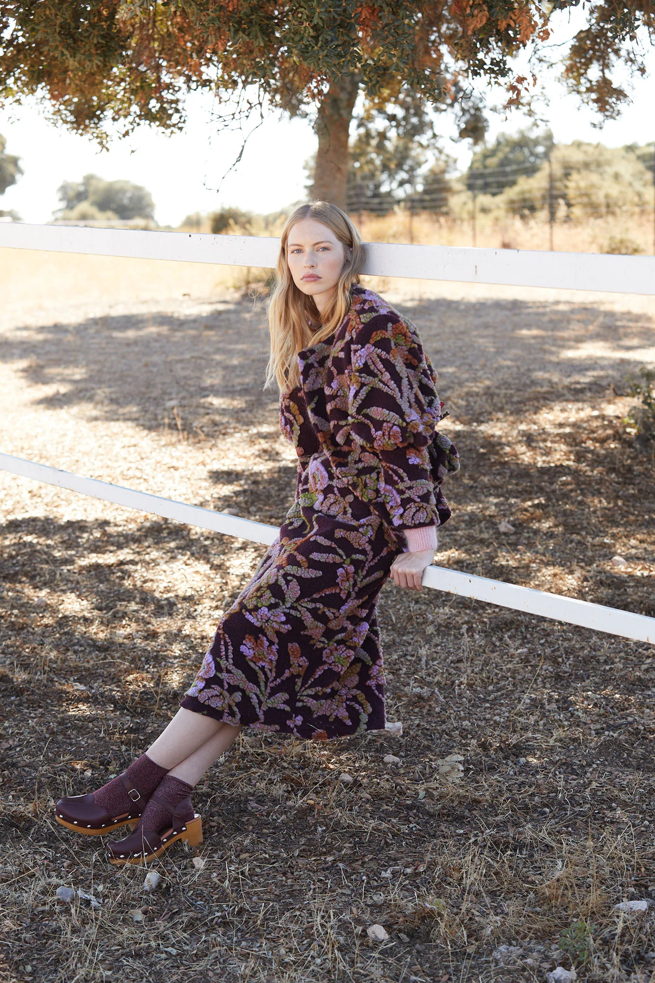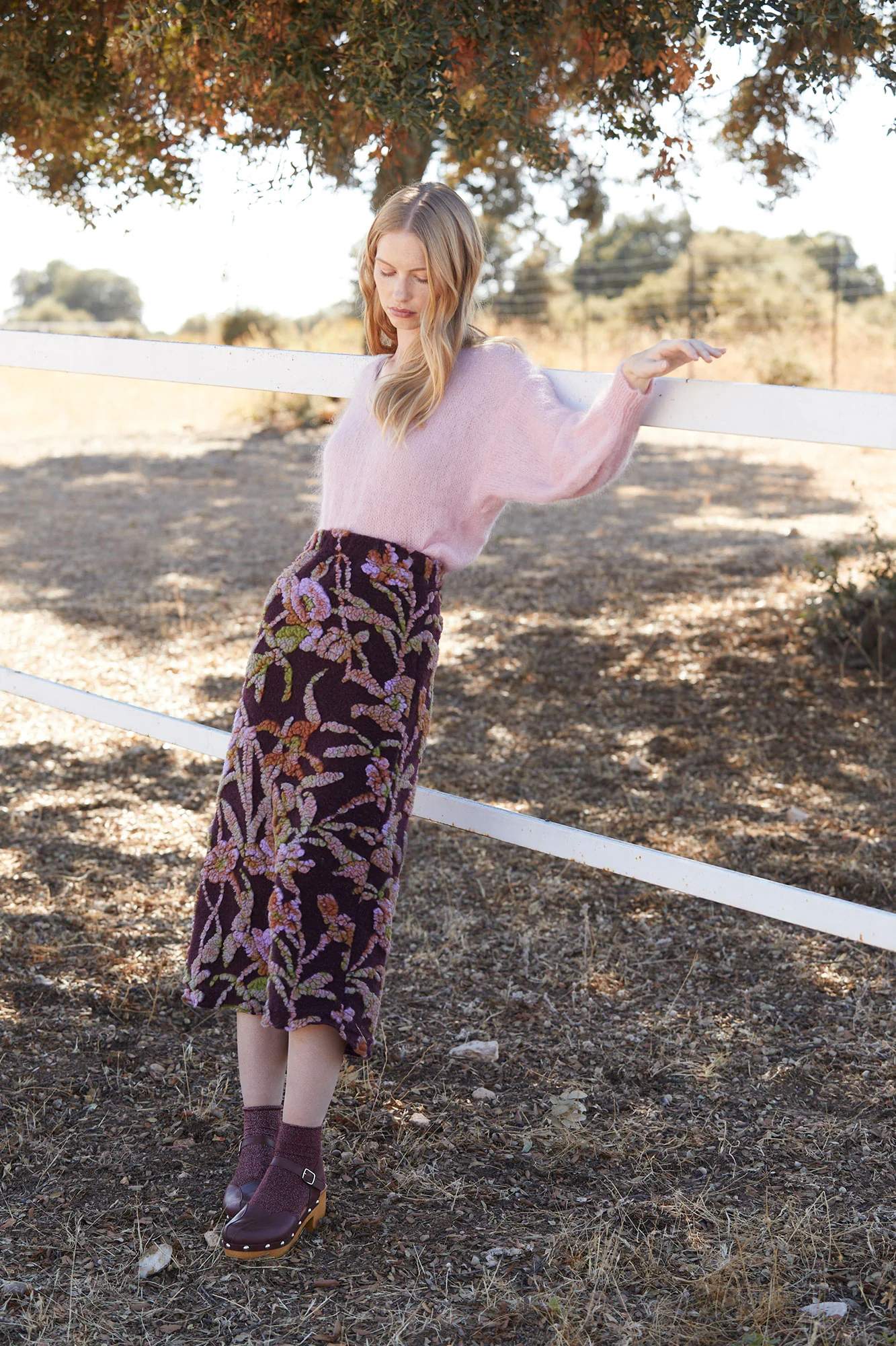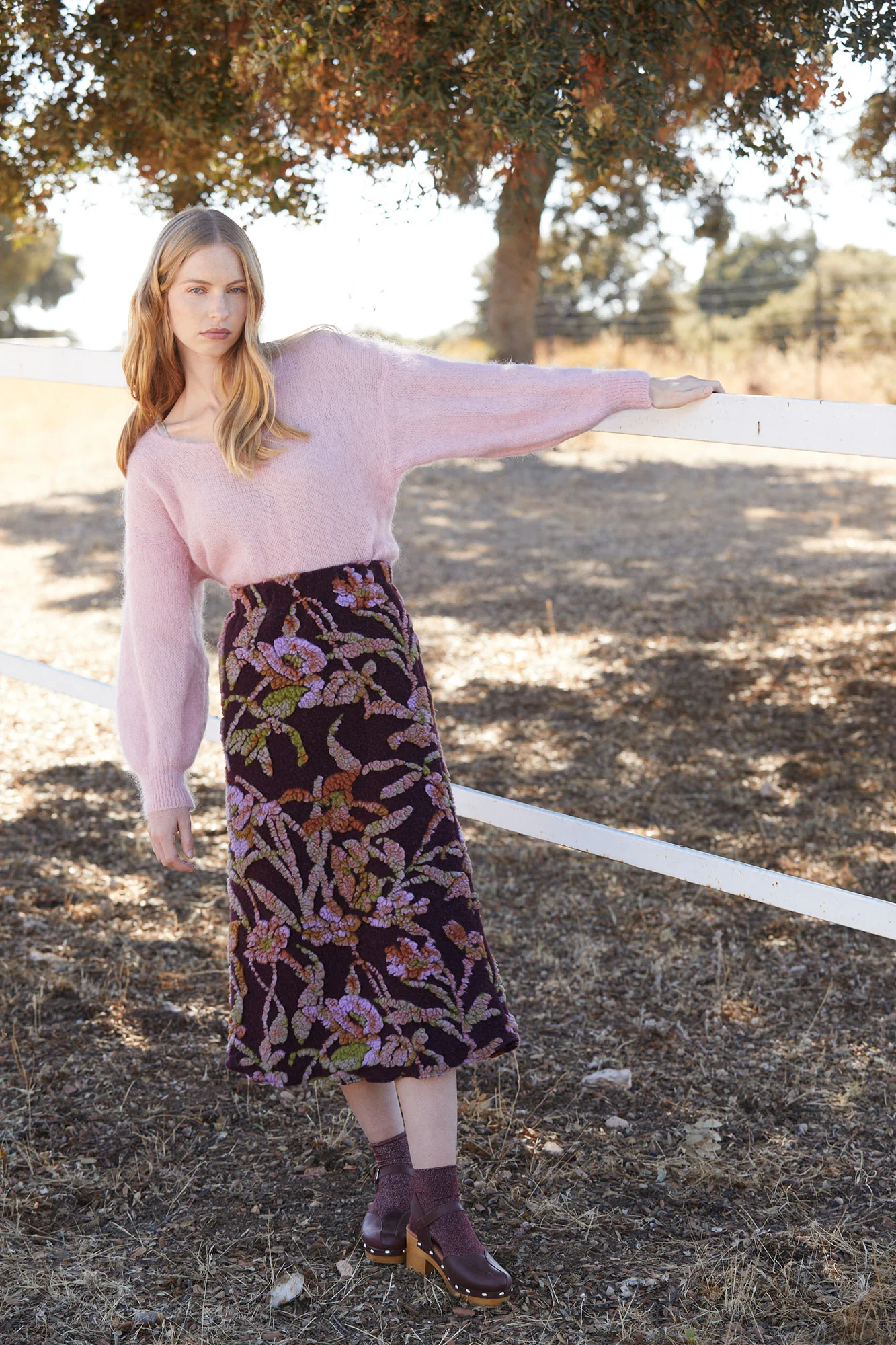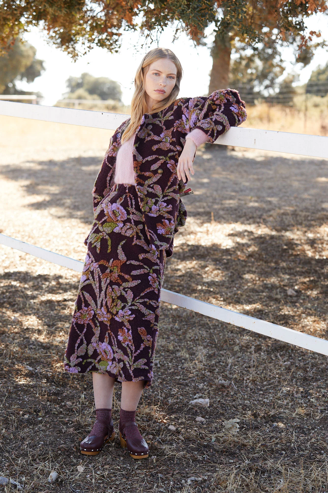 La falda Lana de Coosy es una auténtica joya textil que combina elegancia, textura y diseño artesanal. Confeccionada en un tejido de fondo burdeos profundo, esta falda destaca por su espectacular bordado floral en relieve, que mezcla tonos malva, verdes y rosados, aportando un efecto tridimensional y una estética sofisticada.
