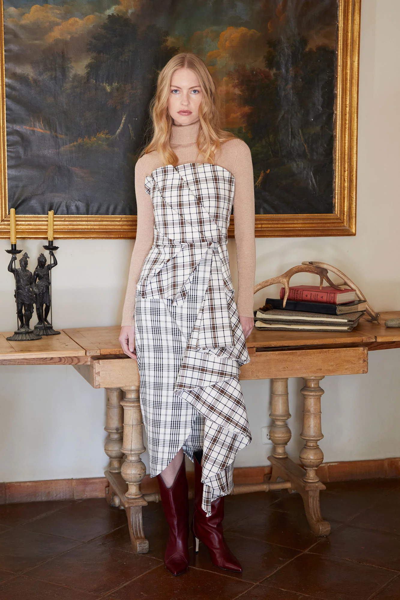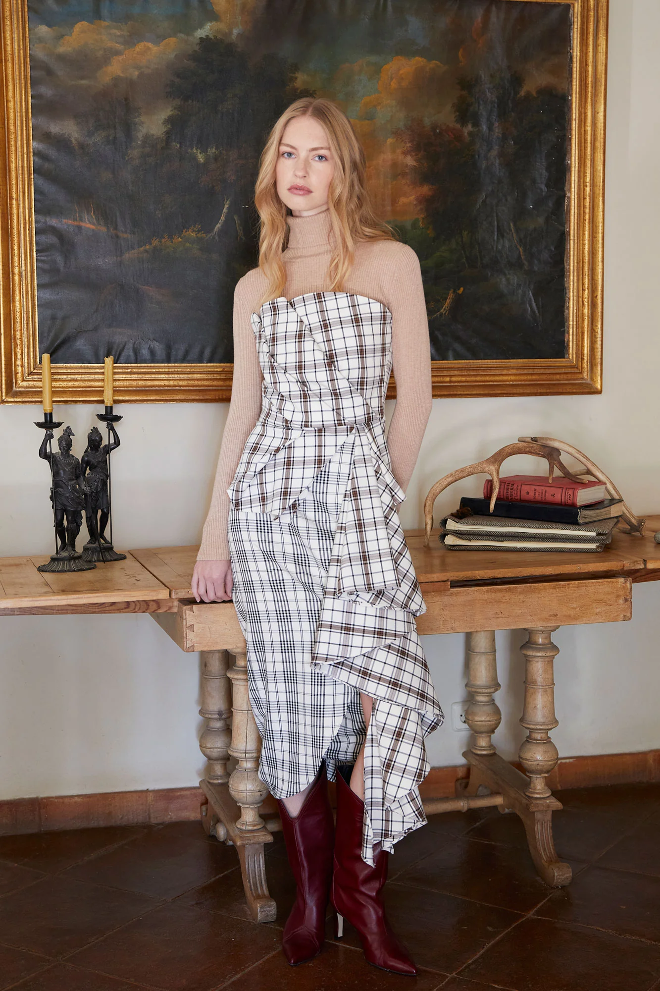 La falda Lúa redefine la elegancia con un diseño lleno de carácter y fluidez. Confeccionada en un tejido de cuadros en tonos neutros, esta pieza destaca por su corte irregular con volantes suaves que aportan movimiento y dinamismo a la silueta.