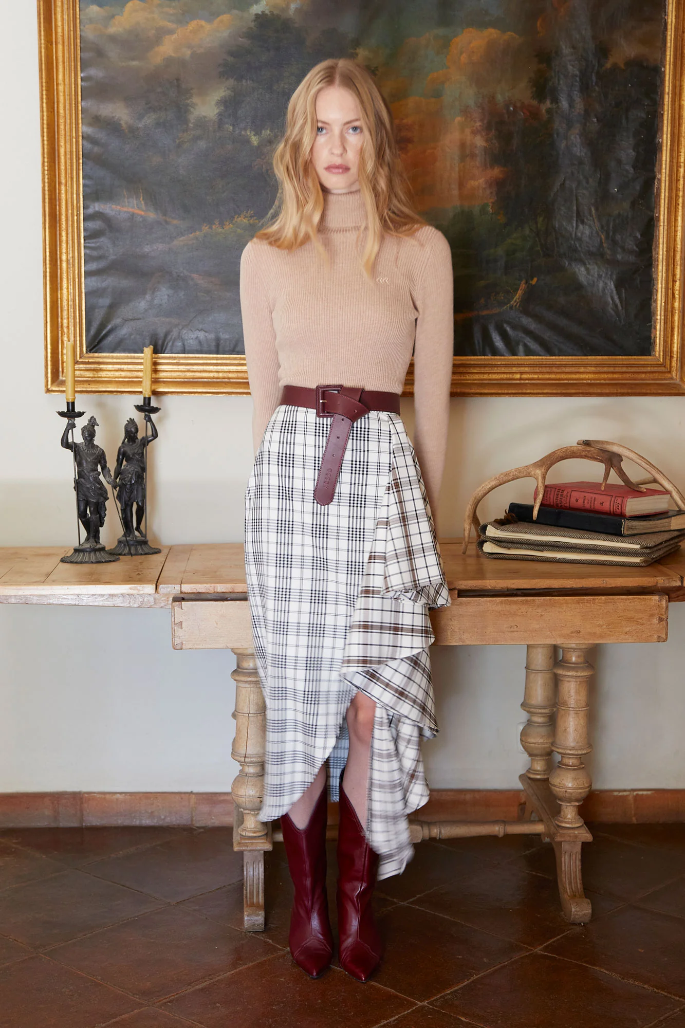 Su cintura alta estiliza la figura, mientras que la asimetría del bajo aporta un toque contemporáneo y diferenciador. Perfecta para combinar con botas de piel y jerséis de punto, esta falda se convierte en una aliada versátil para looks de día con personalidad o para elevar un conjunto más sofisticado.