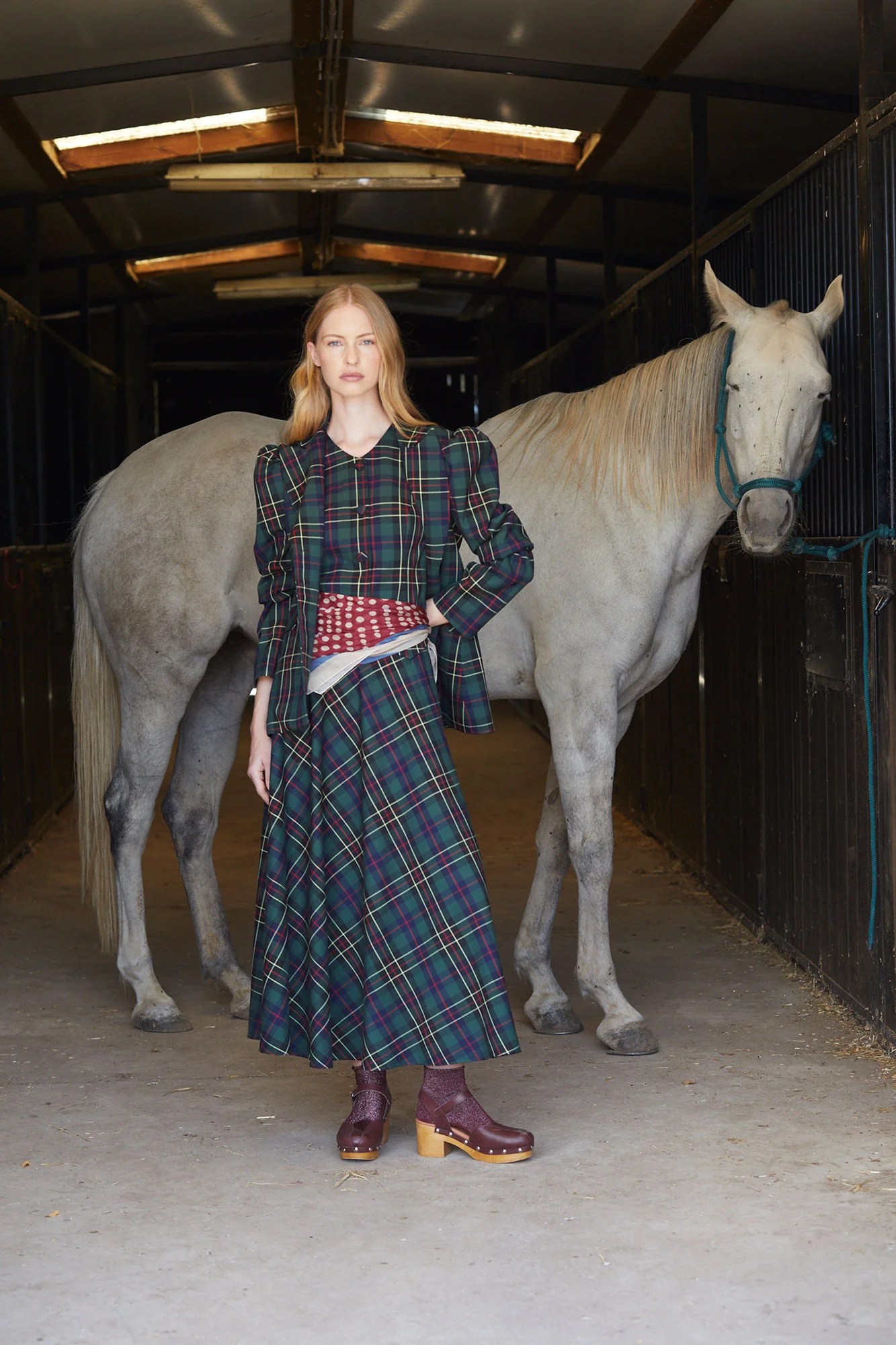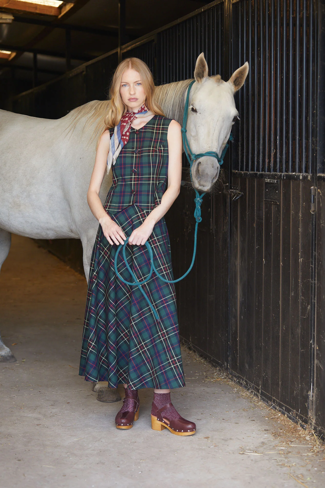 Esta falda midi de cuadros verdes y azul marino combina estilo clásico y elegancia contemporánea. Con un corte evasé fluido y tejido de inspiración tartán, es perfecta para looks de entretiempo o de otoño. Su diseño de talle alto estiliza la figura y aporta movimiento con cada paso.
