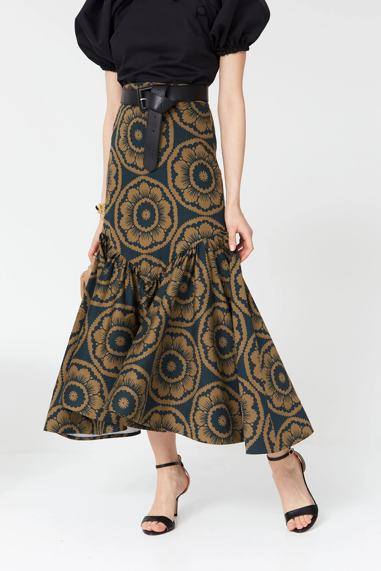 Su corte evasé con volante asimétrico crea un movimiento elegante al caminar, estilizando la silueta y añadiendo dinamismo al diseño. La cintura alta realza la figura y permite combinarla fácilmente con blusas ajustadas, tops minimalistas o camisas románticas. El detalle del cinturón en contraste potencia el look y aporta un acabado pulido y sofisticado.