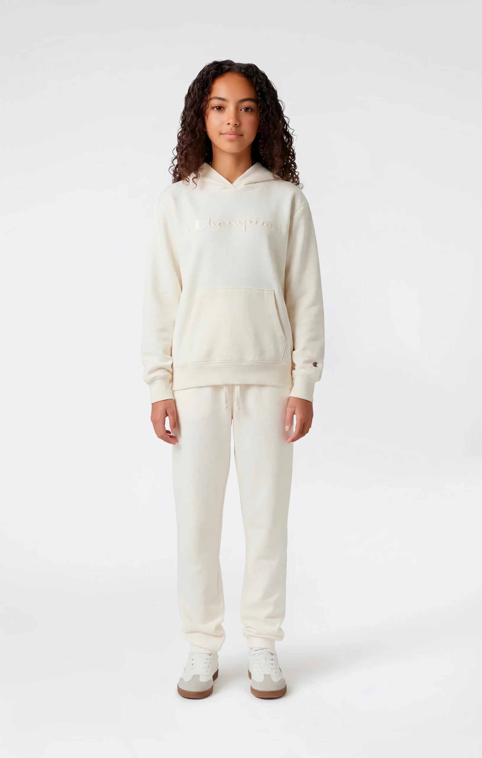 Girls’ pants designed for everyday activities, from school to leisure time. Made from lightweight Poly Terry fabric, they offer comfort and freedom of movement throughout the day. The elasticated cuffs ensure a practical and comfortable fit, while the Champion logo embroidered on the leg adds a distinctive sporty detail. The Standard Fit provides a regular silhouette that is easy to wear and style.@@@Standard Fit – regular, comfortable fit |Fabric: Ultra Light Soft Compact Spring Poly Terry |Composition: 73% Cotton, 27% Polyester |Weight: 240 g/m² |Elasticated waistband with drawstring |Elasticated cuffs at the hem |Champion logo embroidered on the leg |No pockets