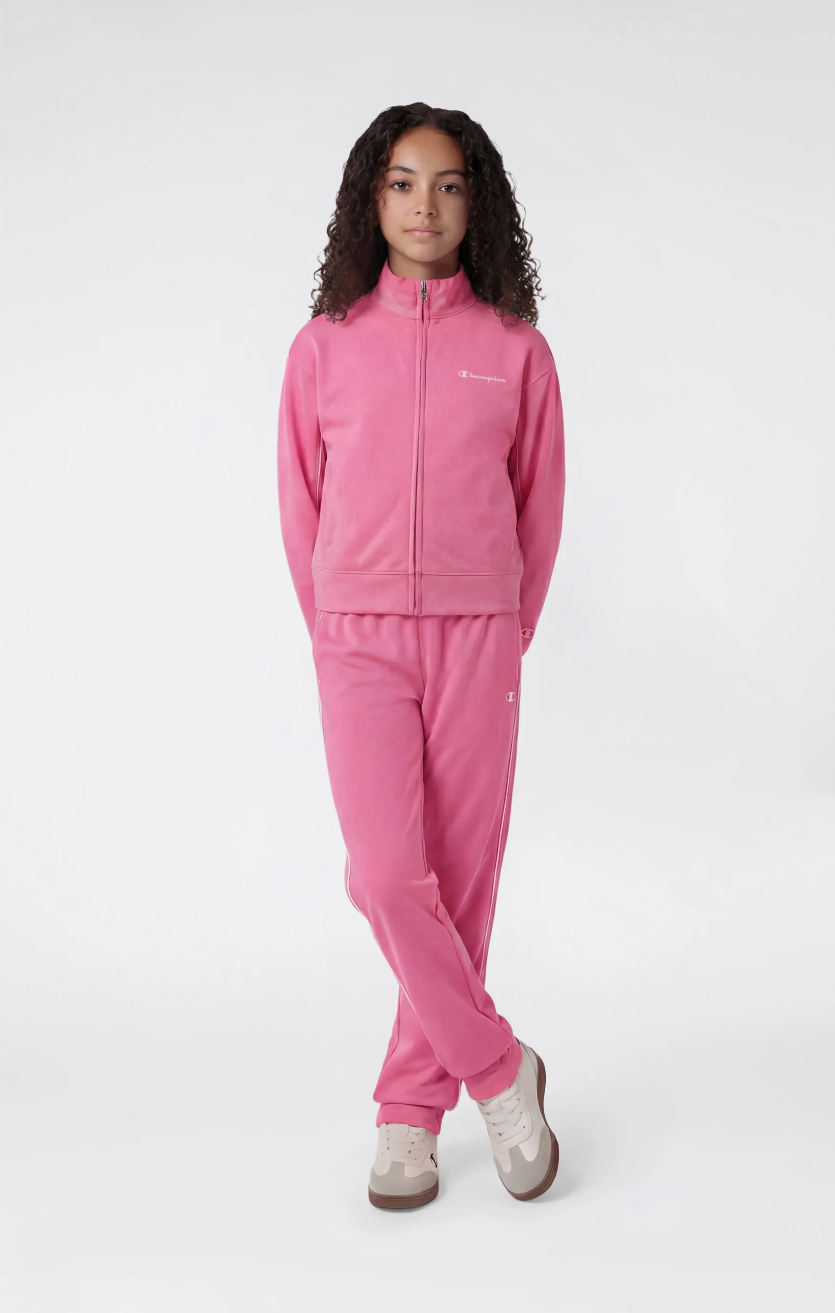 Girls’ tracksuit with a clean and essential sportswear style, composed of a full zip sweatshirt and matching pants. Made from lightweight Poly Knit fabric with a non-brushed interior, it offers comfort and practicality for everyday wear. The simple design is completed by the Champion logo, while the Standard Fit ensures a regular and comfortable silhouette suitable for daily movement.@@@Standard Fit, comfortable with a regular silhouette |Poly Knit fabric |Composition: 100% Polyester |Fabric weight: 200 g/m² |Non-brushed interior |Full zip sweatshirt |High collar |Elasticated waistband on pants |Side pockets on pants |Champion logo applied