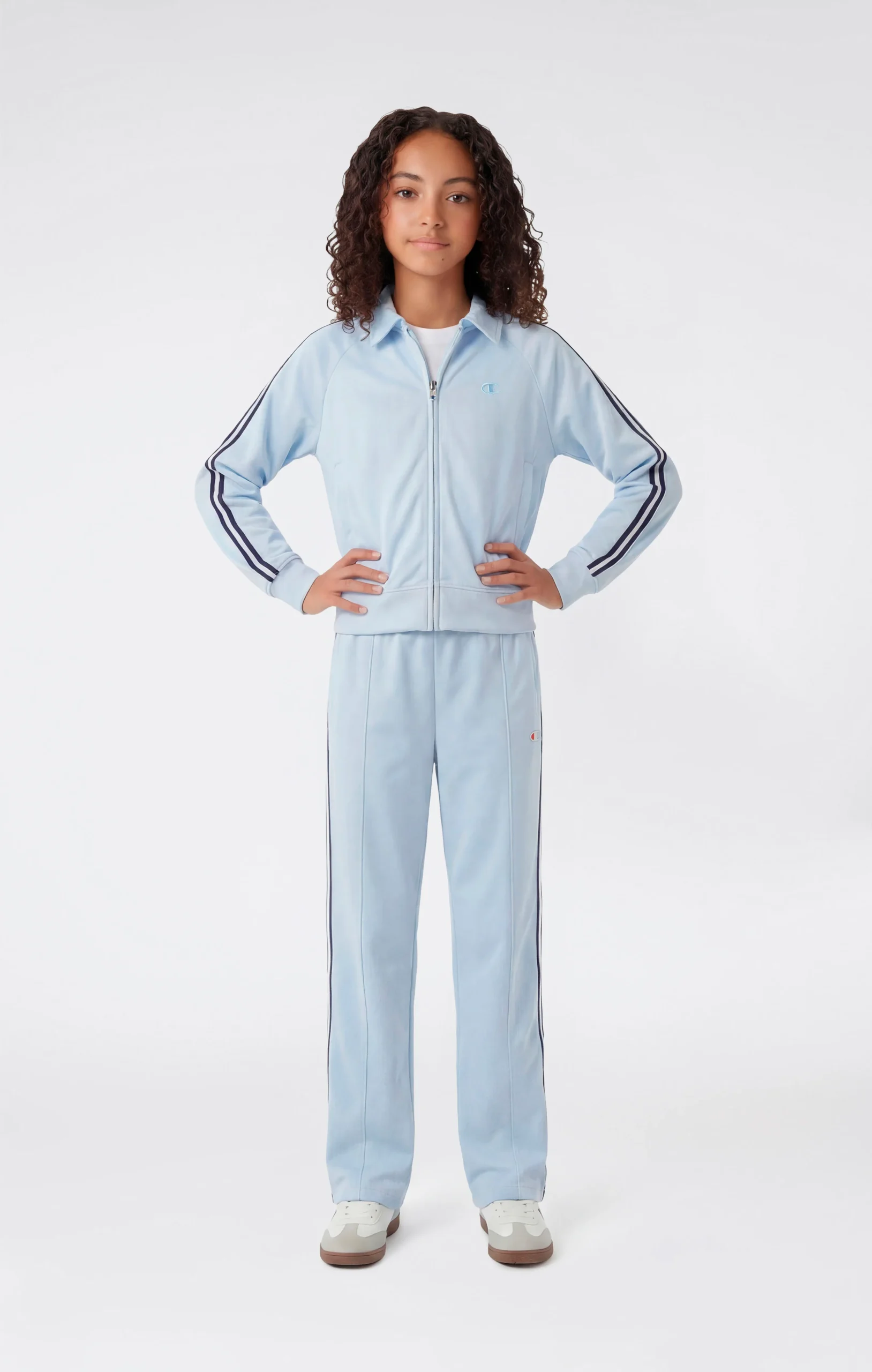 This girls’ track jacket with full zip is made from technical polyester fabric with a smooth hand feel and a semi-dull finish. The regular fit ensures comfort and practicality for everyday wear, allowing natural freedom of movement. The clean design with stand-up collar and front zip reflects a versatile track style, suitable for leisure and daily activities.@@@Fit: Standard Fit – comfortable, regular line |Fabric: Special PolyWarpKnit Semi Dull, lightweight and compact technical fabric |Composition: 100% Polyester |Weight: 200 g/m² |Details: stand-up collar and full zip closure |Unbrushed interior