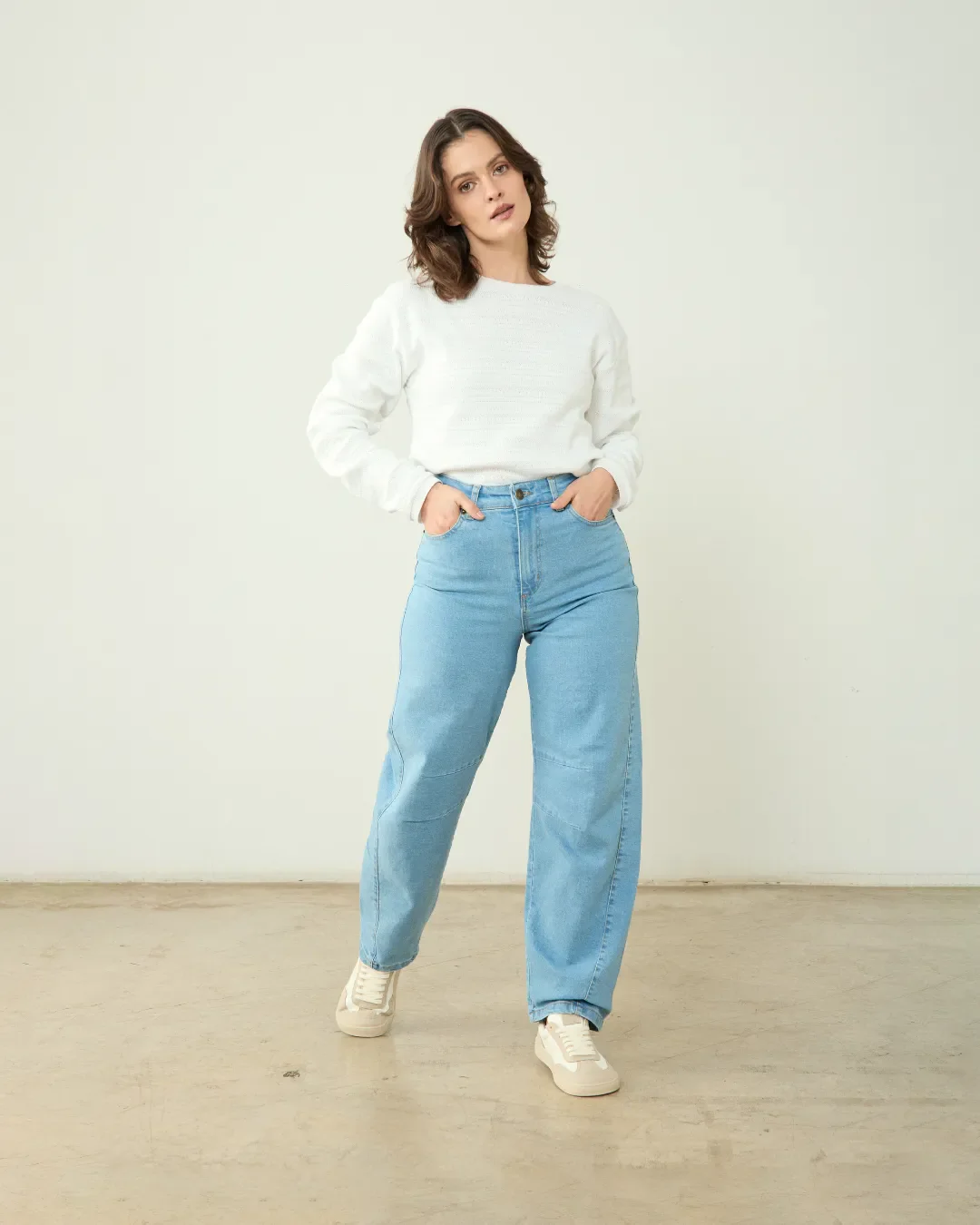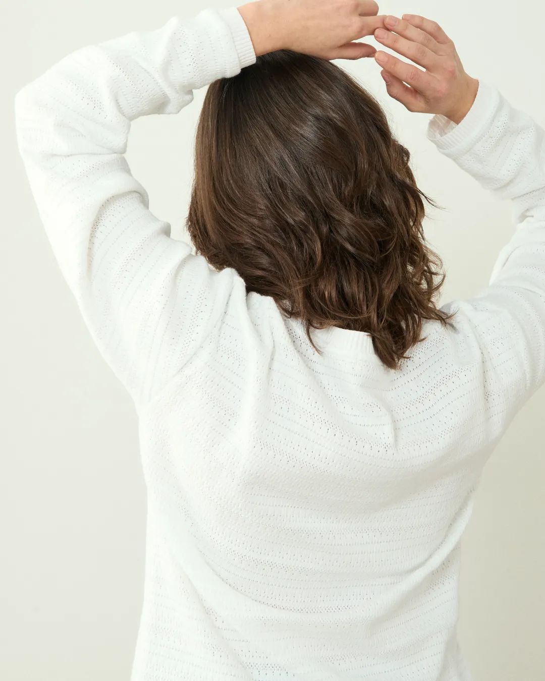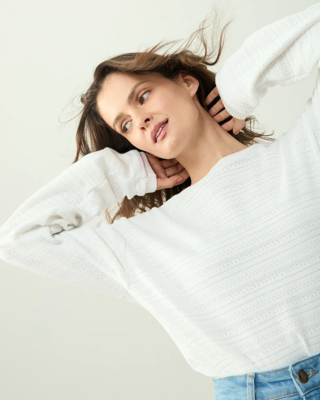 Jersey de punto calado en color blanco, confeccionado con algodón 100% orgánico, suave y transpirable, en un taller de Portugal.