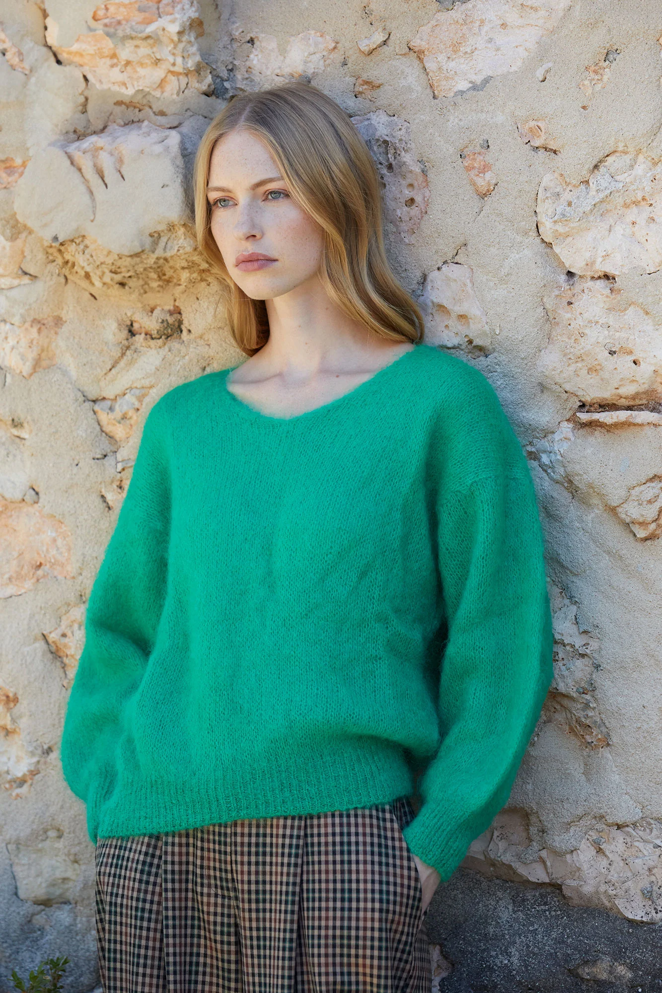 Con un diseño de cuello en pico y mangas ligeramente abullonadas, este jersey combina estilo y comodidad en cada detalle. Su tono verde es versátil y sofisticado, ideal para combinar con pantalones de cuadros, faldas midi o jeans.
