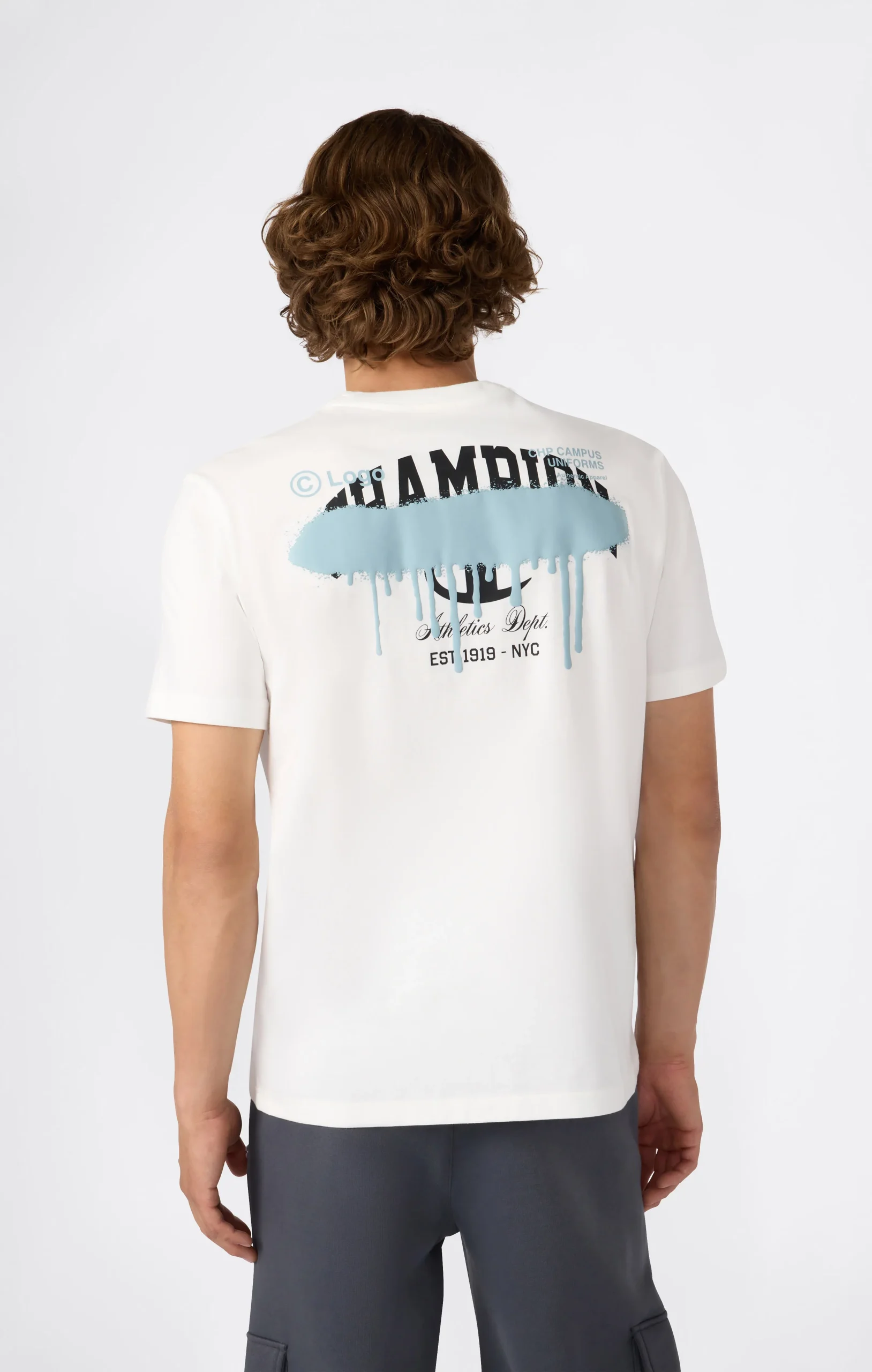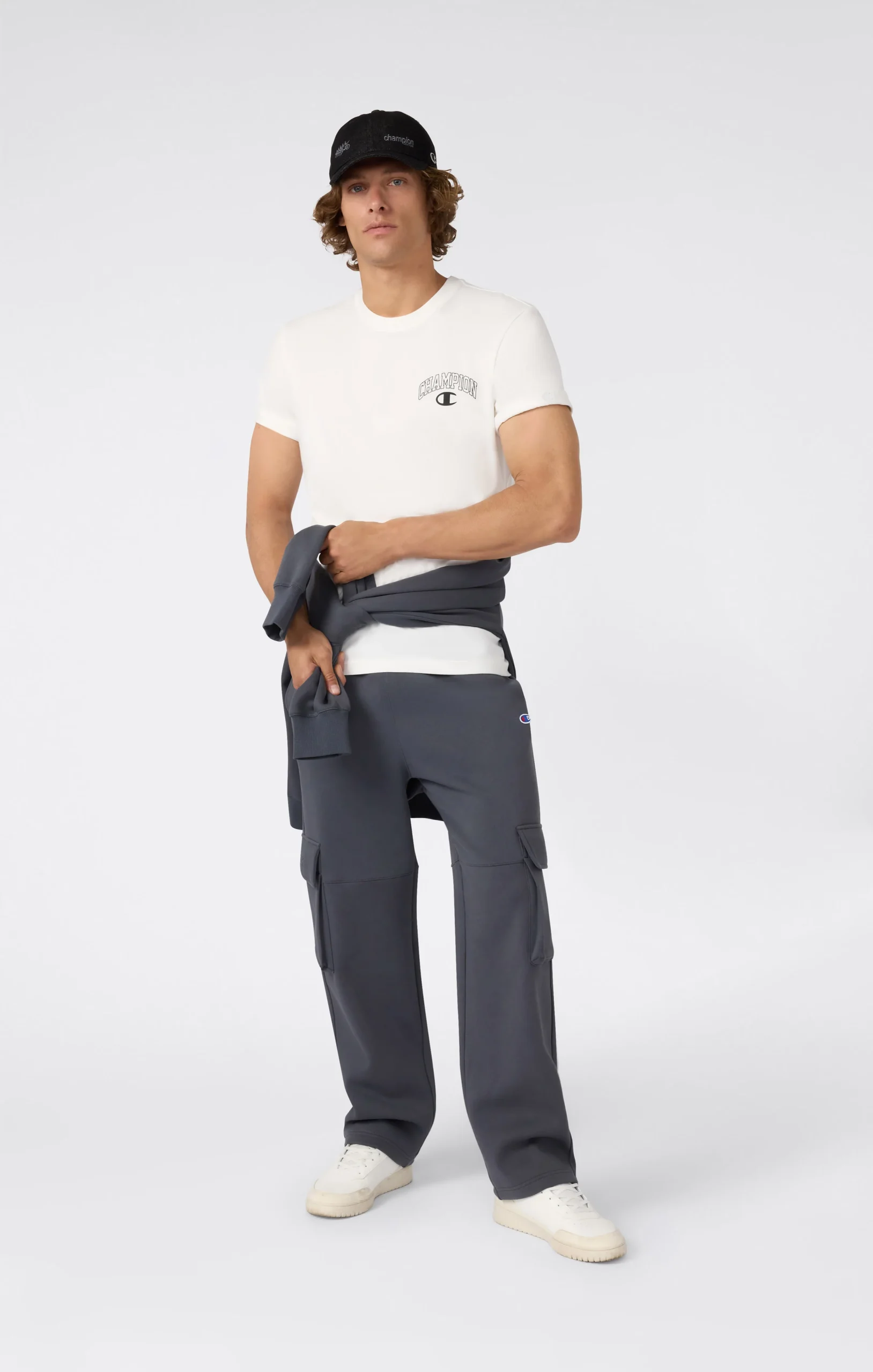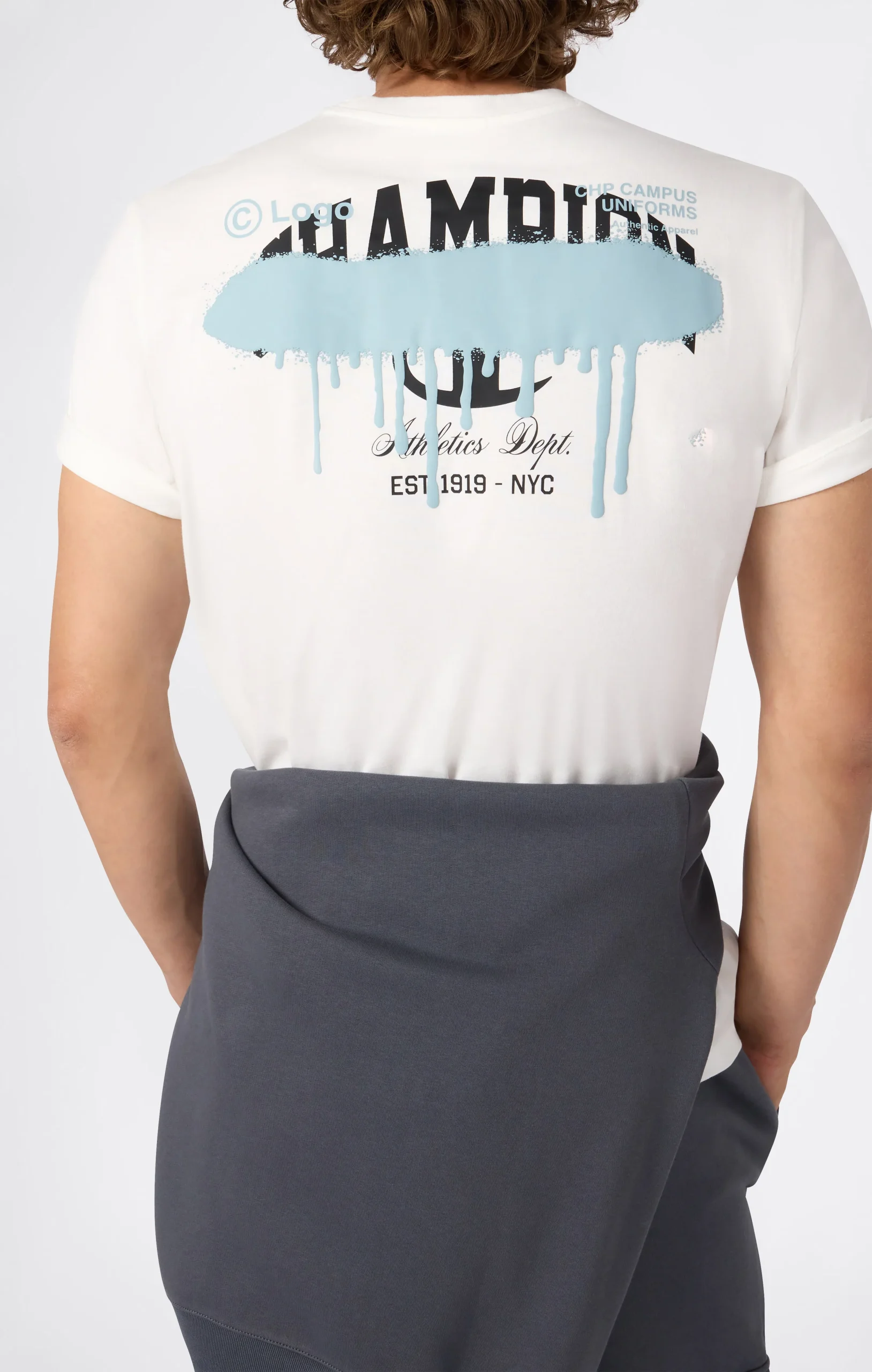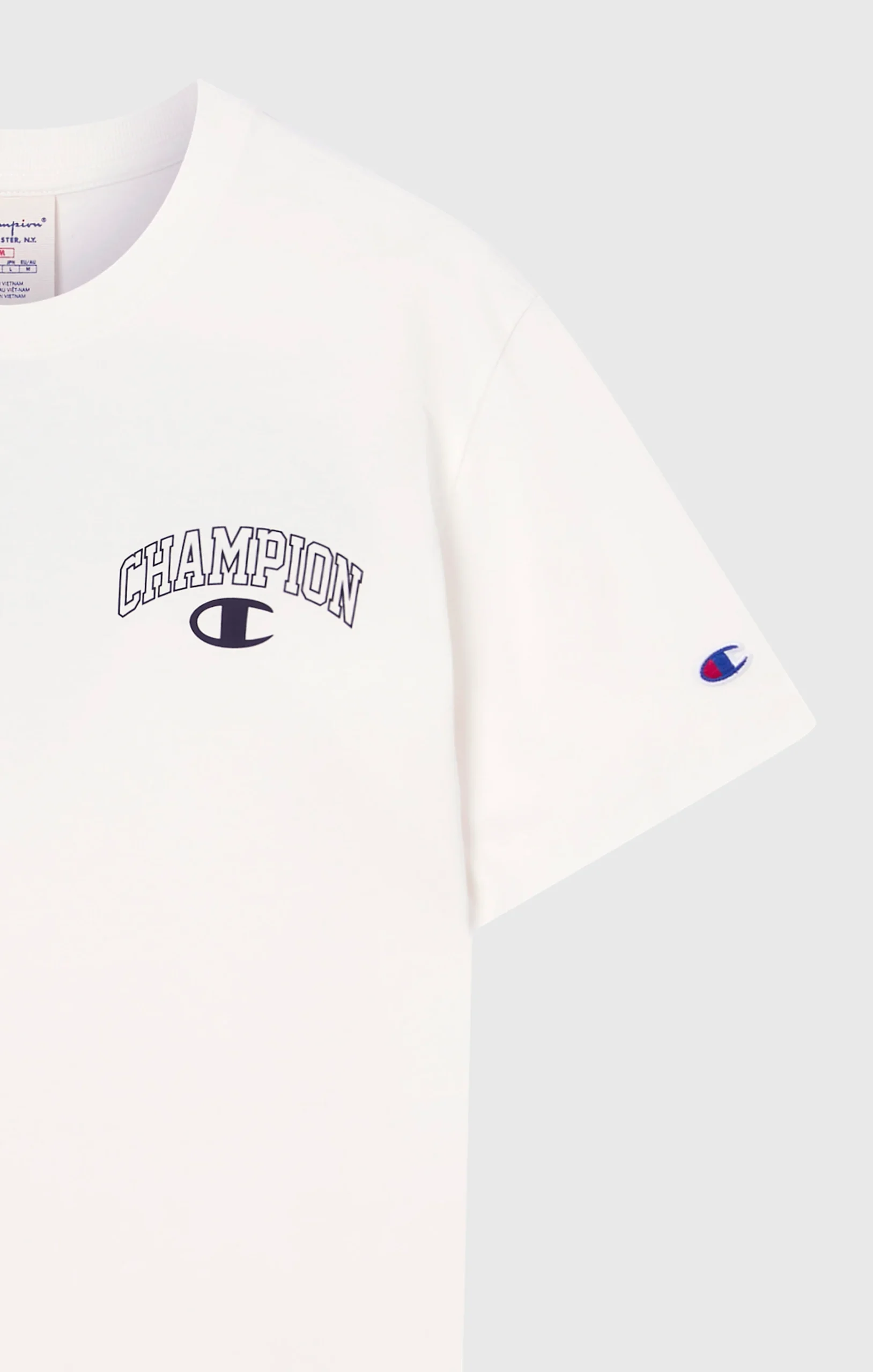 Crewneck t-shirt in 100% cotton with a college-inspired graphic and puff print Champion logo on the chest. Made of compact 200 g/m² jersey, it offers comfort and a streetwear edge in every detail.@@@Fabric: Compact jersey, weight: 200 g/m² |Composition: 100% Cotton |College-inspired graphic |Fit: Relax Fit – Relaxed and comfortable fit, slightly roomy on the chest, dropped shoulder, regular length.