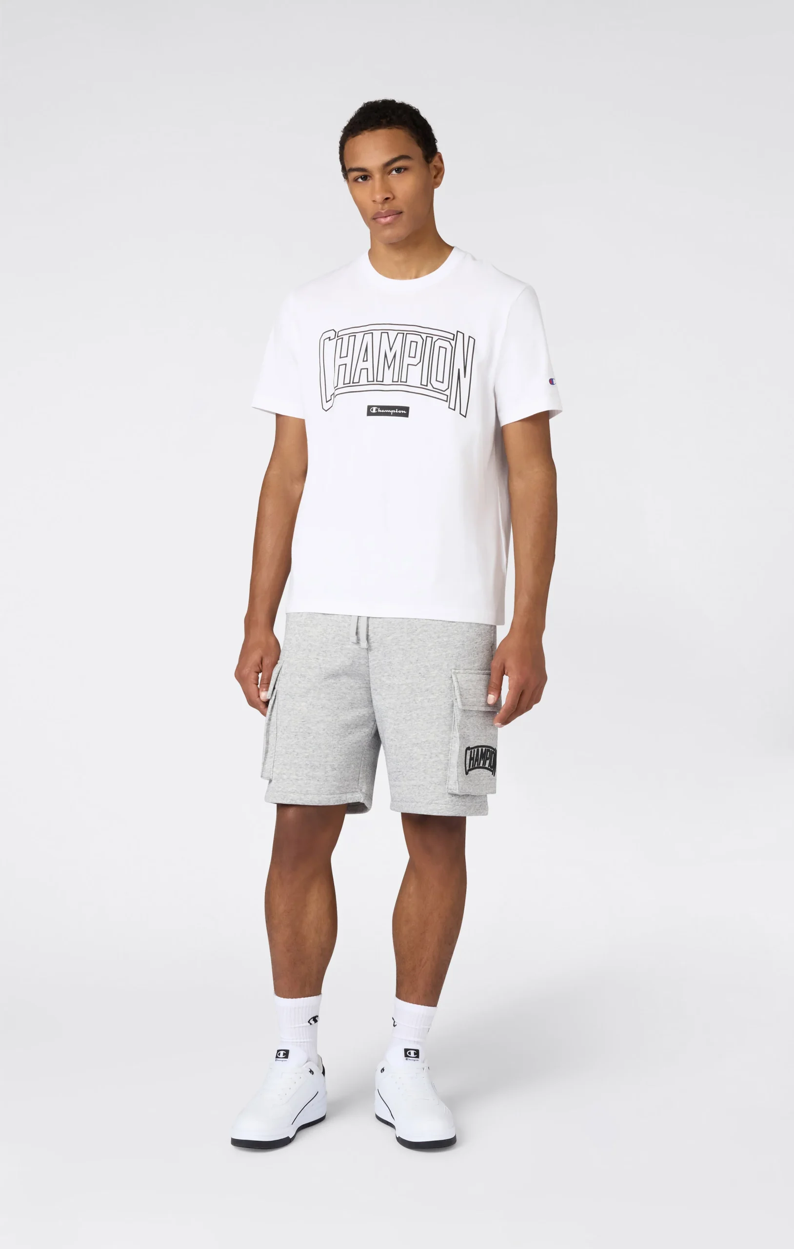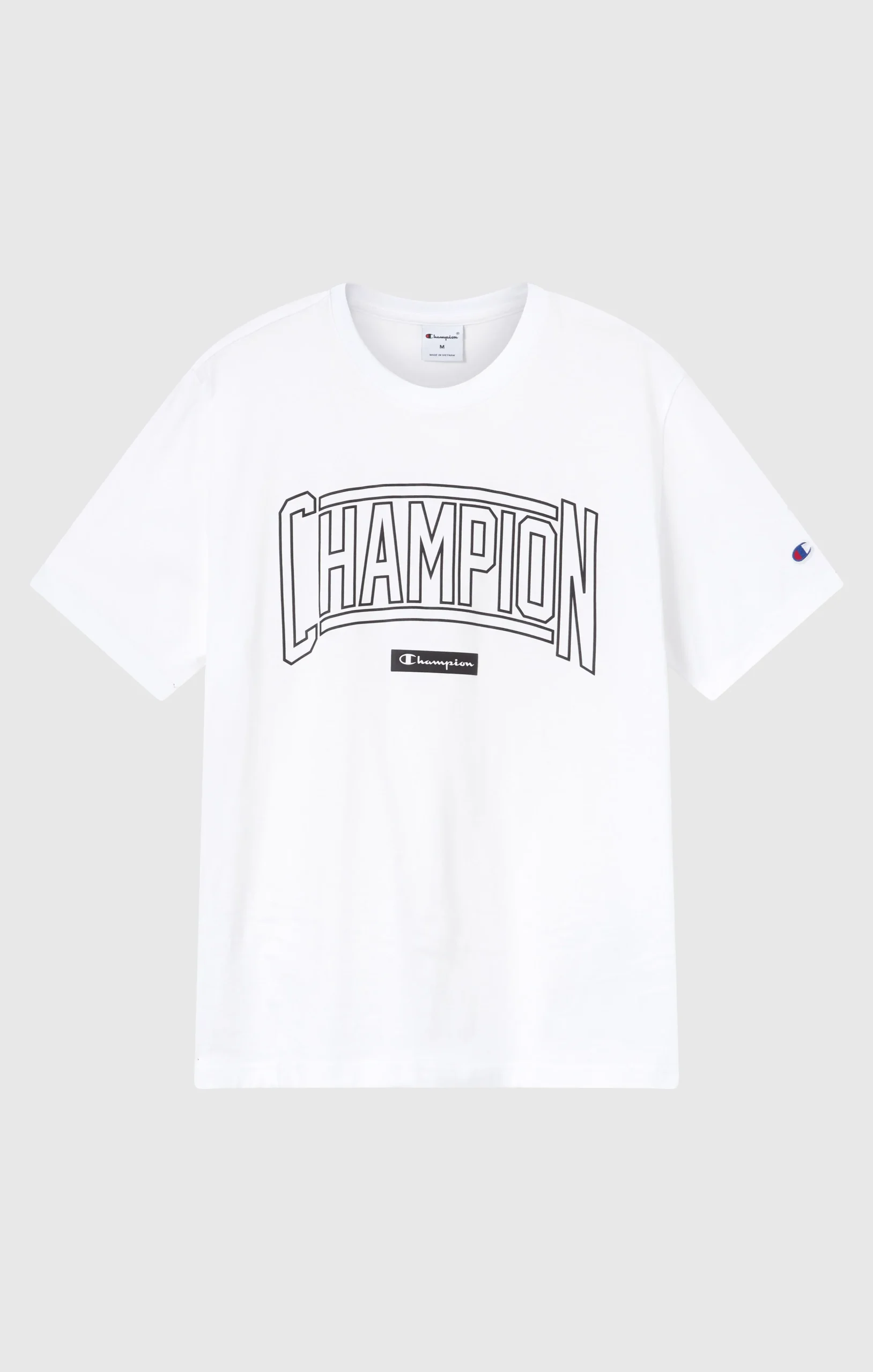 Men’s crewneck T-shirt that recalls collegiate aesthetics with a contemporary street attitude. The maxi Champion logo is made using puff print, a printing technique that creates a subtle raised effect, adding depth and character to the design. Crafted from compact combed cotton jersey, it offers a substantial yet comfortable feel, ideal for everyday wear. The Relax Core fit completes the piece with a soft, laid-back silhouette, perfect for urban life and leisure time.@@@Relax Core fit – comfortable, relaxed silhouette |Fabric: Combed Compact Cotton Single Jersey |Composition: 100% Cotton |Weight: 200 g/m² |Crewneck |Short sleeves |Maxi Champion logo printed on the chest