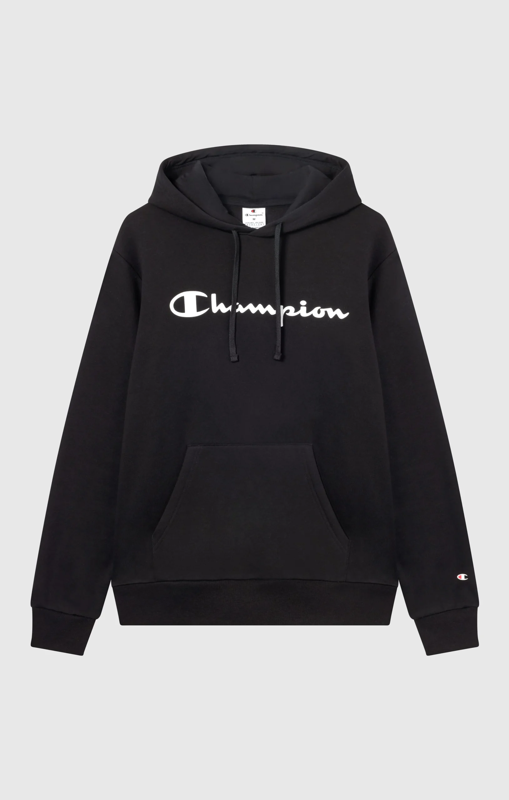 Featuring the Champion script logo, this hoodie is a timeless icon of simplicity and identity. Made of 280 g/m² compact fleece with brushed lining, it offers daily softness and warmth. The kangaroo pocket and adjustable drawcord complete a design made for authentic style lovers.@@@Fabric: Soft and compact cotton-blend fleece, weight: 280 g/m² |Composition: 55% Cotton, 45% Polyester |Brushed interior |Champion script logo printed on the chest |Adjustable hood with drawstring |Kangaroo pocket |Ribbed cuffs and hem |Fit: Standard Fit – Versatile and comfortable fit with standard widths and lengths. Contours the body with clean lines that don’t cling. Regular shoulder cut.