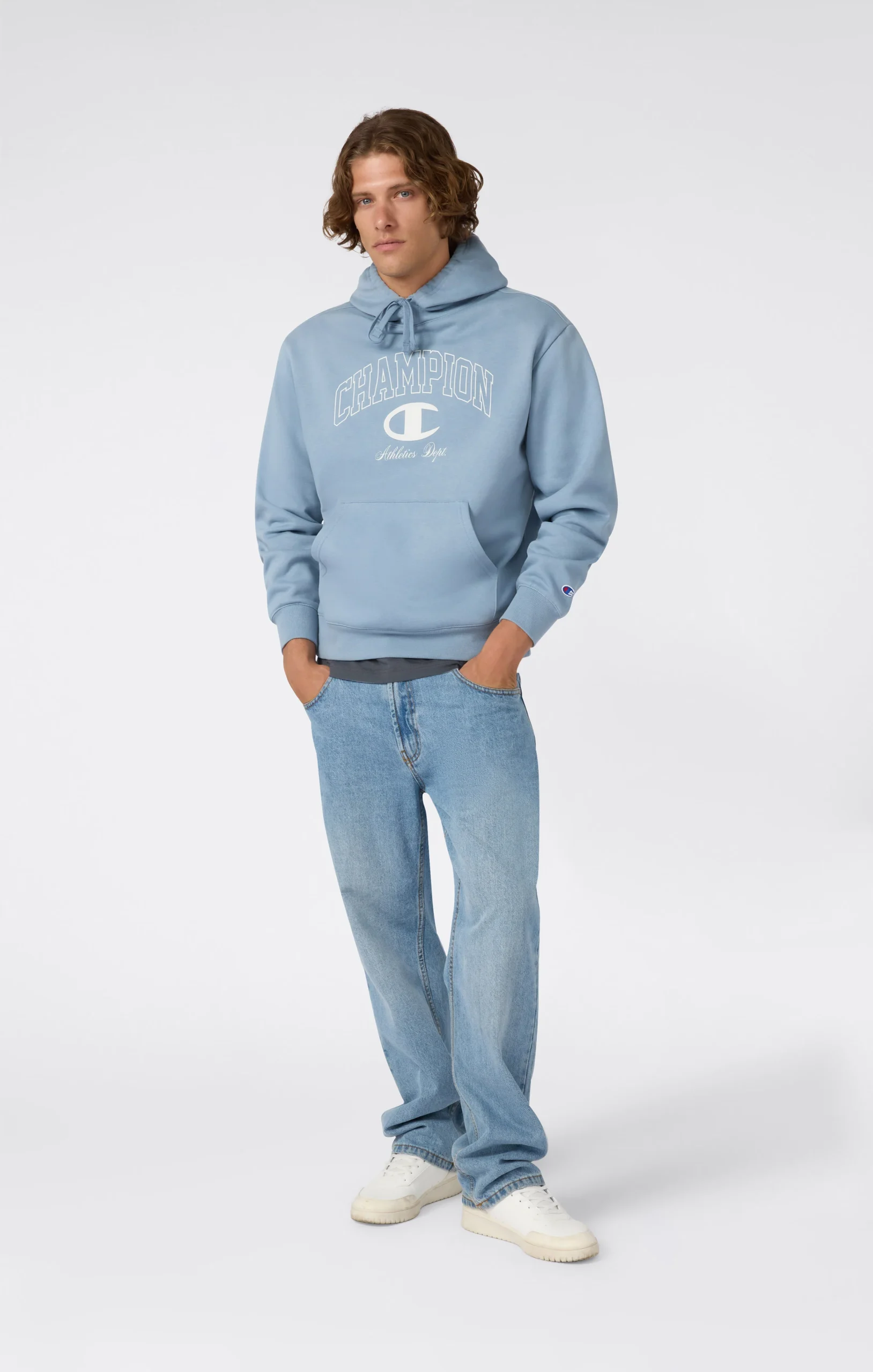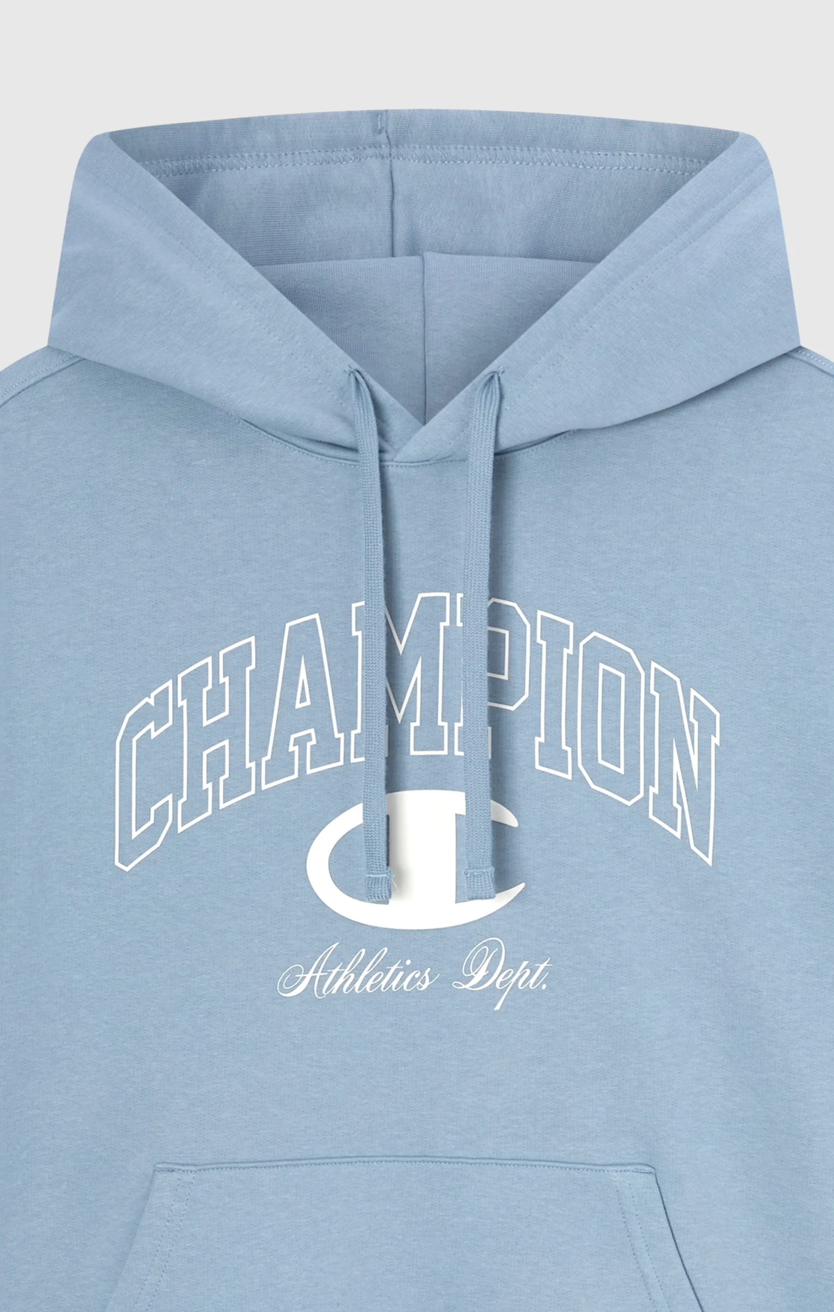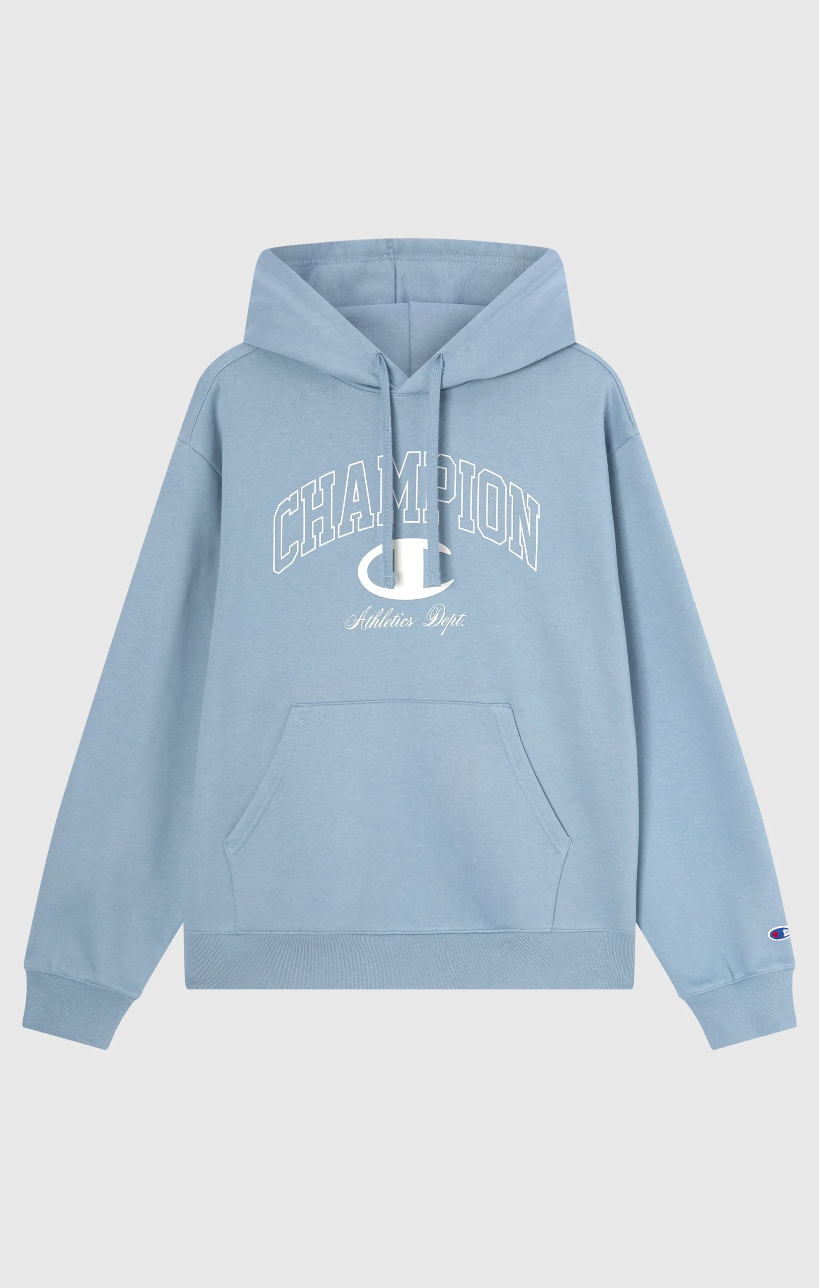 Inspired by American varsity style, this hoodie combines college aesthetics with a streetwear spirit. The CHAMPION puff print logo and “Athletic Dept.” embroidered detail enhance its bold, authentic identity. Made from 340 g/m² heavyweight fleece with brushed interior, it offers warmth and comfort all season long. Perfect for a contemporary look with deep roots in sports heritage.@@@Fabric: Heavyweight cotton-blend fleece, weight: 340 g/m² |Composition: 85% Cotton, 15% Polyester |Brushed interior |Embroidered Champion logo with arched lettering |Drawstring hood |Kangaroo pocket |Ribbed cuffs and hem |Fit: Relax Fit – Soft and comfortable fit, slightly loose on the chest, dropped shoulders, regular length.