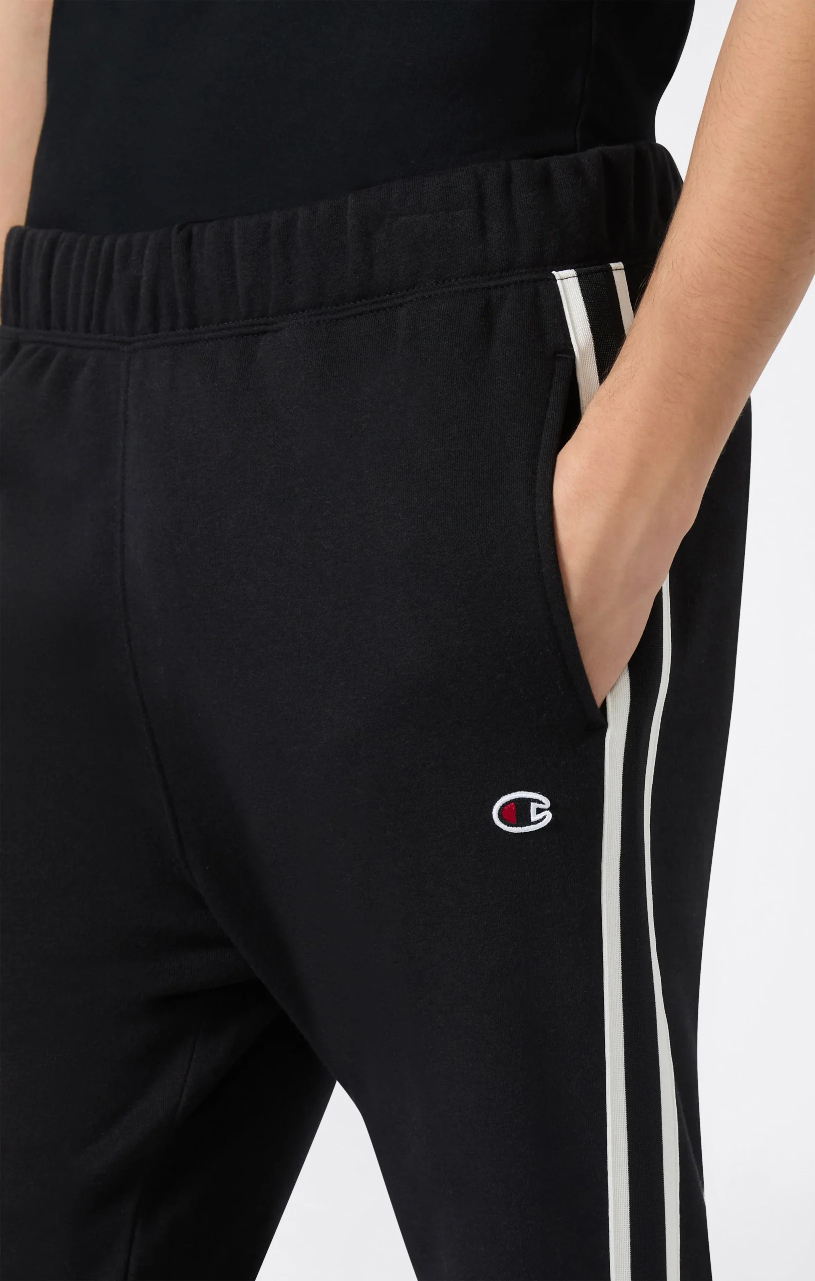 Inspired by American street sport culture, these pants combine comfort and urban style. Made from soft fleece with a brushed interior, they feature hidden front pockets for a clean, functional look. Shiny fabric inserts with contrast piping and knitted side bands add a technical and graphic touch.@@@Fabric: Compact and soft cotton-blend fleece with inserts |Composition: 70% cotton / 30% polyester, inserts 100% polyester |Weight: 280 g/m² (fleece) + 175 g/m² (inserts) |Black and white knitted band |Embroidered logo on the leg |Brushed interior |Front pockets |Fit: Standard Fit: Soft and comfortable
