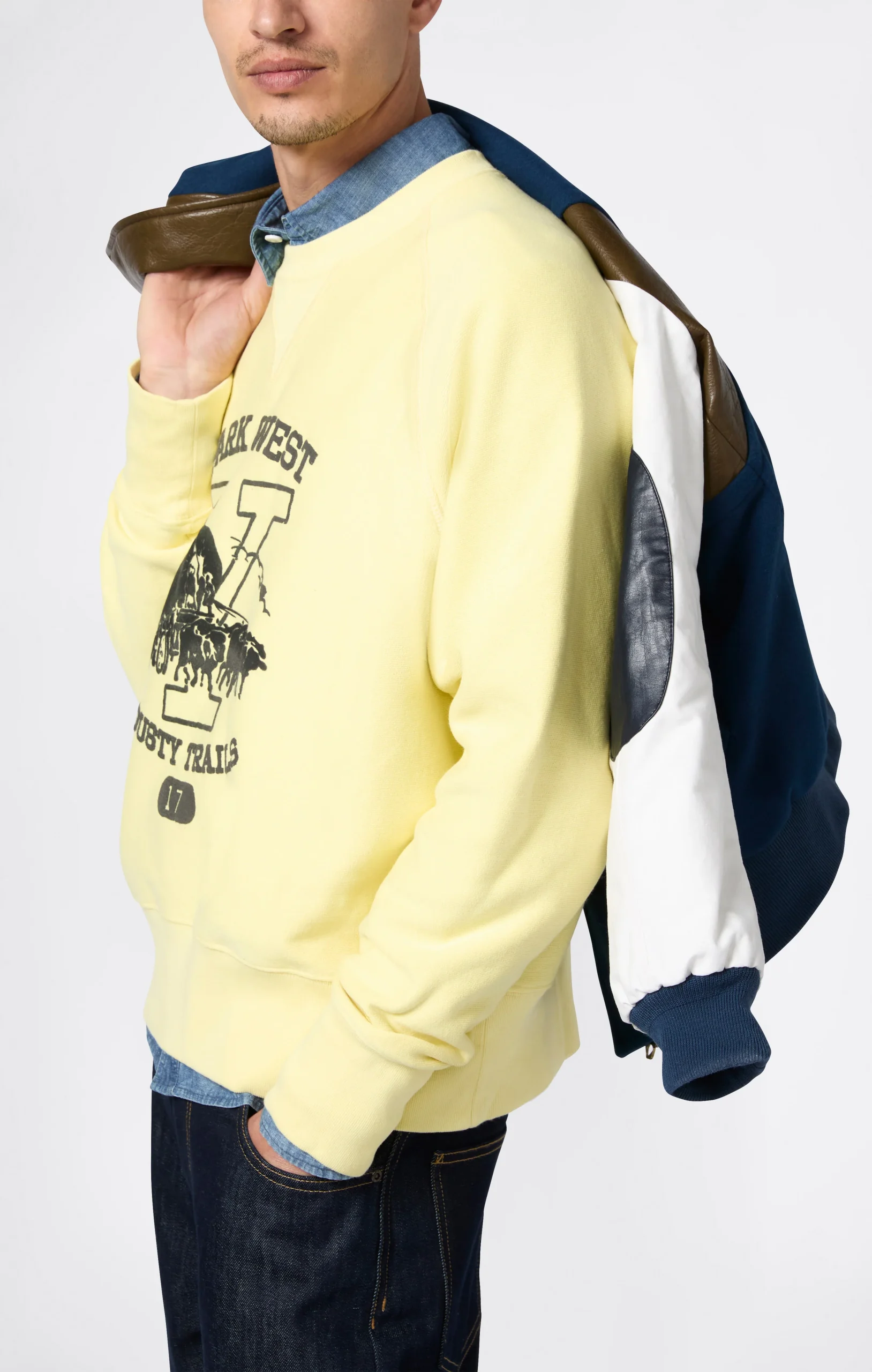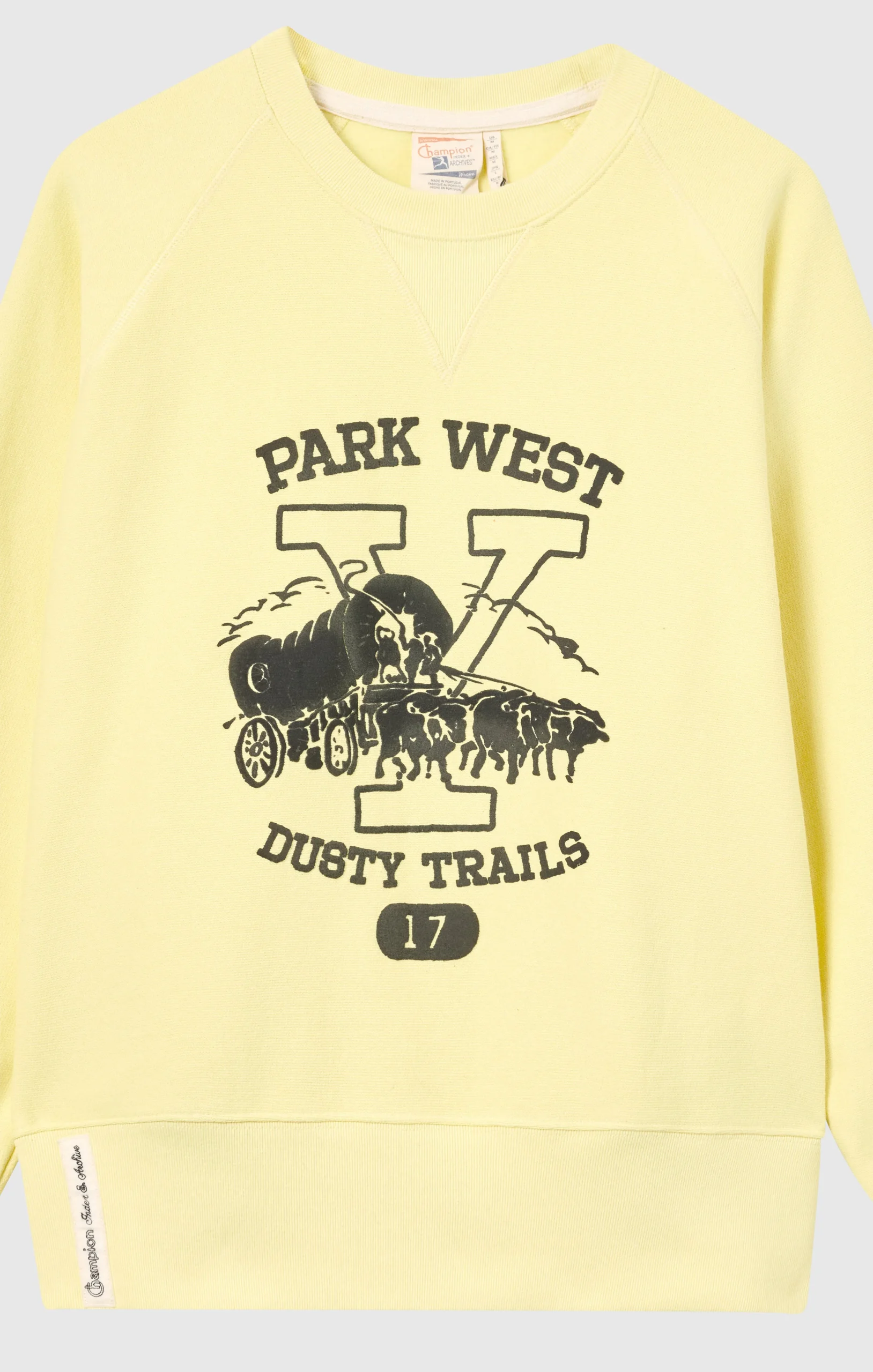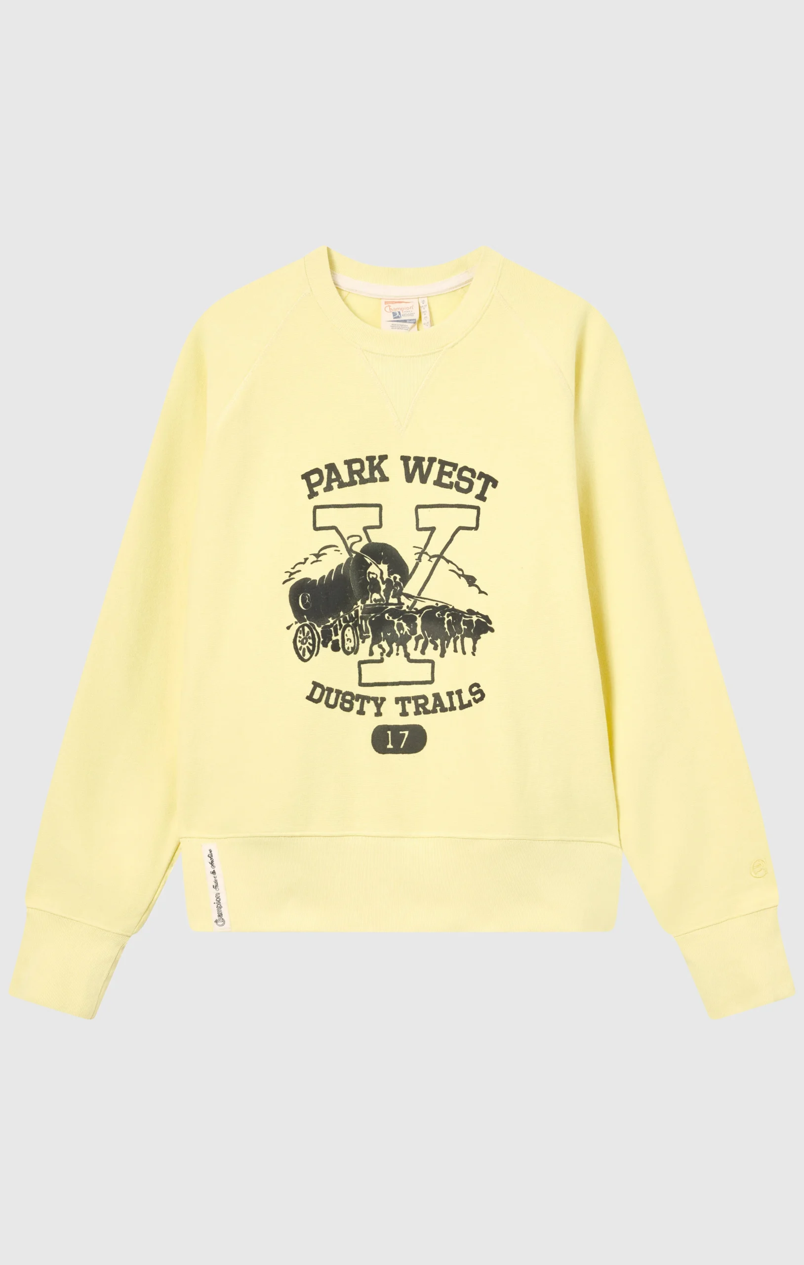 This crewneck sweatshirt is part of the Index & Archive collection, Sunset line, celebrating the timeless and authentic charm of New Mexico. Made from heavyweight Reverse Weave—Champion’s patented 1930s technology for long-lasting shape retention—it features an oversized fit, college-style graphic and twill patch label, blending sportswear heritage with a modern American twist.@@@Fabric: Reverse Weave Fleece, 430 g/m² |Composition: 90% Cotton, 10% Polyester |Brushed interior |Front print |Reverse Weave: patented shrink-resistant construction from the 1930s |Side-stitched twill label |Ribbed V-insert below the crewneck |Fit: Loose Customized – roomy fit with dropped shoulders, wide sleeves, and regular length