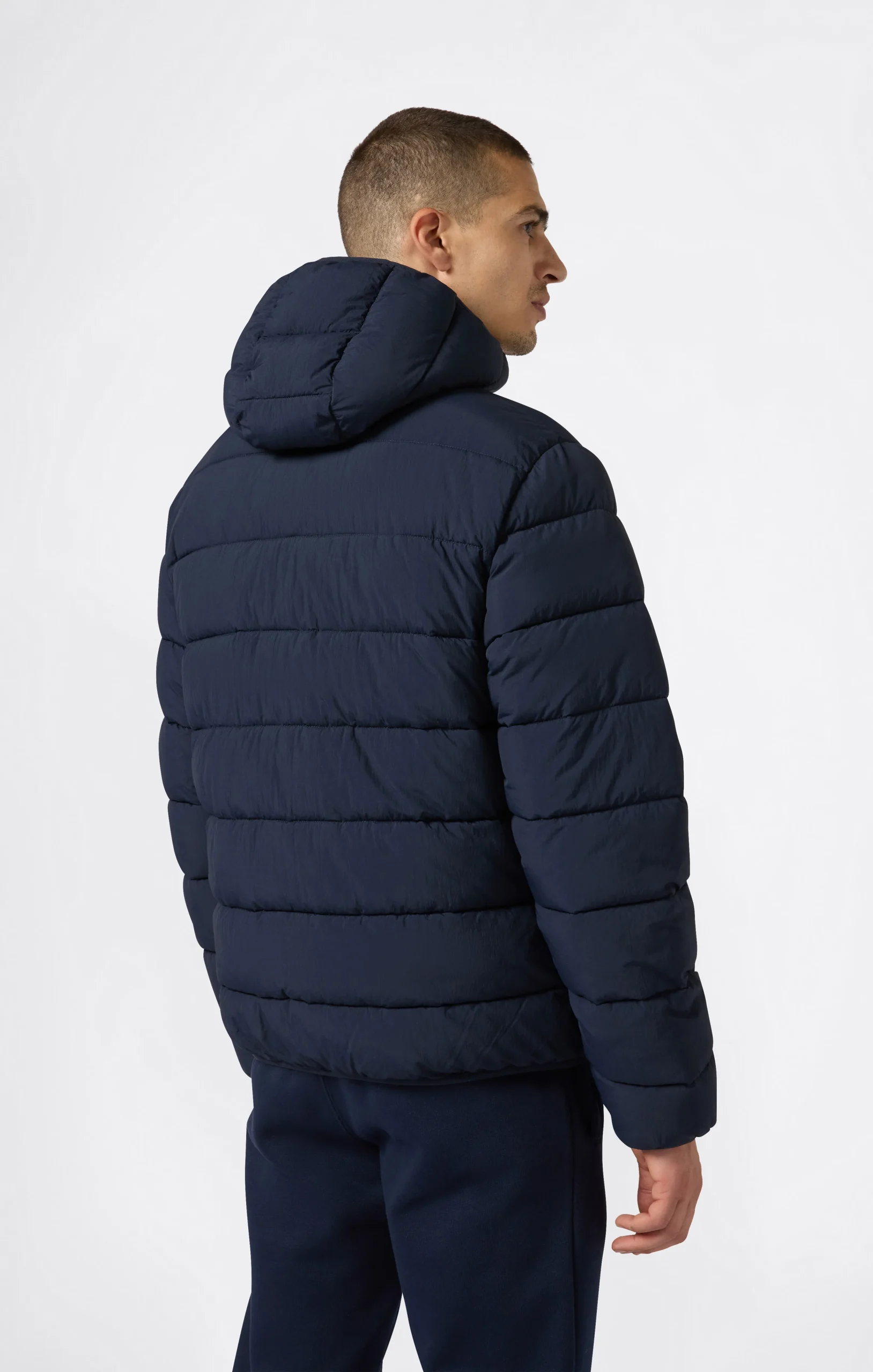 Clean and functional, this hooded padded jacket is ideal for tackling cold weather. The crinkle-effect nylon fabric with water-repellent treatment protects against the elements, while Repreve™ padding ensures warmth and environmental responsibility. Front pockets and a minimal design make it perfect for both urban and outdoor use.@@@Fabric: Woven Nylon, weight: 70 g/m² |Composition: 100% Polyamide |Front pockets |Water-repellent treatment |Repreve™ padding |Loose Fit: Wide fit, dropped shoulder, wide sleeve, regular length