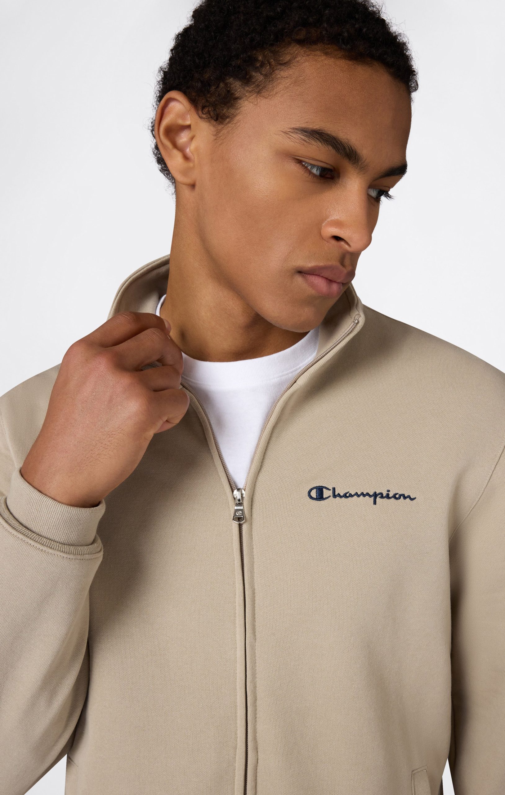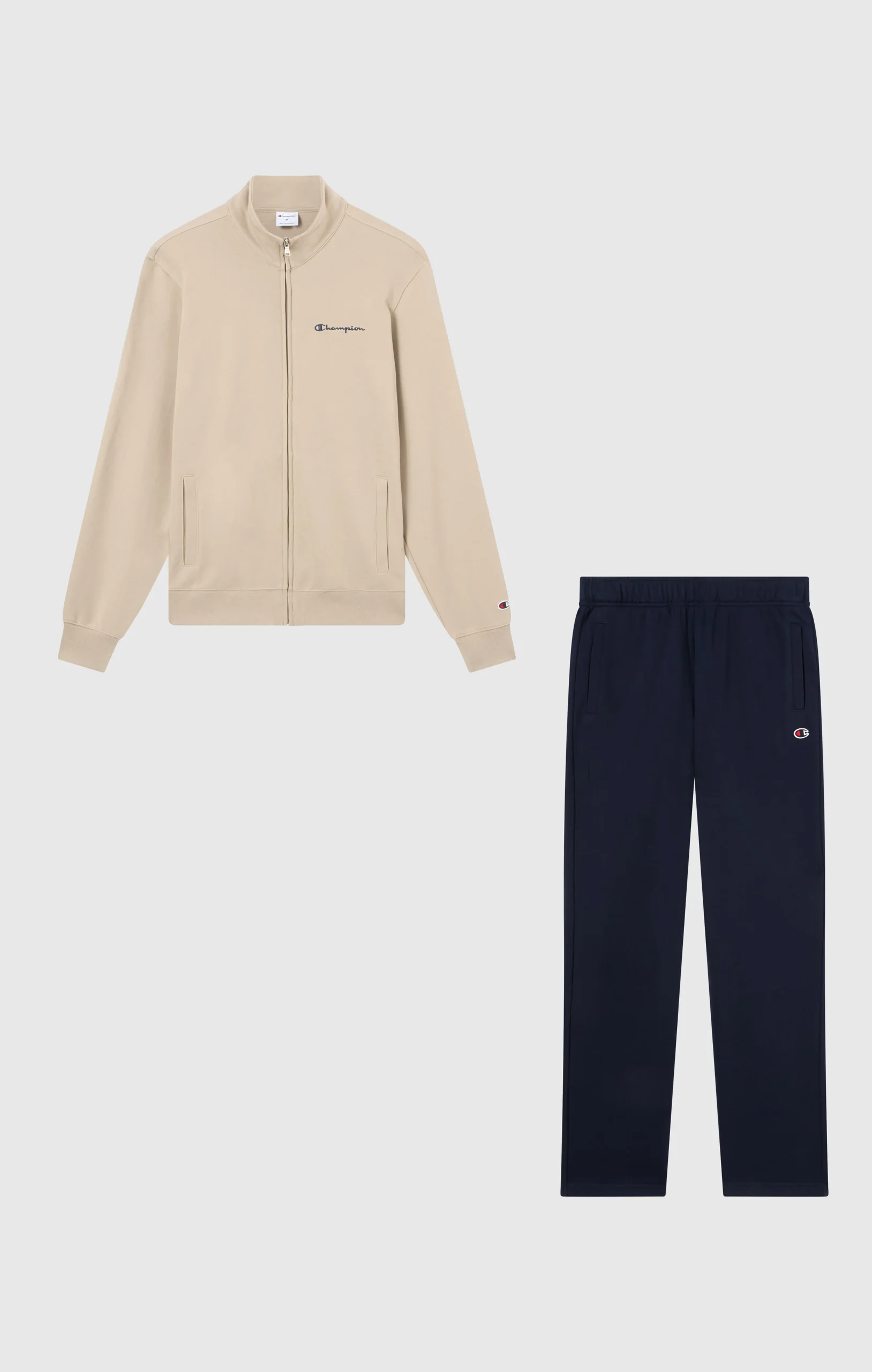Men’s lightweight full zip tracksuit designed with a clean and functional look, ideal for everyday wear and leisure time. Made from lightweight Basic Terry, it delivers comfort and practicality without added bulk, making it perfect for mid-season use. The full zip sweatshirt ensures easy wear and adjustable comfort, while the matching pants complete the outfit with a sporty, streamlined style. The Champion logo adds an iconic touch inspired by the brand’s authentic heritage.@@@Standard Fit, regular and comfortable |Lightweight Basic Terry fabric |Unbrushed interior |Composition: 55% Cotton, 45% Polyester |Weight: 280 g/m² |Full zip sweatshirt with front closure |High collar for added coverage |Pants with elastic waistband and adjustable drawstring |Side pockets on sweatshirt and pants |Printed Champion logo