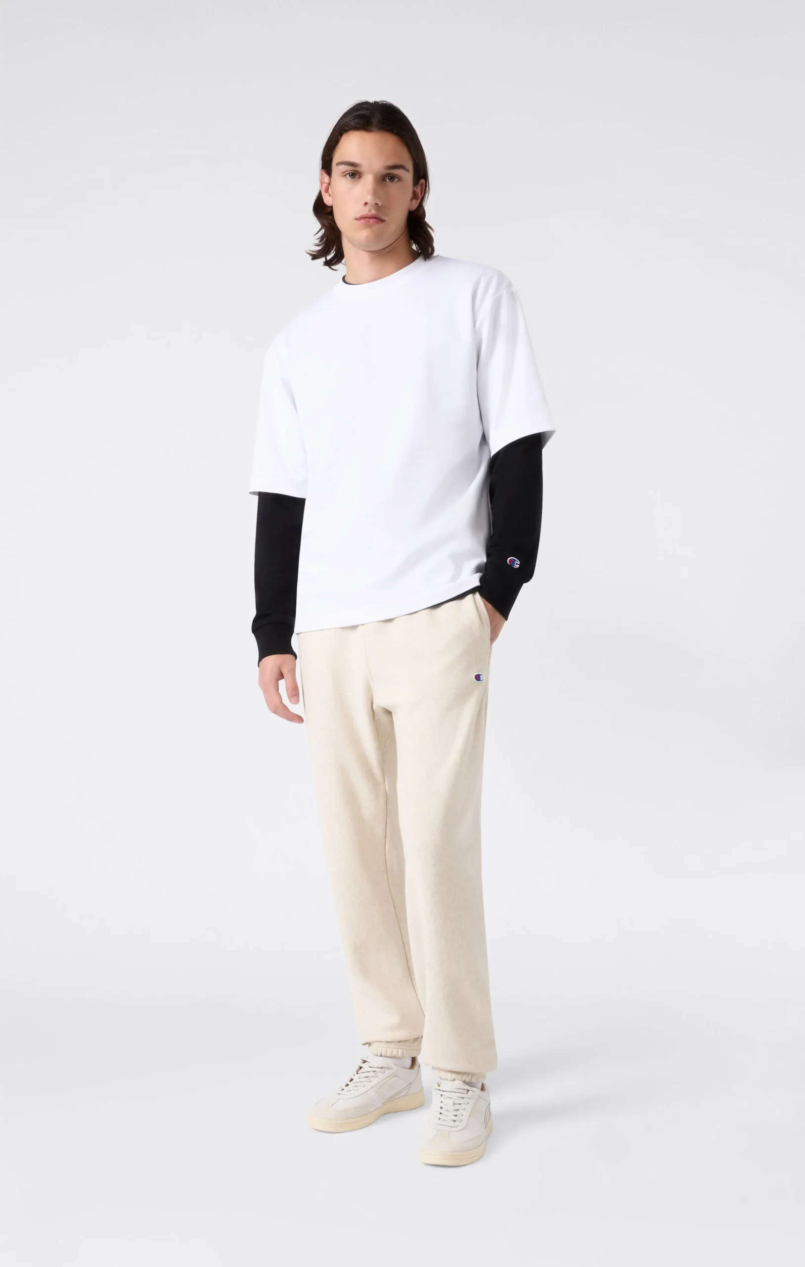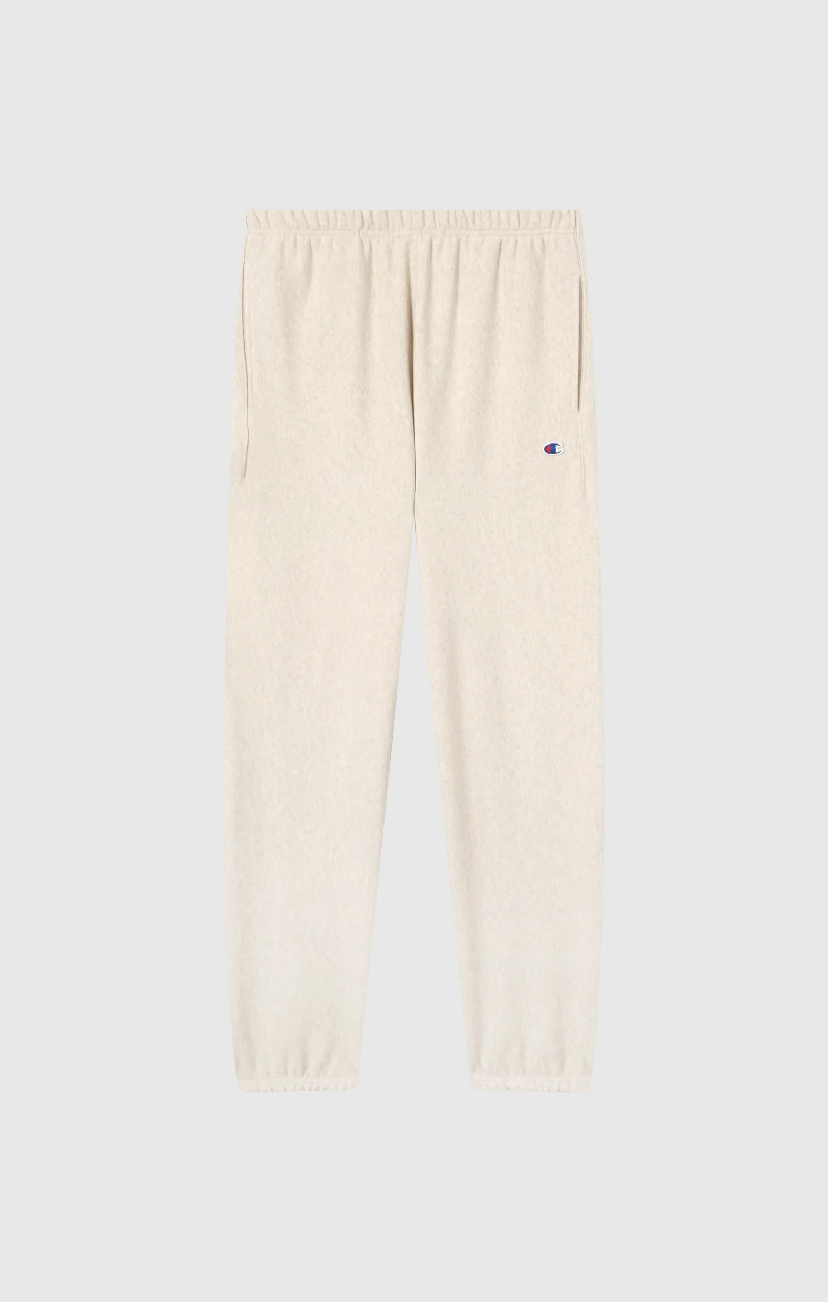 Designed to offer timeless comfort and style, these elastic-cuff pants are part of Champion’s historic Reverse Weave line. Made from 400 g/m² terry fabric with an unbrushed interior, they provide durability, breathability and lasting comfort, making them ideal for mild temperatures and transitional seasons. The exclusive Reverse Weave construction, patented in 1934, is engineered to reduce shrinkage and maintain the original shape wash after wash. The standard fit ensures freedom of movement and a clean, contemporary look, while the back pocket adds a practical touch to the brand’s iconic design.@@@Fabric: Soft Reverse Terry Solid Colors 400 g/m² |Composition: 82% Cotton, 18% Polyester |Unbrushed Terry fabric |Reverse Weave fabric: designed to resist shrinkage and maintain its shape |Elastic cuffed hems |Applied back pocket |Embroidered C patch |Standard Fit: versatile and comfortable fit with standard widths and lengths.