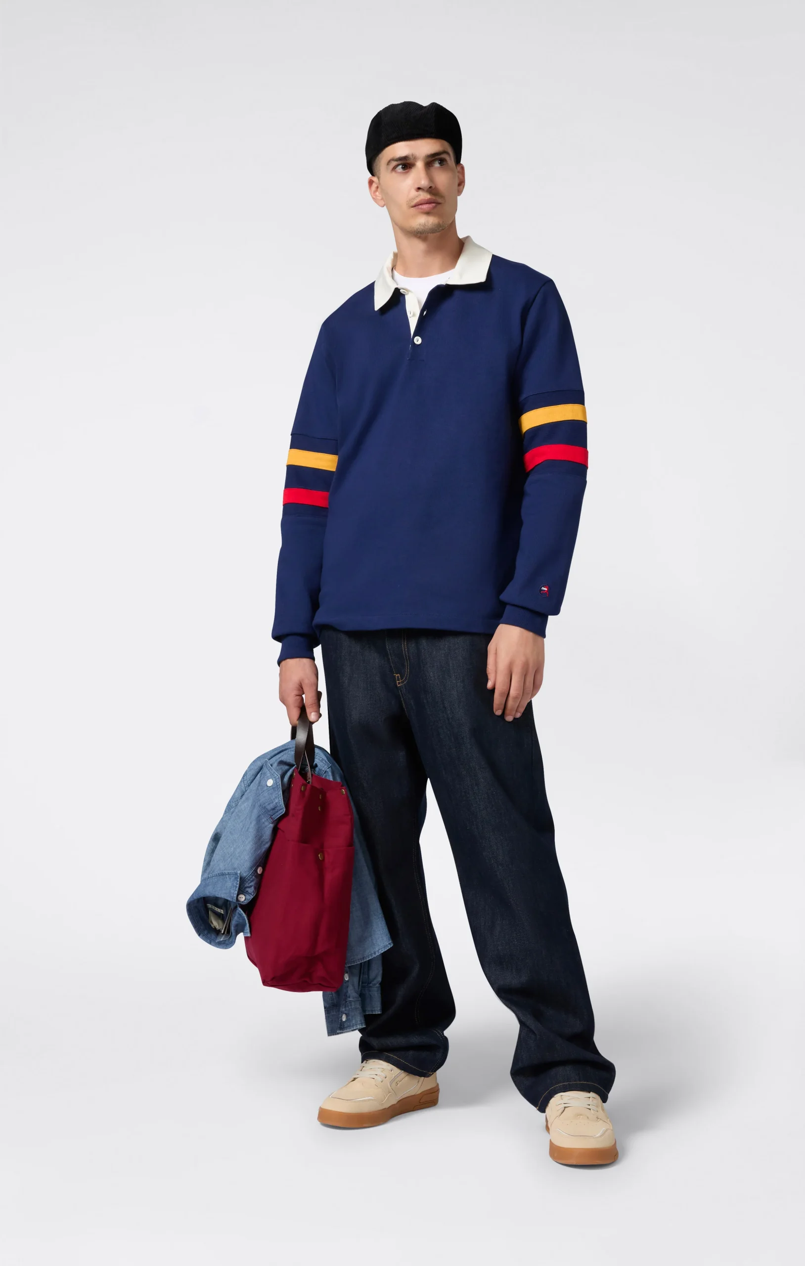 This long-sleeve polo in heavy jersey is part of the Island Trees capsule by Index & Archives, reinterpreting American sportswear with a Caribbean twist from the ’70s–’80s. The contrast white collar, three-button placket, and colorful sleeve stripes echo vintage rugby uniforms, updated with a relaxed fit and premium materials. A piece that blends sporty character and heritage appeal.@@@Fabric: Heavy Jersey 440 g/m² |Composition: 100% Cotton |White piqué collar |Three-button placket |Contrast stripes on sleeves |Ribbed cuffs |Fit: Loose Customized, loose fit with dropped shoulders, wide sleeves and regular length