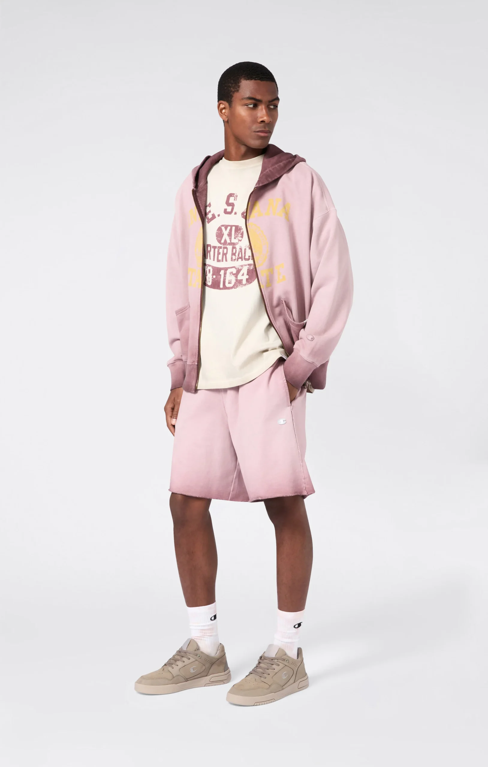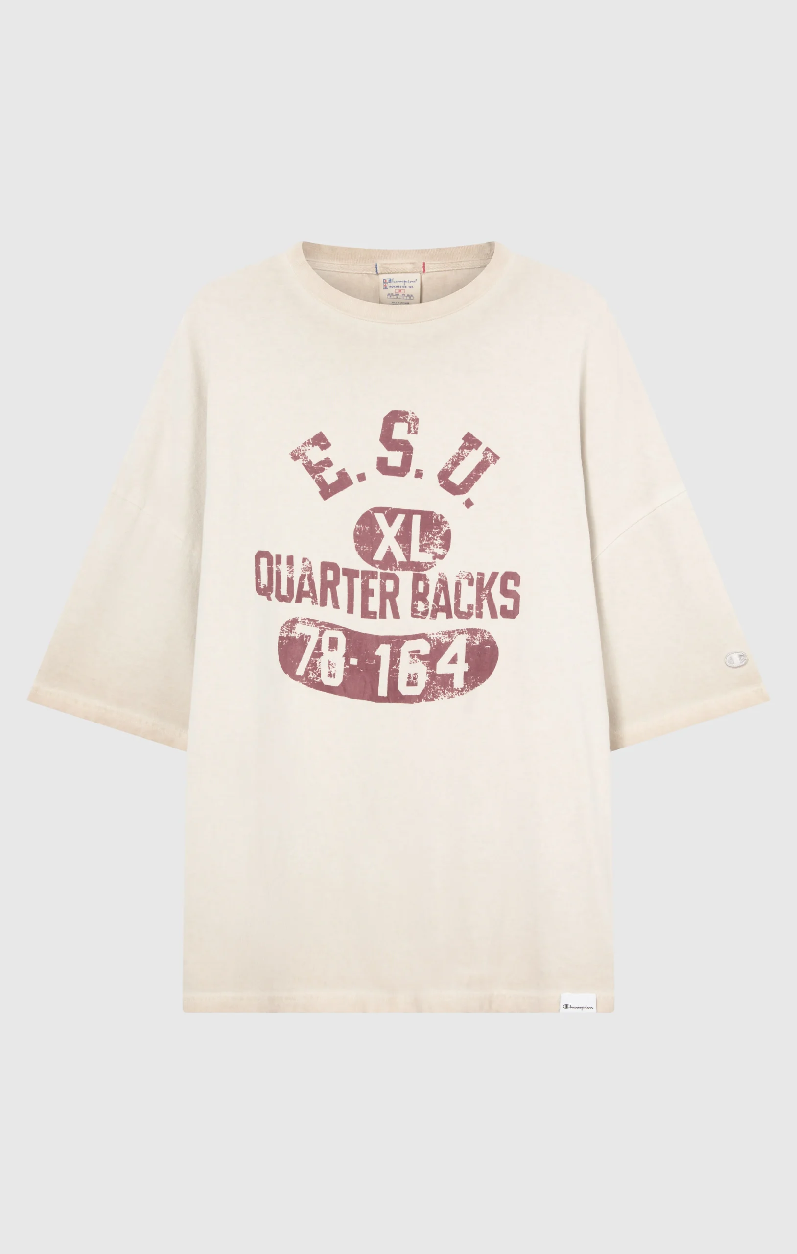 A tribute to the spirit of old American college style, this men’s oversized t-shirt from the Time Capsule line blends vintage aesthetics with modern quality. The heavy pure cotton jersey is treated with Luna Dye wash for an authentic faded effect, while the flock graphic comes from Champion’s original archives. The loose fit and dropped shoulders complete a staple piece for those who love heritage with a contemporary twist.@@@Fabric: Heavyweight jersey – 250 g/m² |Composition: 100% Cotton |Luna Dye wash with faded effect |Archive flock graphic in college style |Ribbed collar |Wide sleeves with dropped shoulders |Tone-on-tone embroidered logo on sleeve |Fit: Loose Fit – oversized, with wide cut and dropped shoulder for a relaxed and authentic style