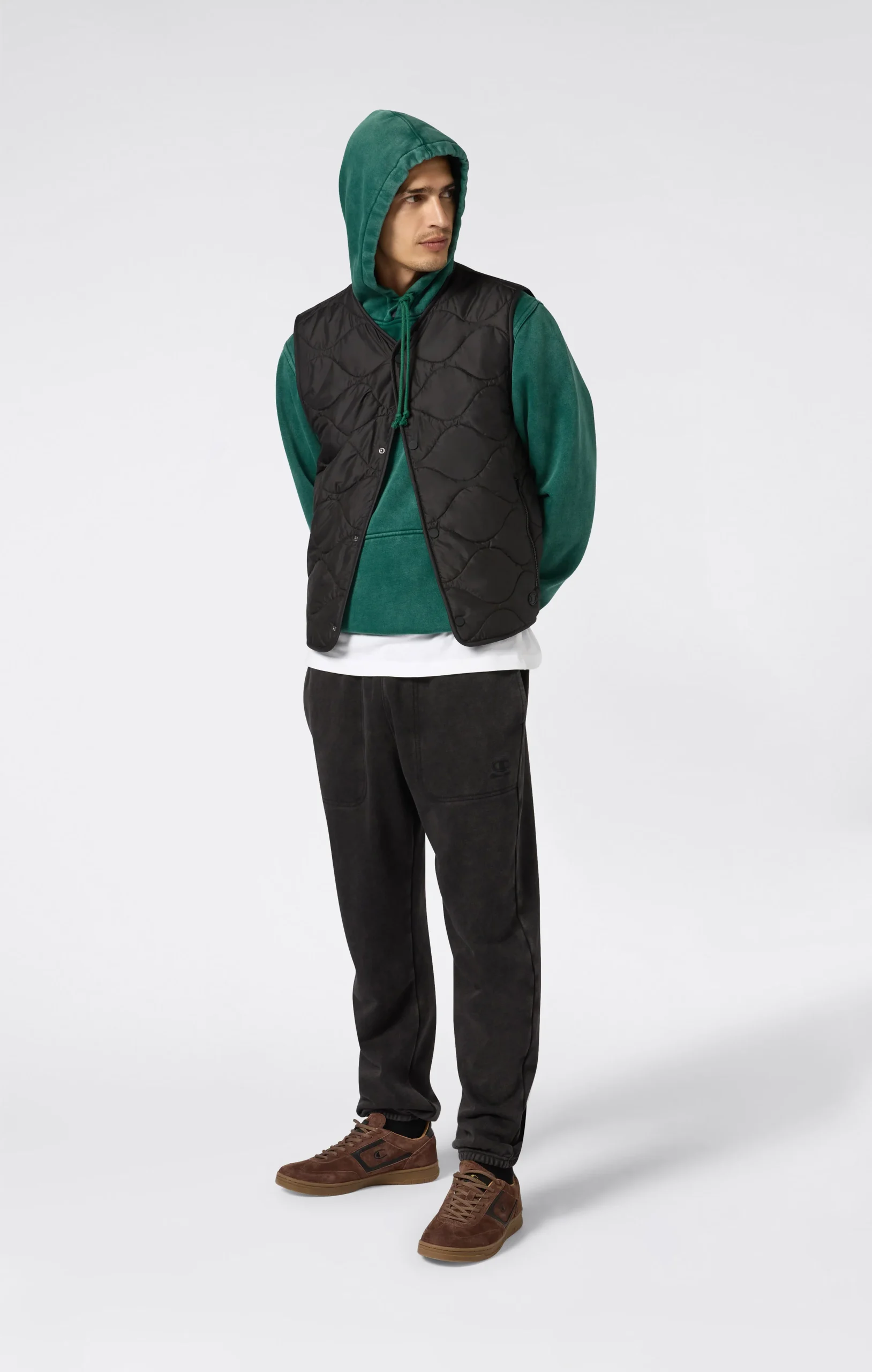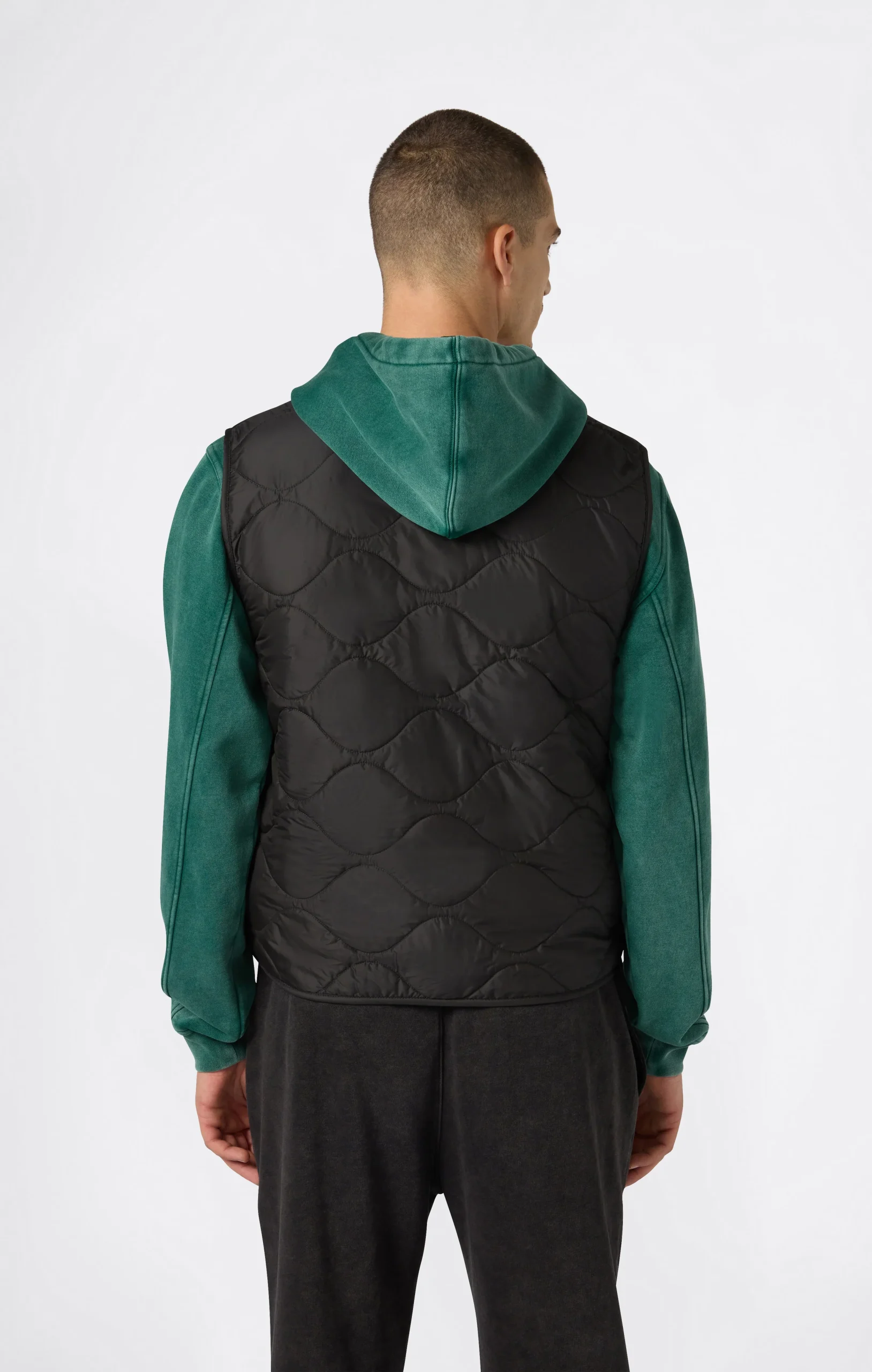 This padded vest is perfect for adding an extra layer during cooler months. Made from technical polyester with graphic quilting, it’s lightweight yet functional, thanks to the 60 g Repreve padding that provides thermal comfort while respecting the environment. It features a snap button front closure and zip pockets for maximum practicality on the go.@@@Fabric: Ciré Woven Poly, weight: 39 g/m² |Composition: 100% Polyester |Padding: Repreve (60 g) |Graphic quilting |Snap button closure |Side zip pockets |Sleeveless |Fit: Standard Fit: Versatile and comfortable fit with standard widths and lengths. Close to the body, it has simple lines that do not cling to the shape. Regular shoulder cut.