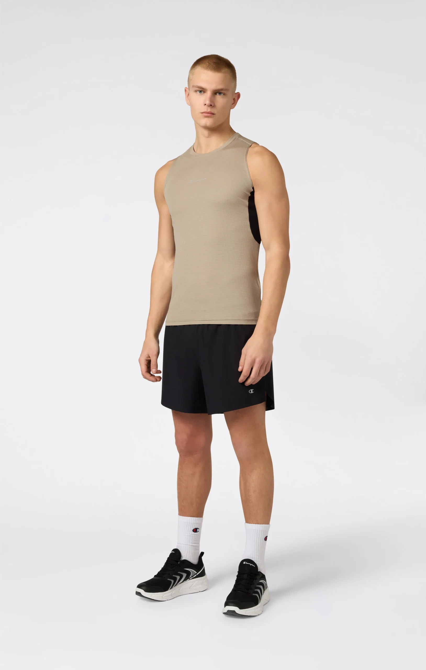 Essential and functional, this men’s athletic tank top is rooted in Champion’s heritage of everyday training. The technical mesh fabric with Quick Dry technology promotes fast drying during physical activity, helping maintain comfort and lightness even during intense workouts. The grid mesh structure and side panels support breathability, while the Athletic Fit follows the body’s natural movements.@@@Athletic Fit – close to the body without being tight, follows the natural lines while maintaining comfort |Composition: 100% Polyester |Technology: Quick Dry – promotes fast drying |Fabric: Refine Grid Poly Mesh |Weight: 100 g/m² |Grid-textured mesh structure |Side mesh panels for targeted breathability |Sleeveless design for maximum freedom of movement |Crew neck |Champion logo printed on the chest |Ideal for training and everyday athletic activity