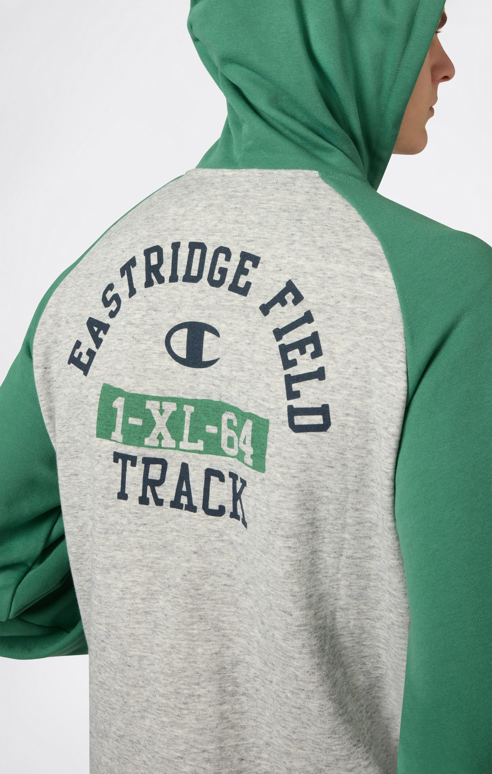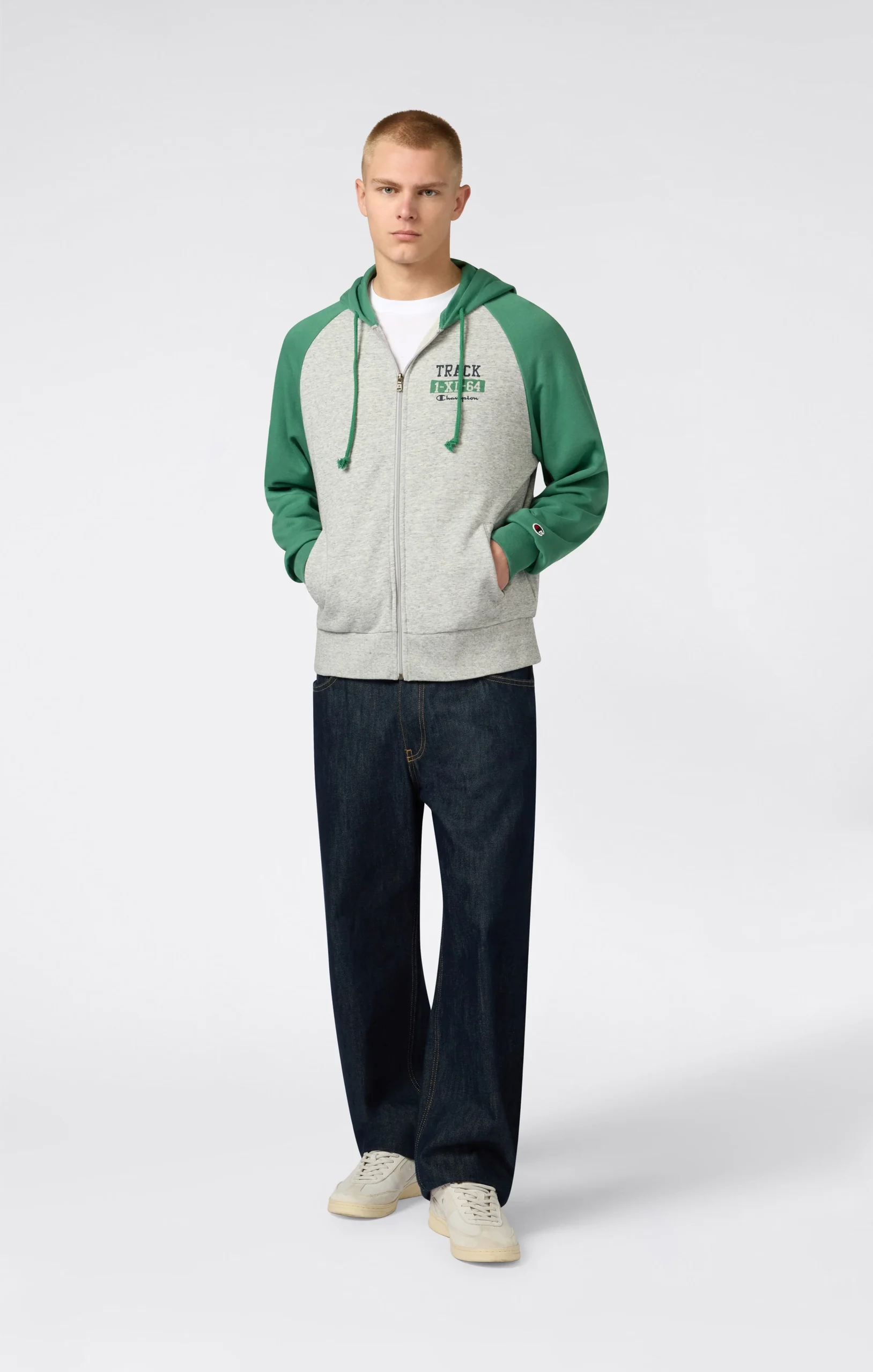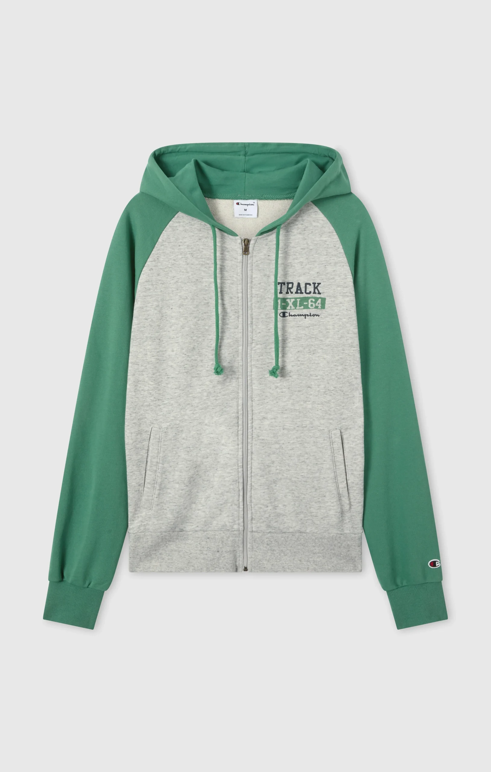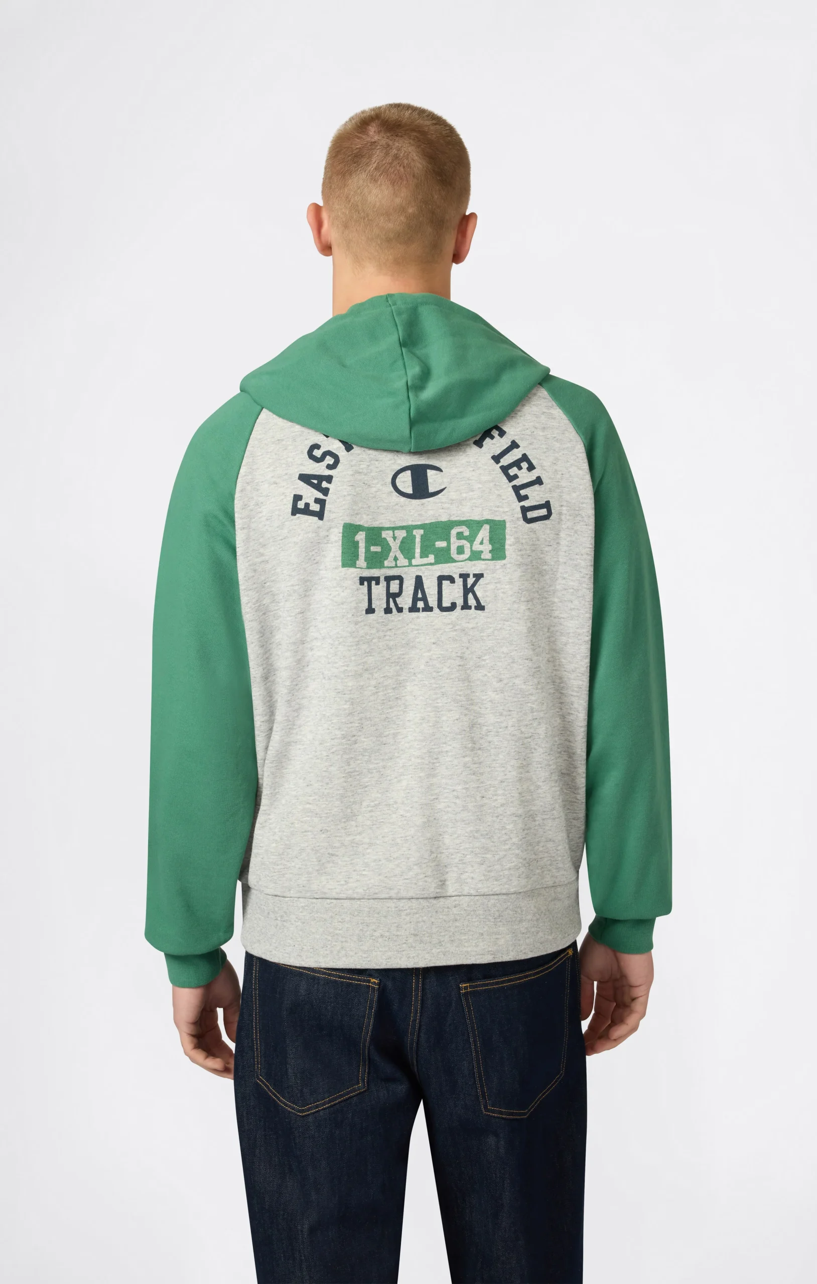 This men’s full zip hooded sweatshirt is made from compact Terry fabric, designed to provide comfort and structure for everyday wear. Inspired by Champion’s collegiate sportswear aesthetic, it features raglan construction and track & field–inspired graphics. The garment wash treatment gives the sweatshirt a slightly worn-in, authentic look, while the Relax Fit offers a soft, easy silhouette.@@@Relax Fit, soft and slightly loose |Made from compact Terry fabric |Composition: 70% Cotton, 30% Polyester |Weight: 340 g/m² |Unbrushed interior |Adjustable hood with drawstring |Full zip closure |Front pockets |Printed graphics on chest and back |Champion logo applied on the sleeve